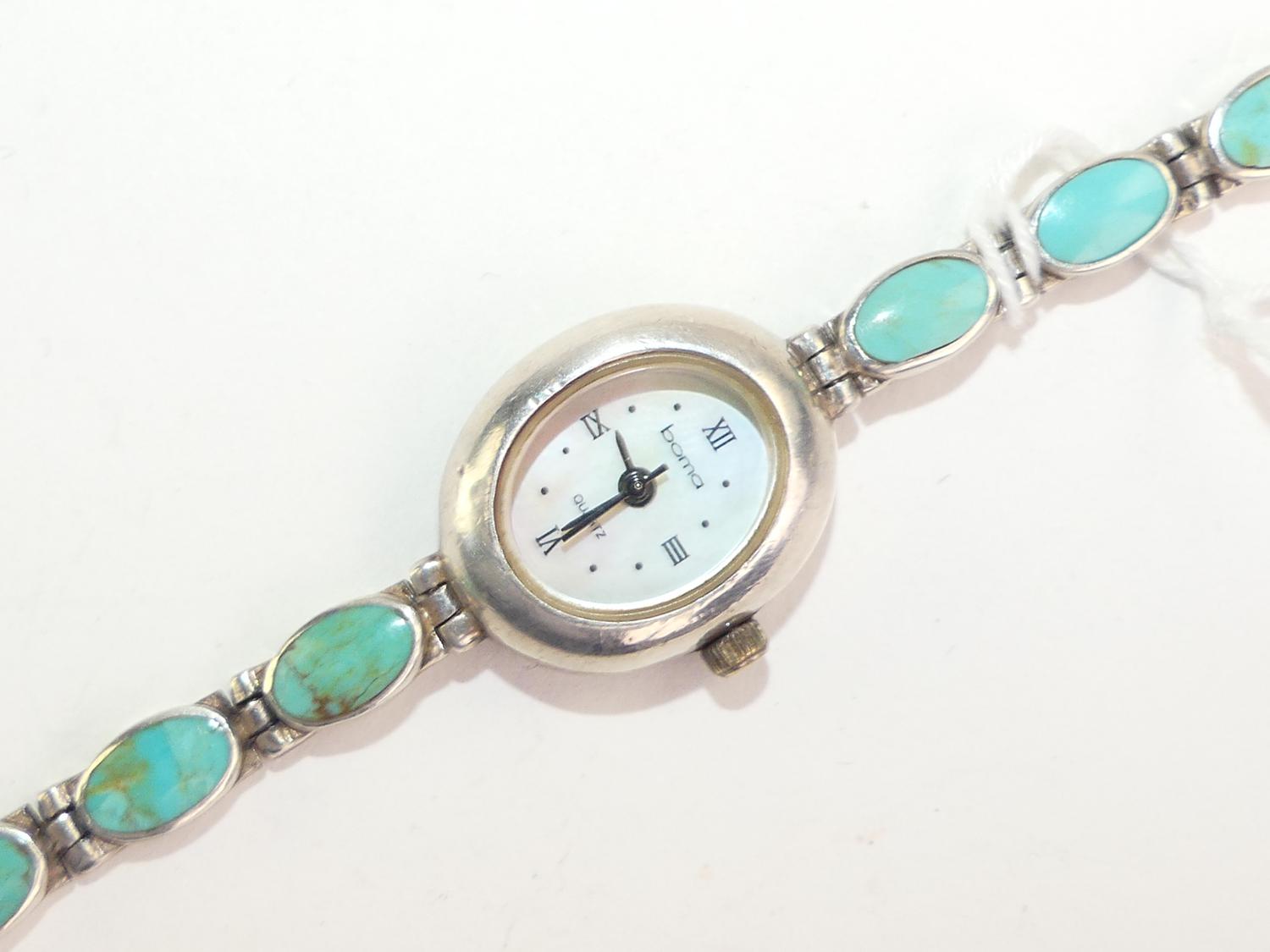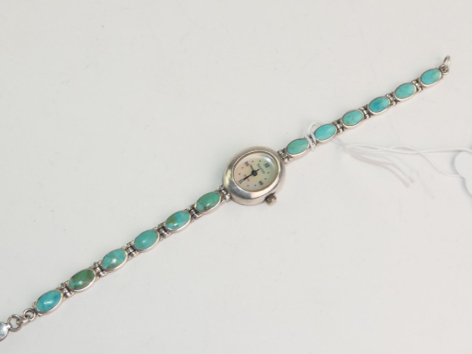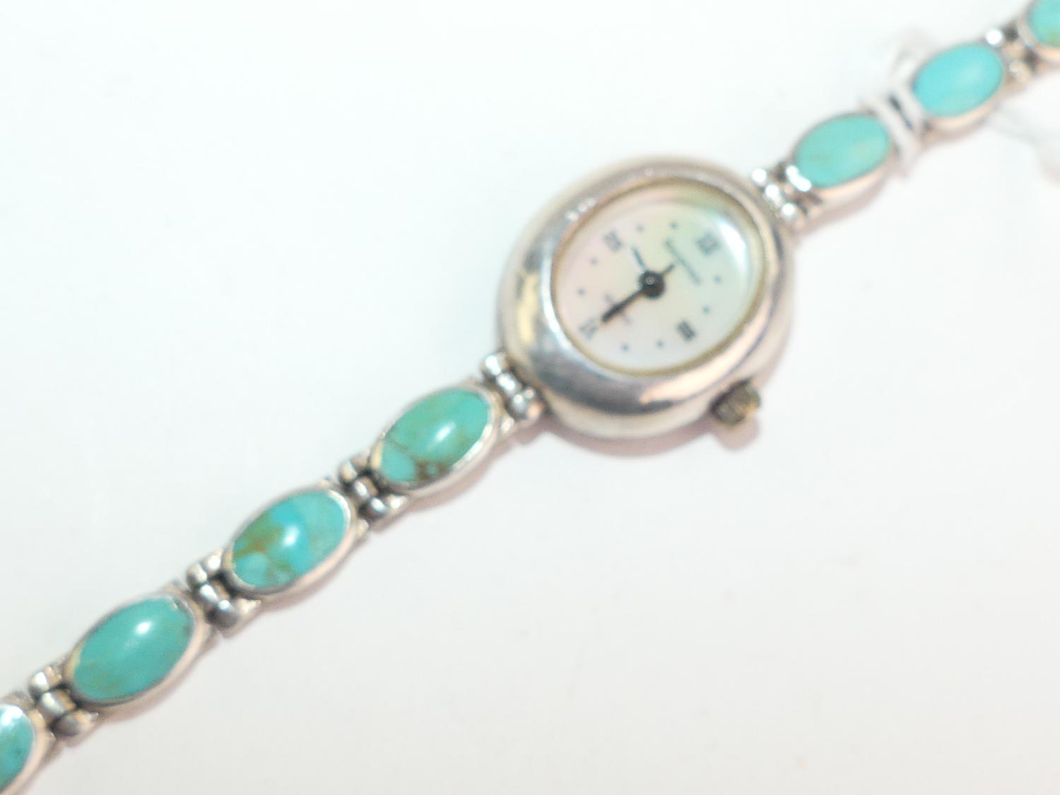 sterling silver turquoise mounted ladies wrist watch, length 7"