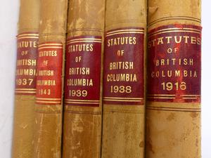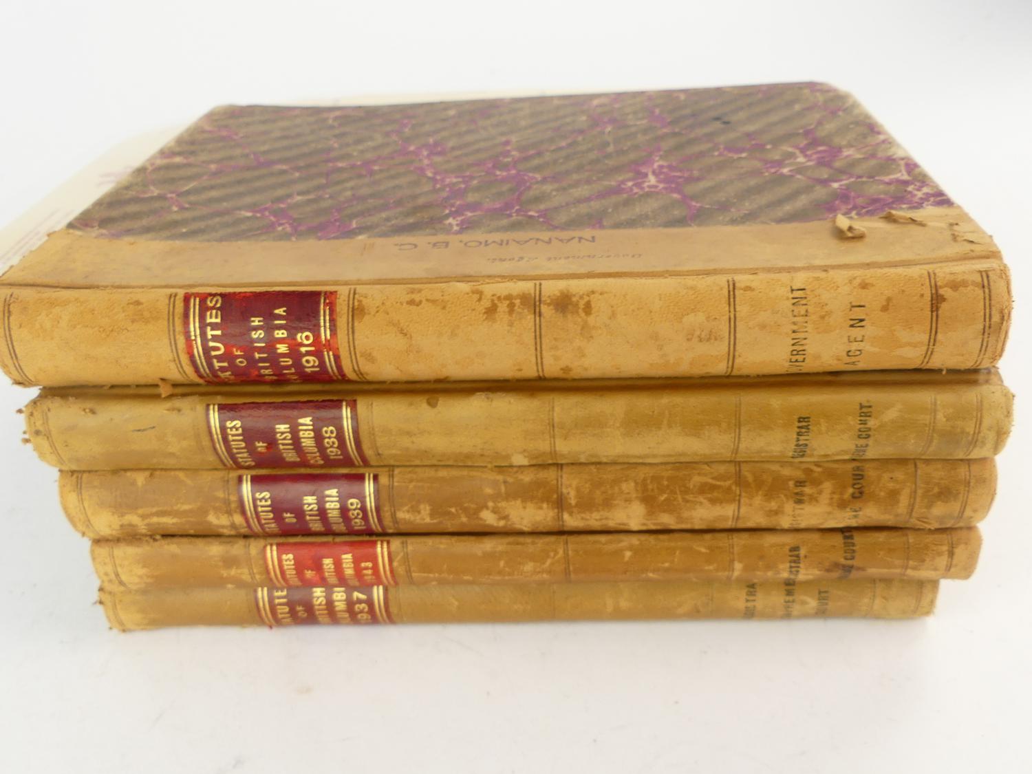 antique leather bound "statutes of british columbia"- 5 vols with a letter of land writ