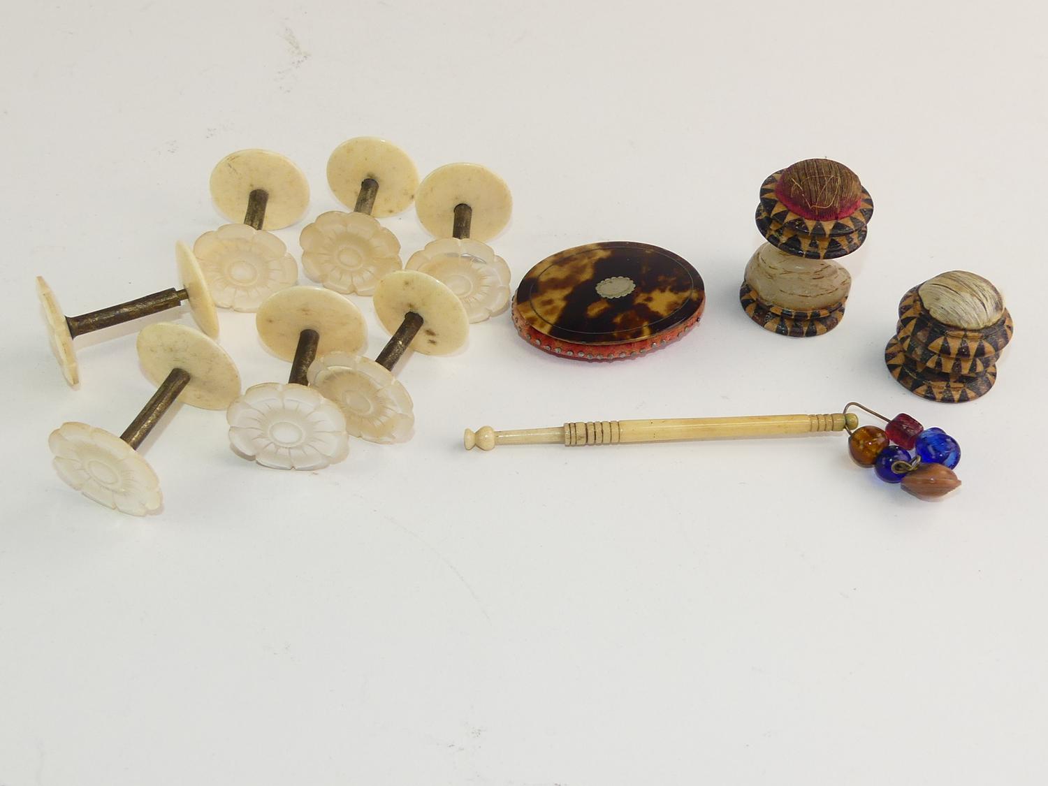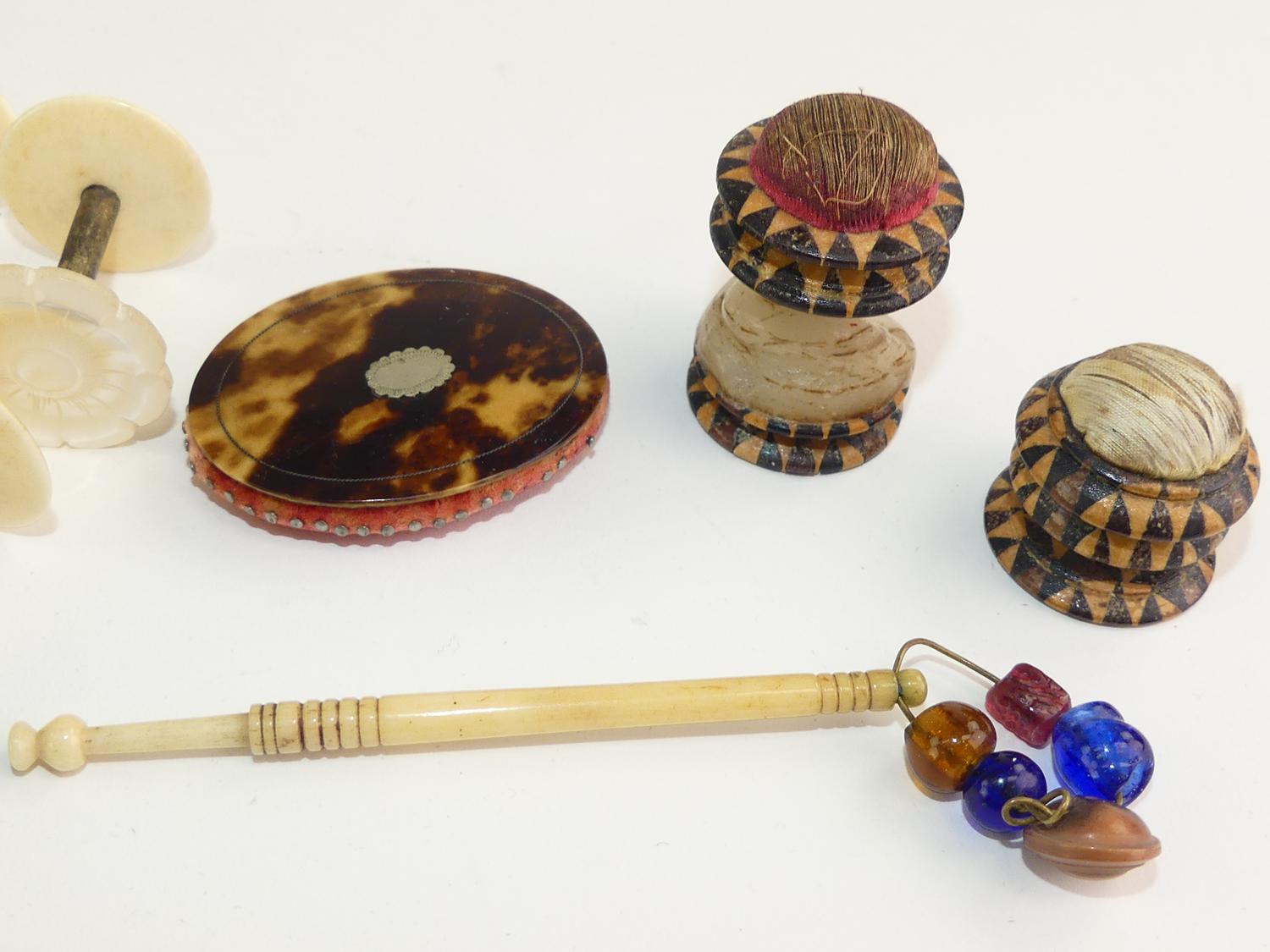 lot of 19th century mother of pearl, tortoise shell and inllaid sewing items