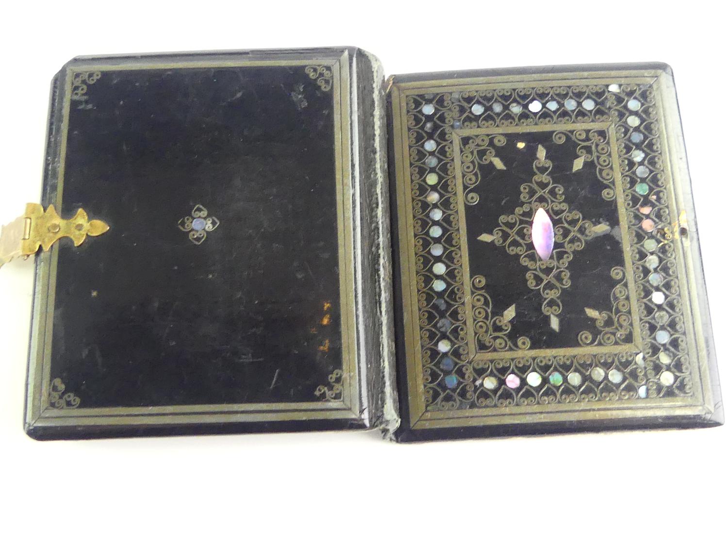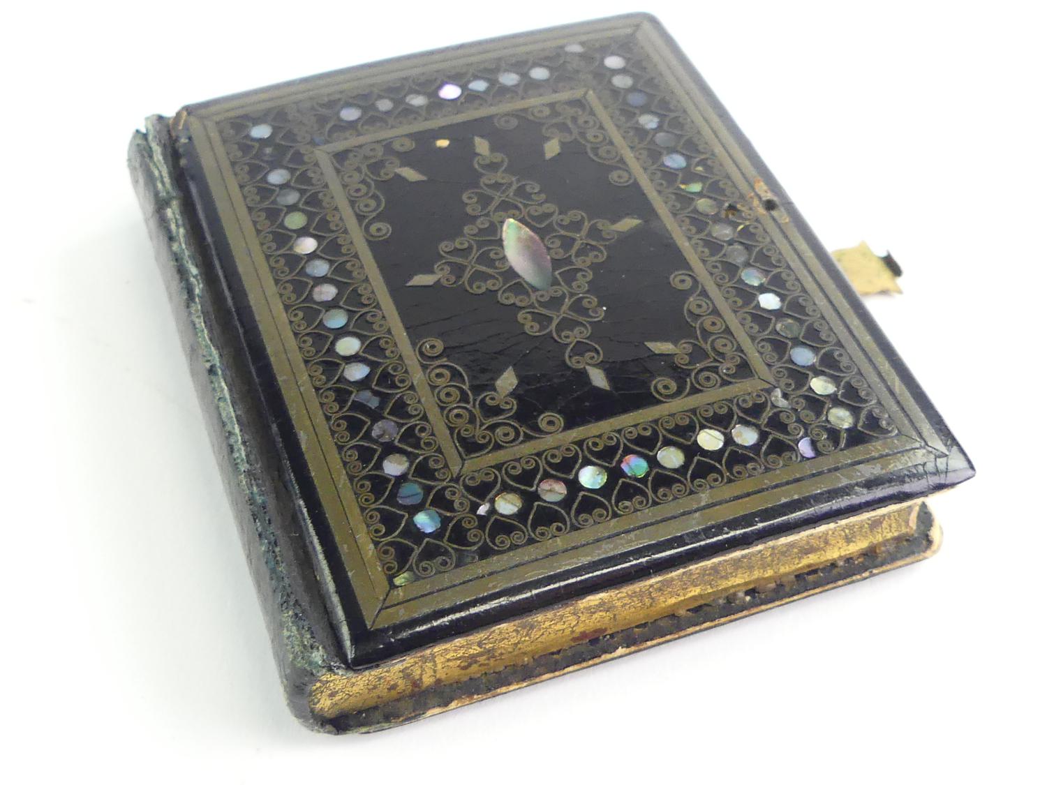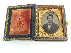 mid 19th century inlaid papier mache daguerreotype case with photo of a young gentleman, 3 1/4" x 2 3/4"