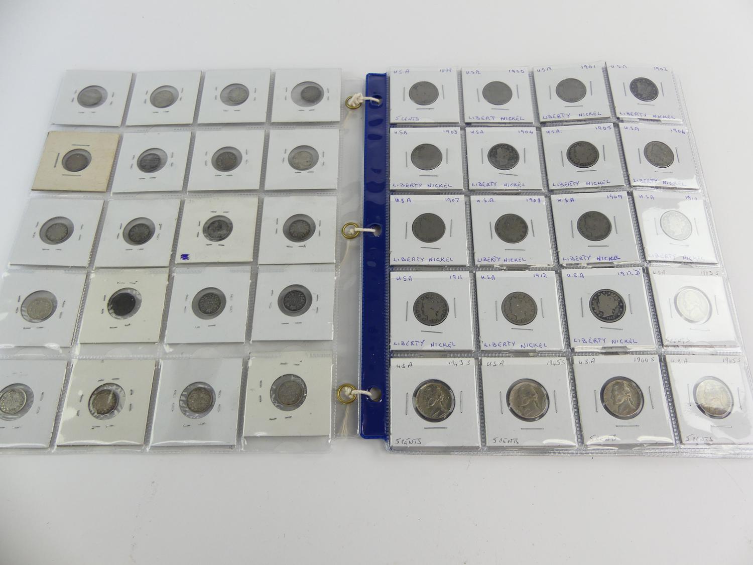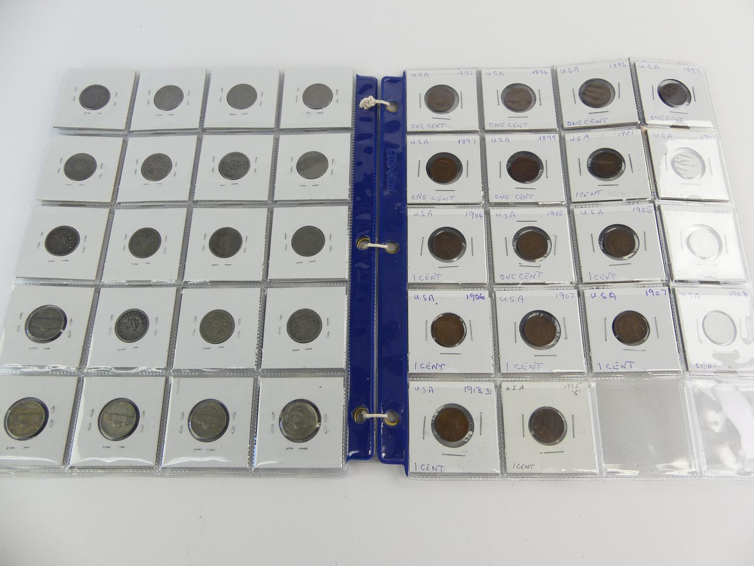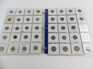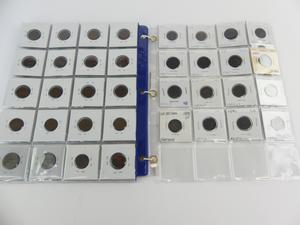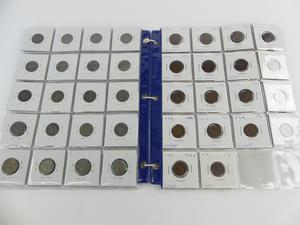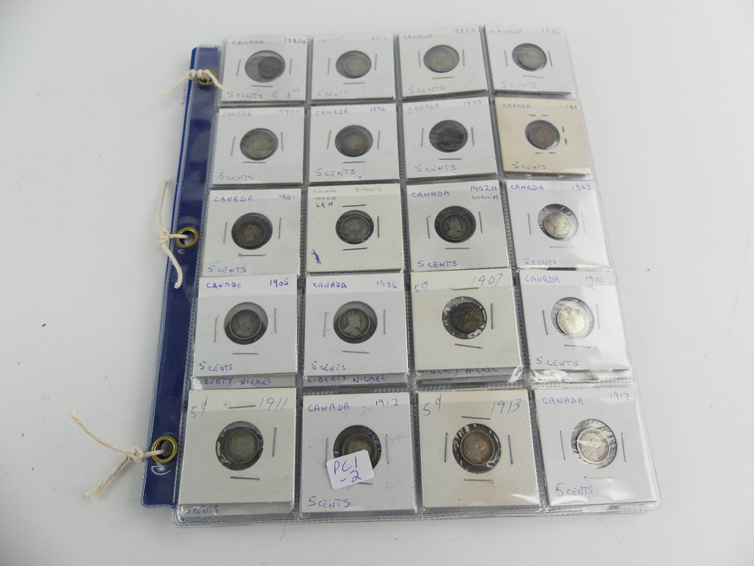 lot of coins: 20 early canadian 5 cent coins, 20 american 5 cent coins, 18 early american pennies, 16 british farthings