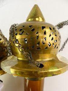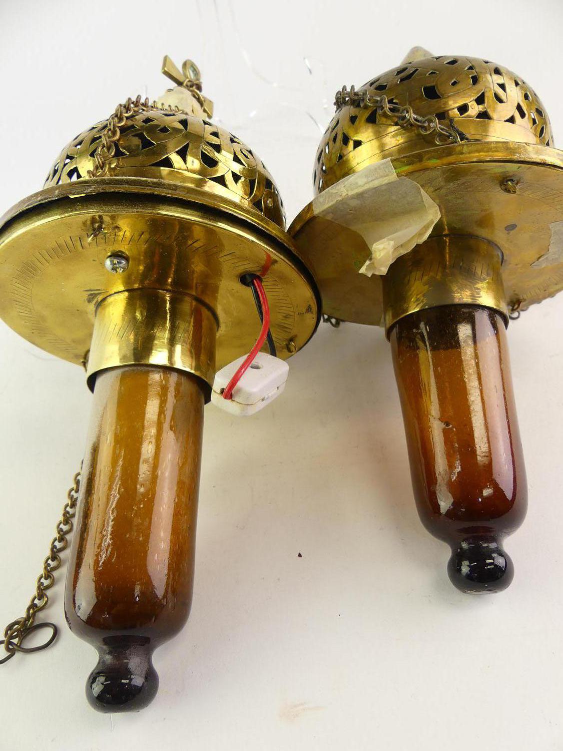 pair of middle eastern hanging brass and glass lamps, ht. 13"