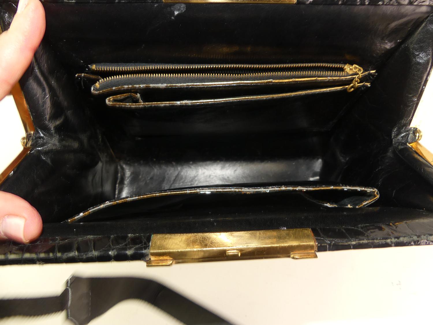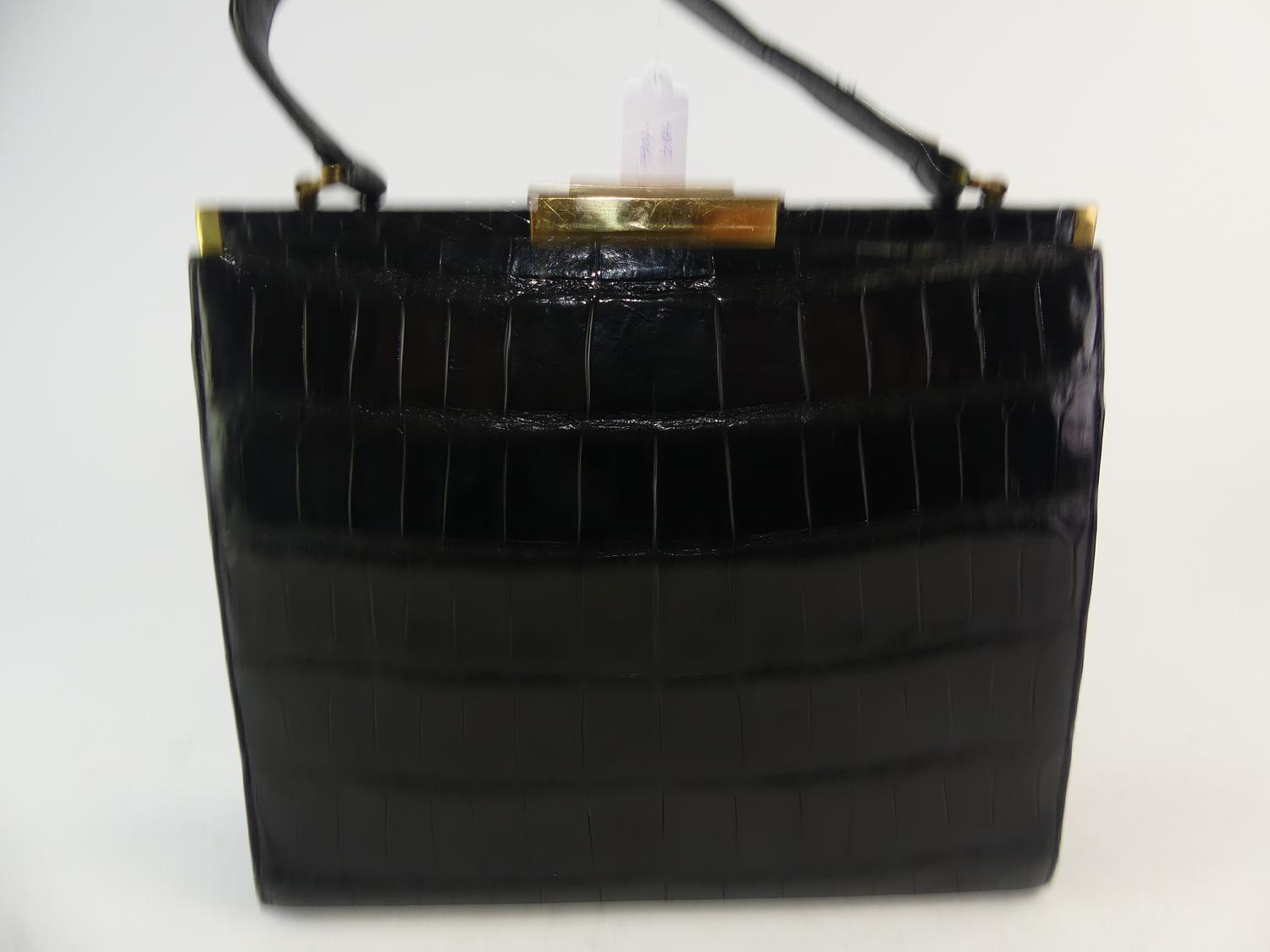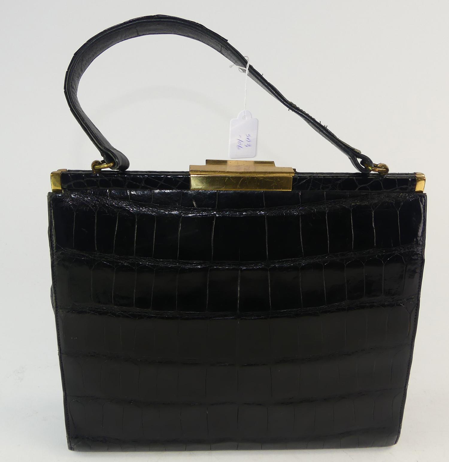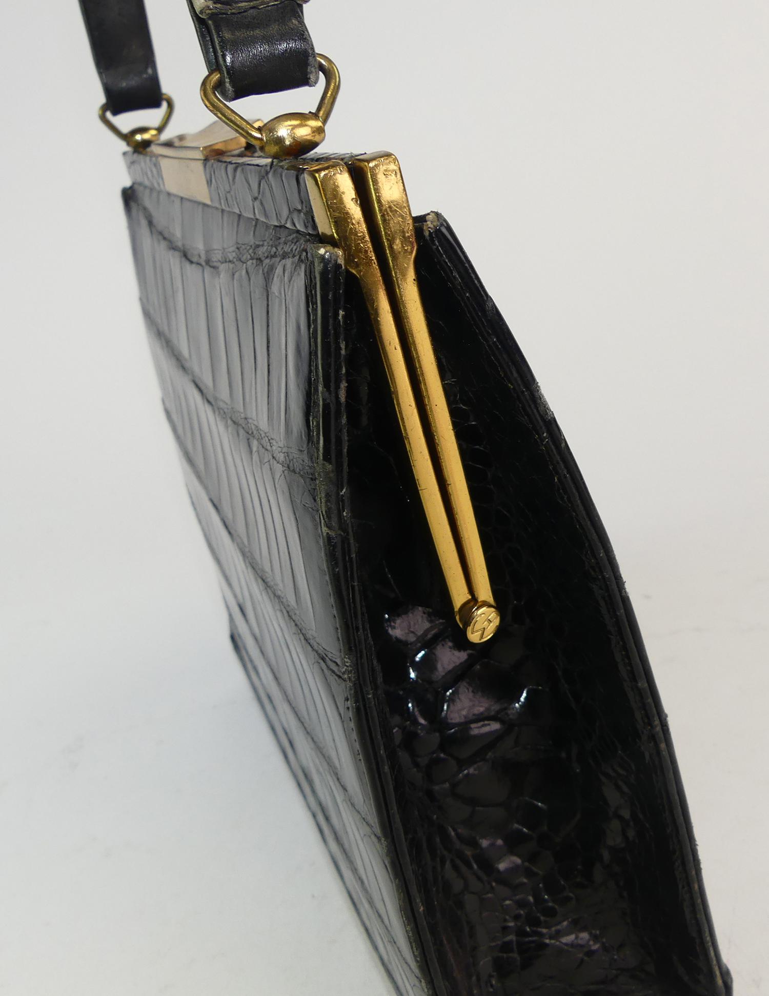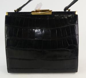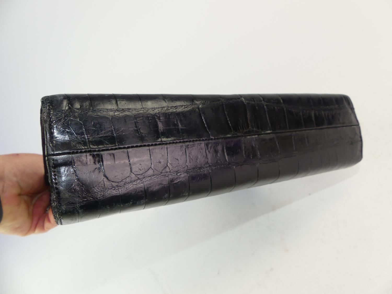 vintage black crocodile day bag, 11" x 9" x 2 3/4"