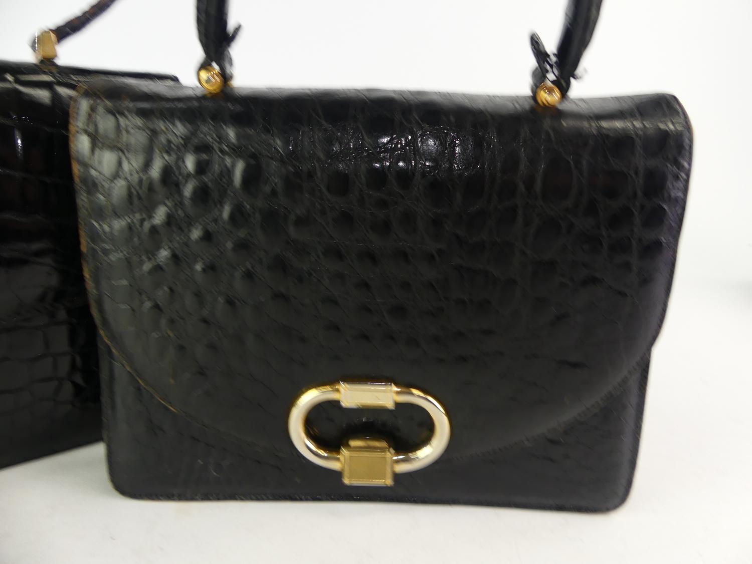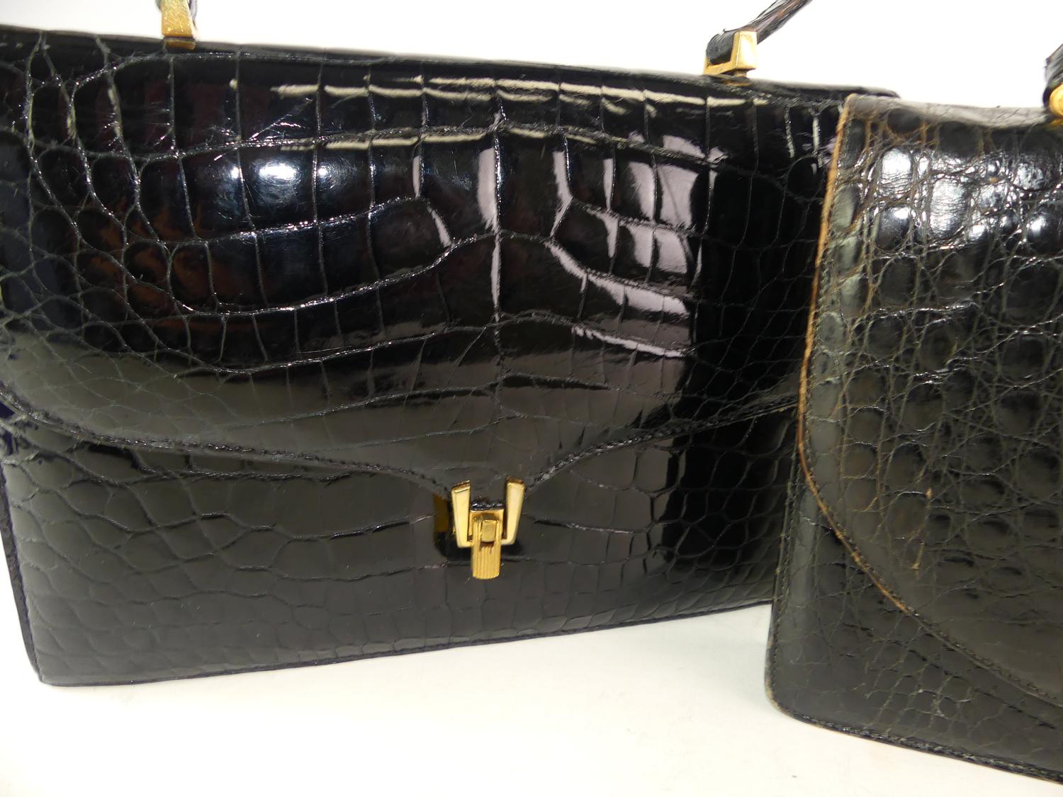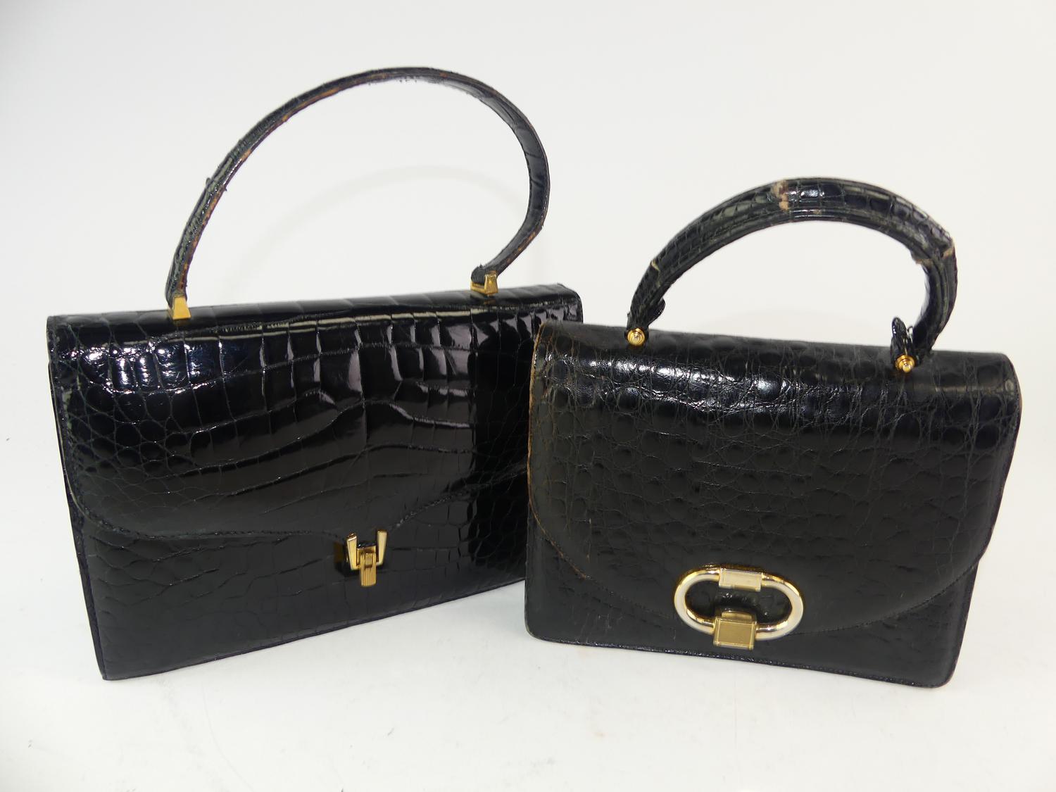 2 vintage black alligator purses, 10" x 7", 8 1/2" x 6"