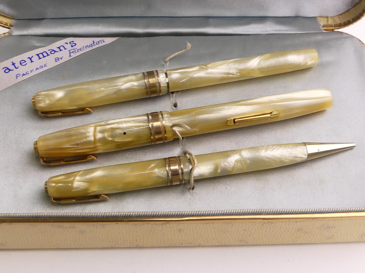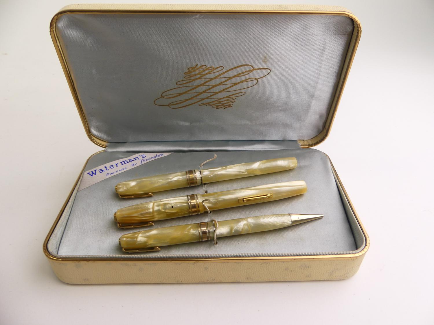 waterman's white pearl 3 piece pen, pencil and thermometer set with 14k nib, condition as found with original box