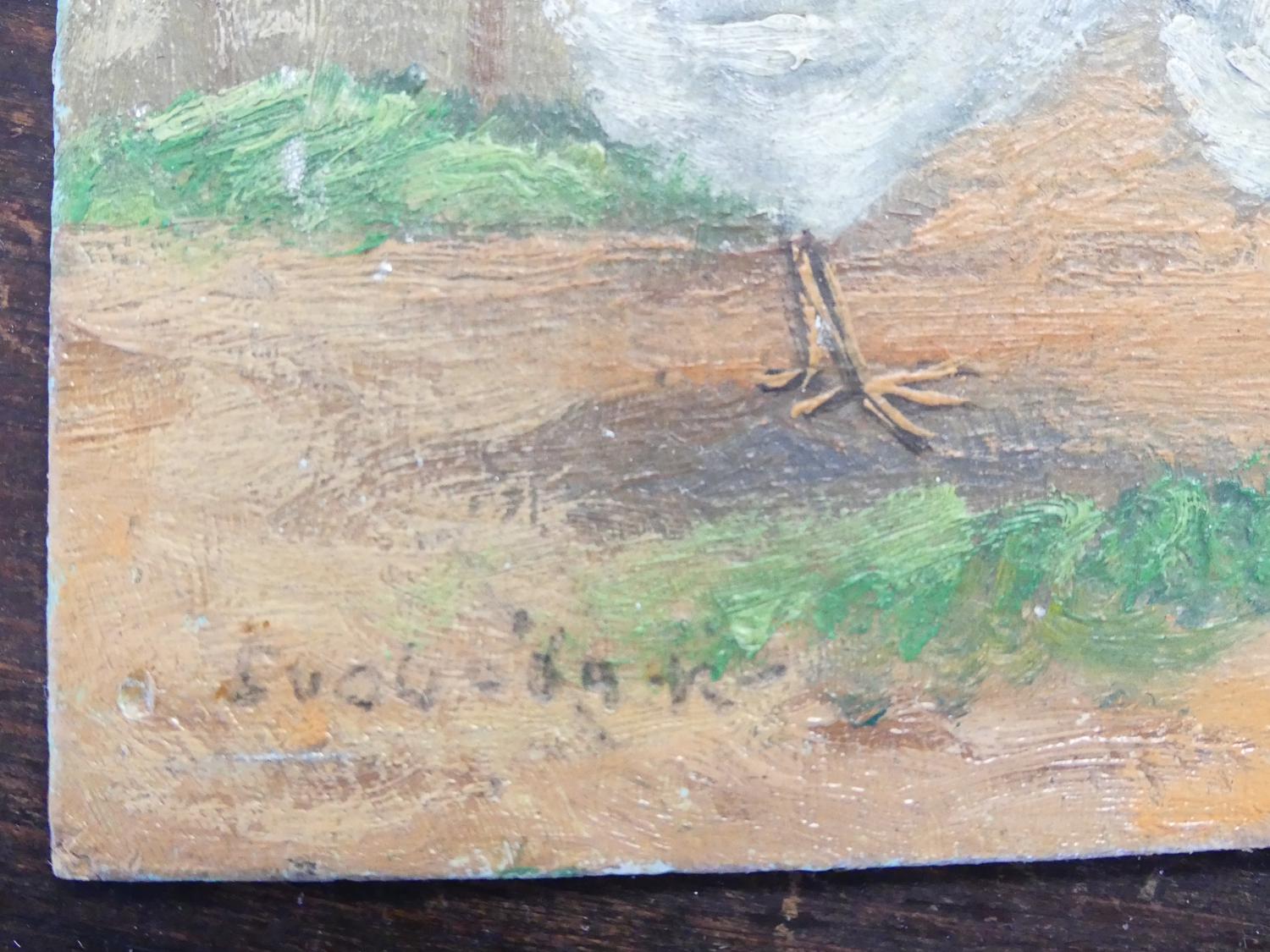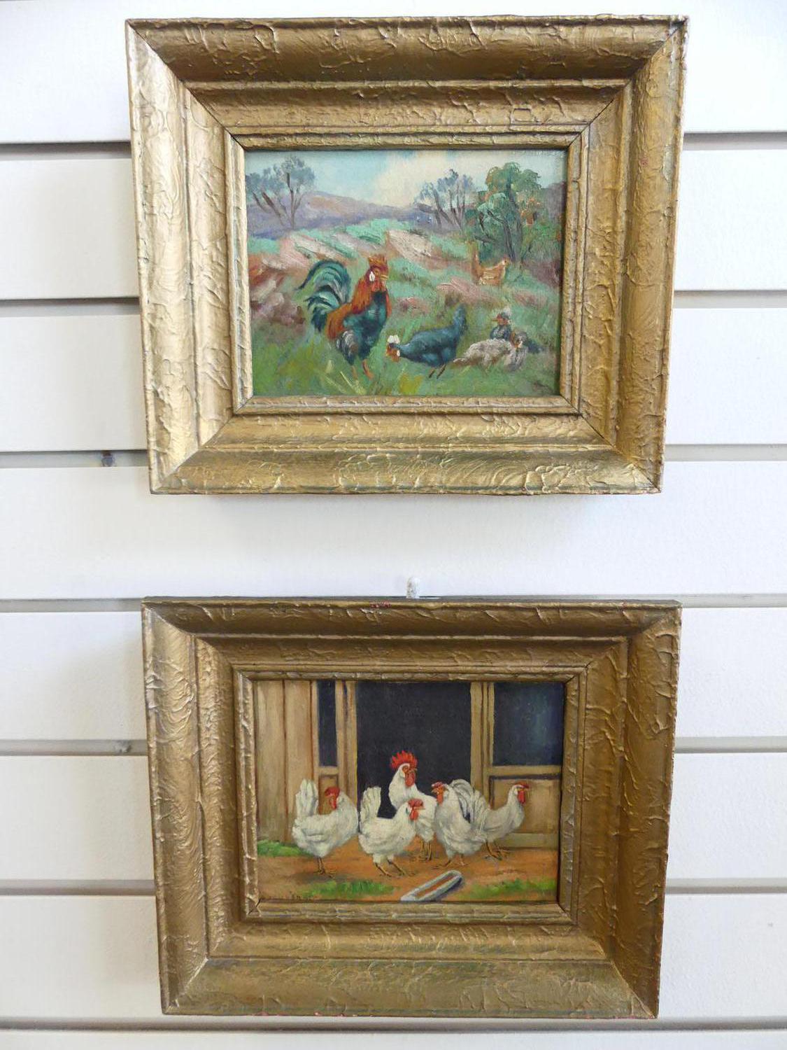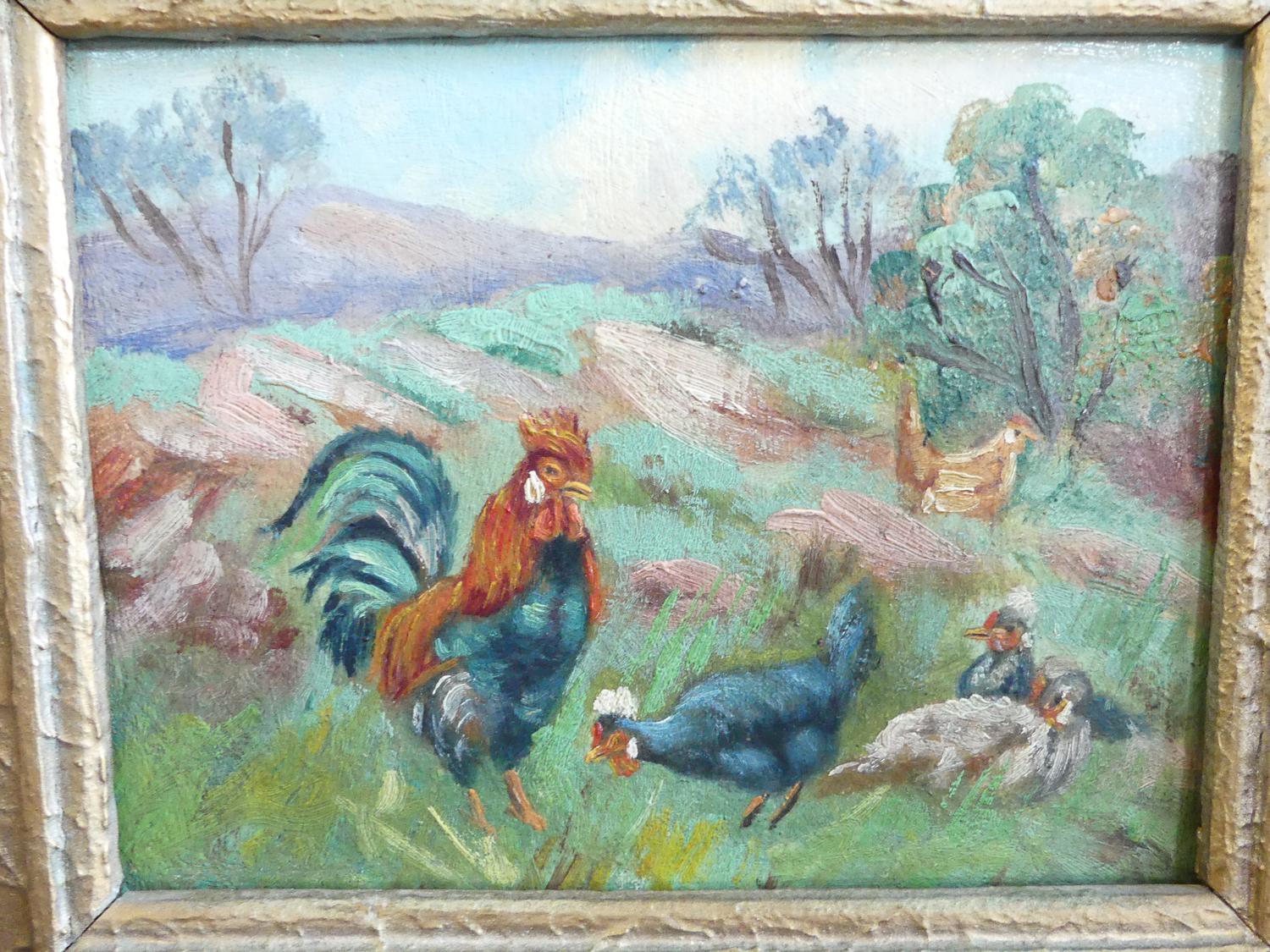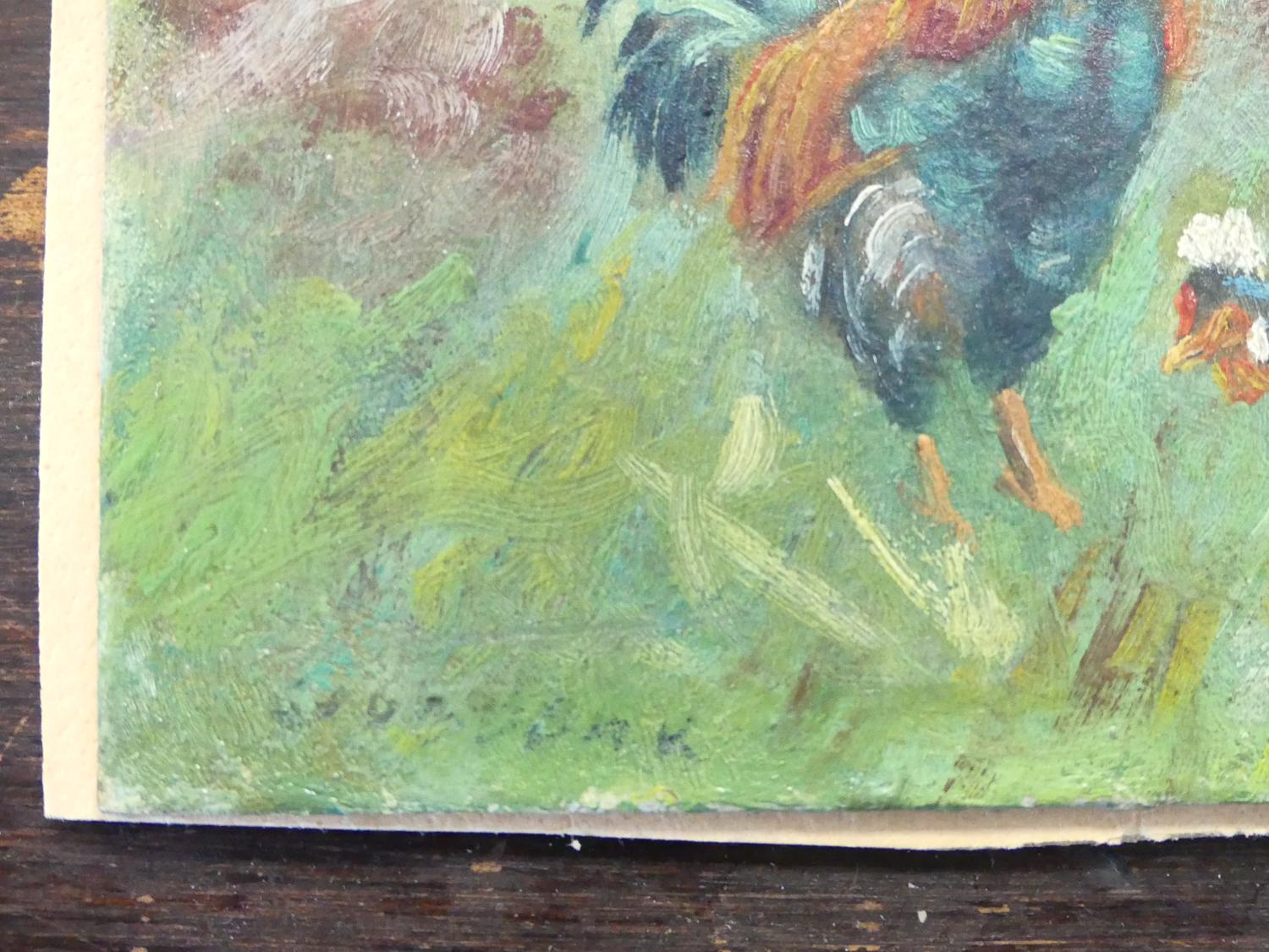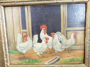 czechoslovakia school indistinctly signed, pair of oils on board, 3" x 5" "chickens"