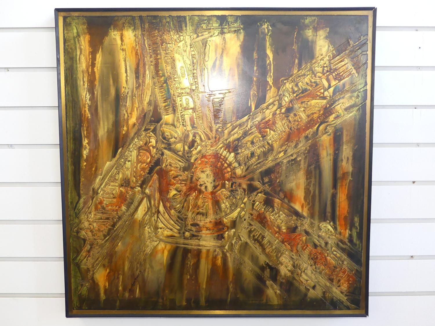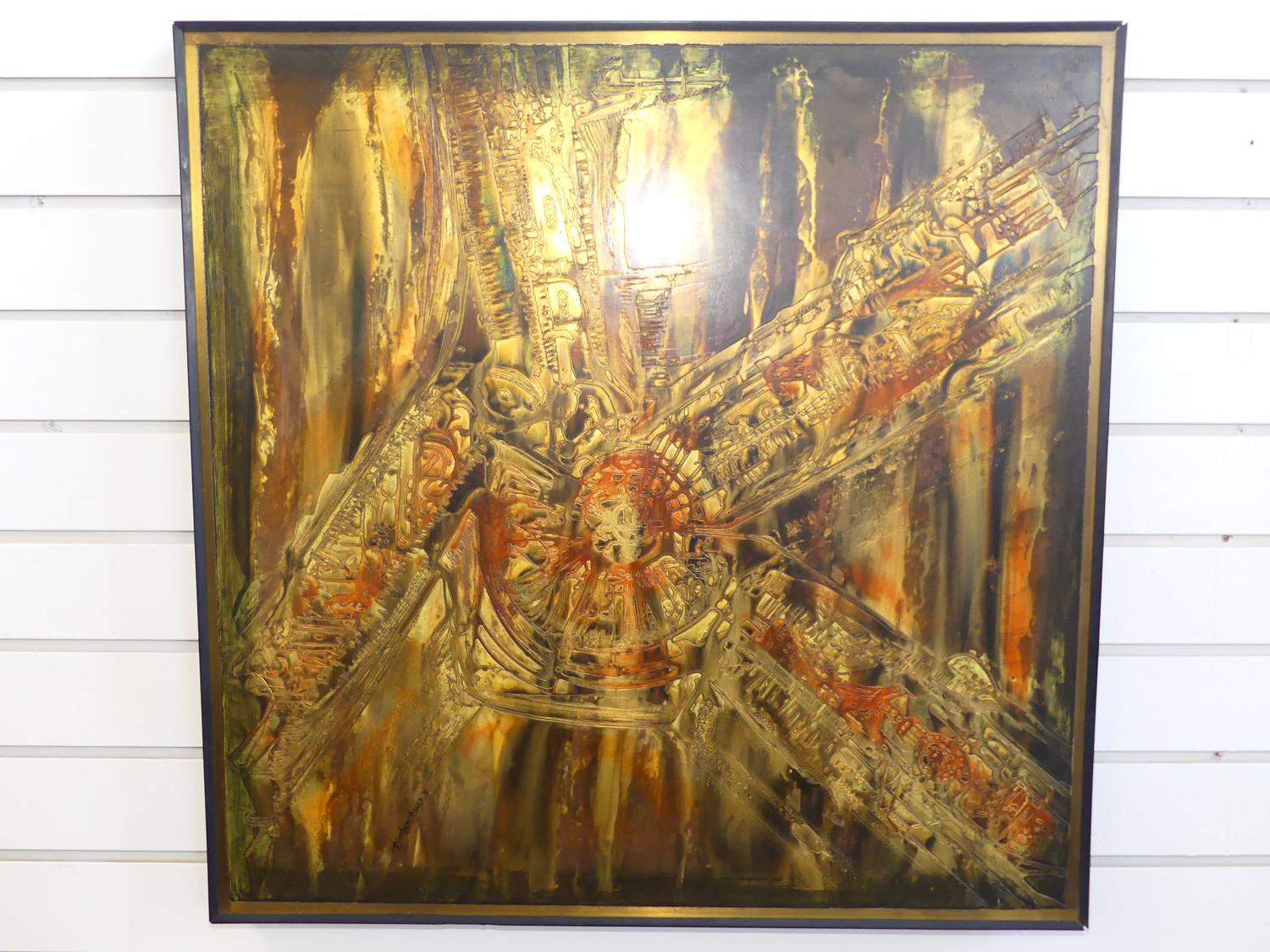bernhard rohne d. 1971, acid etched copper panel, 23" x 23" , "brutalist abstract"