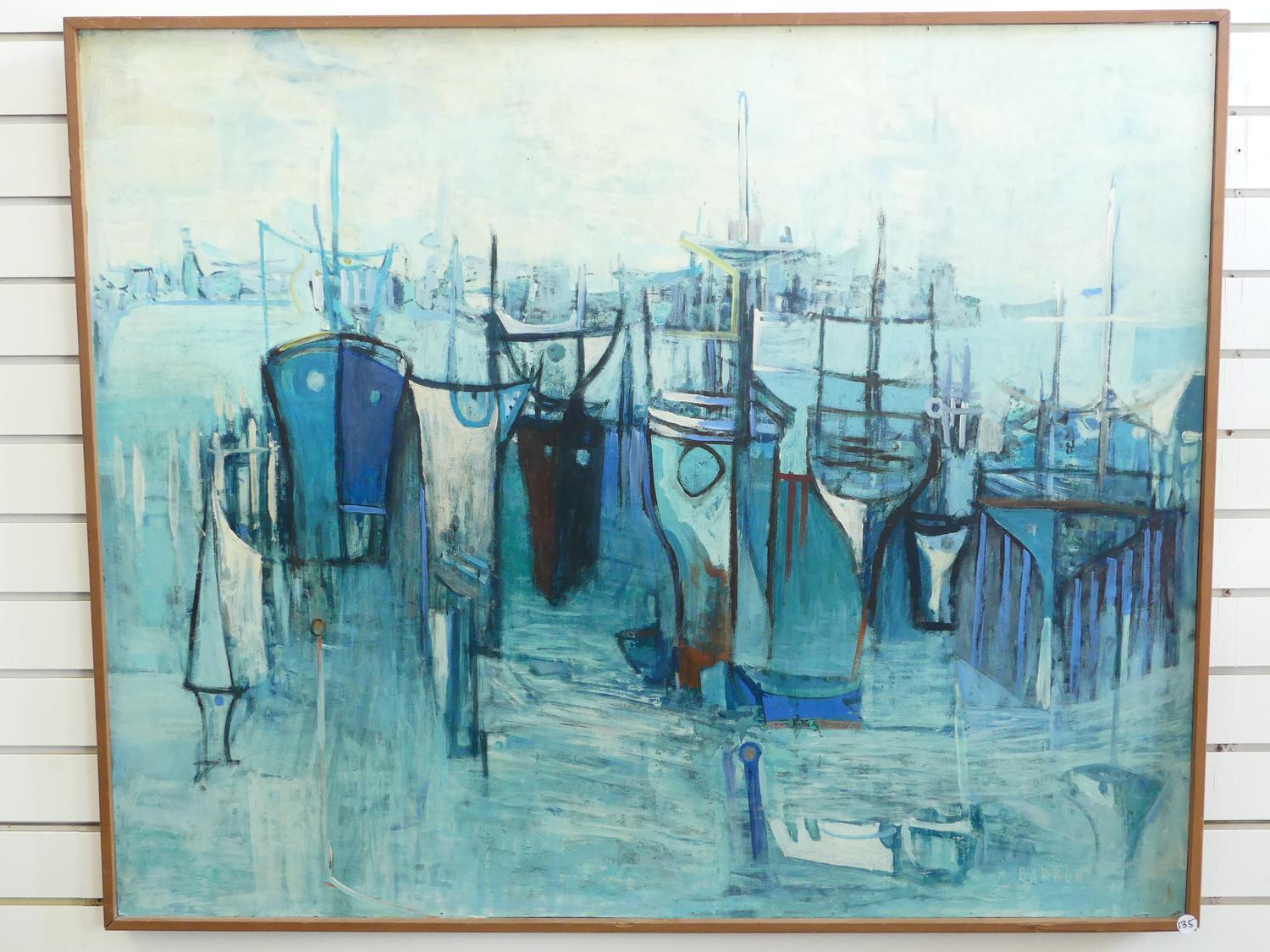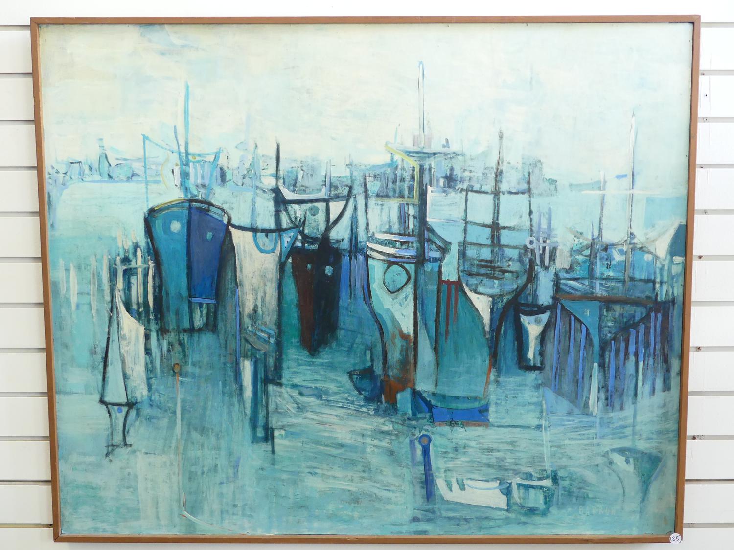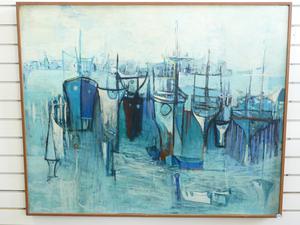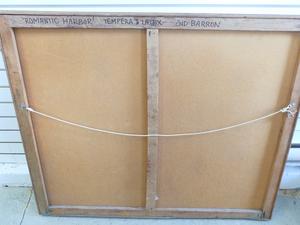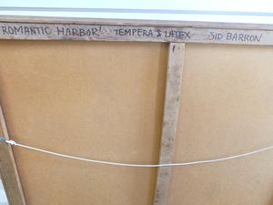 sid barron (1917-2006), tempera and latex on board, 34" x 41", "romantic harbour"