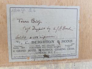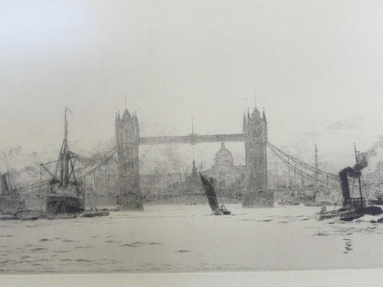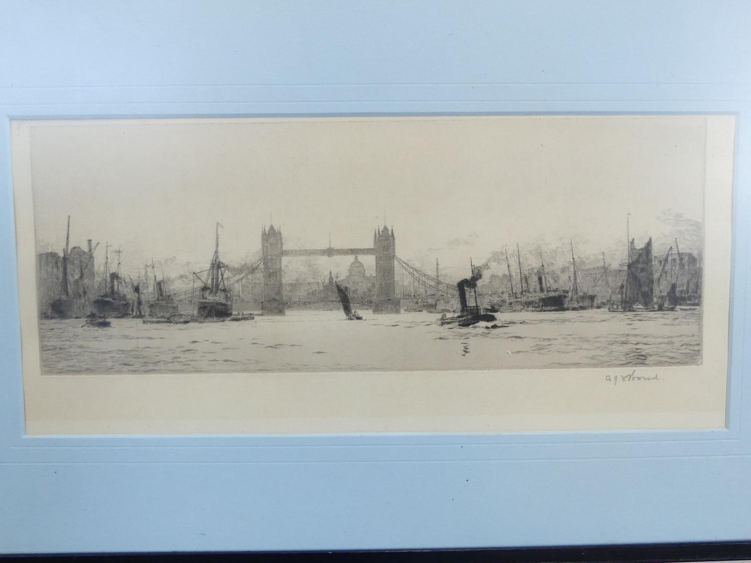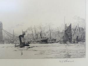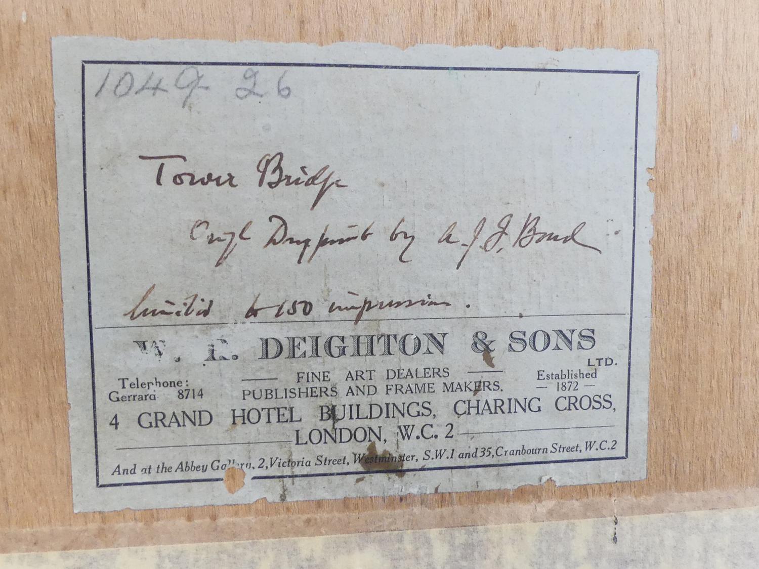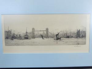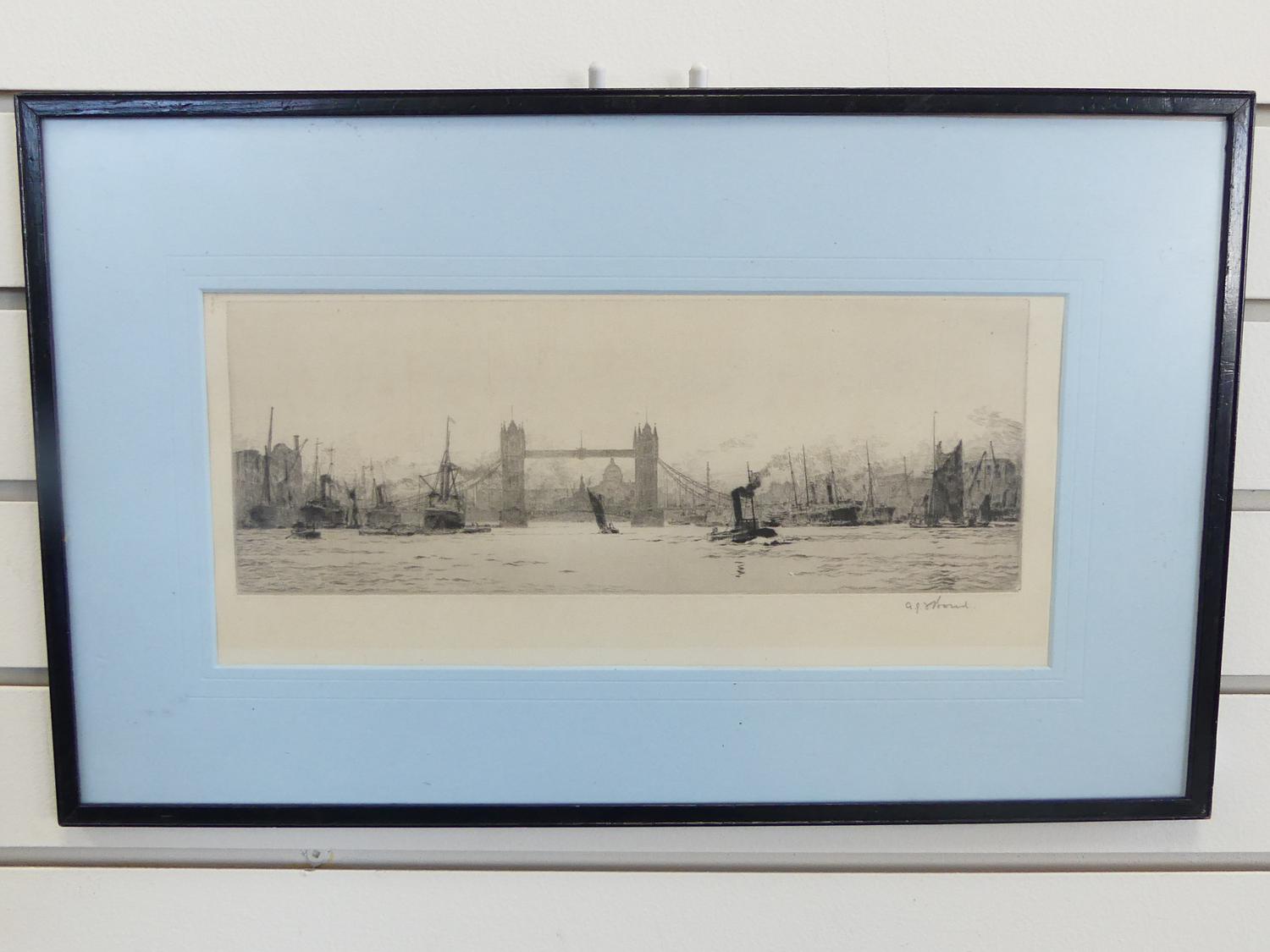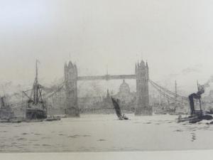 arthur j.f. bond (1888-1958), drypoint etching, 4 3/4" x 12", "tower bridge"
