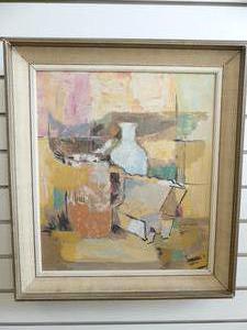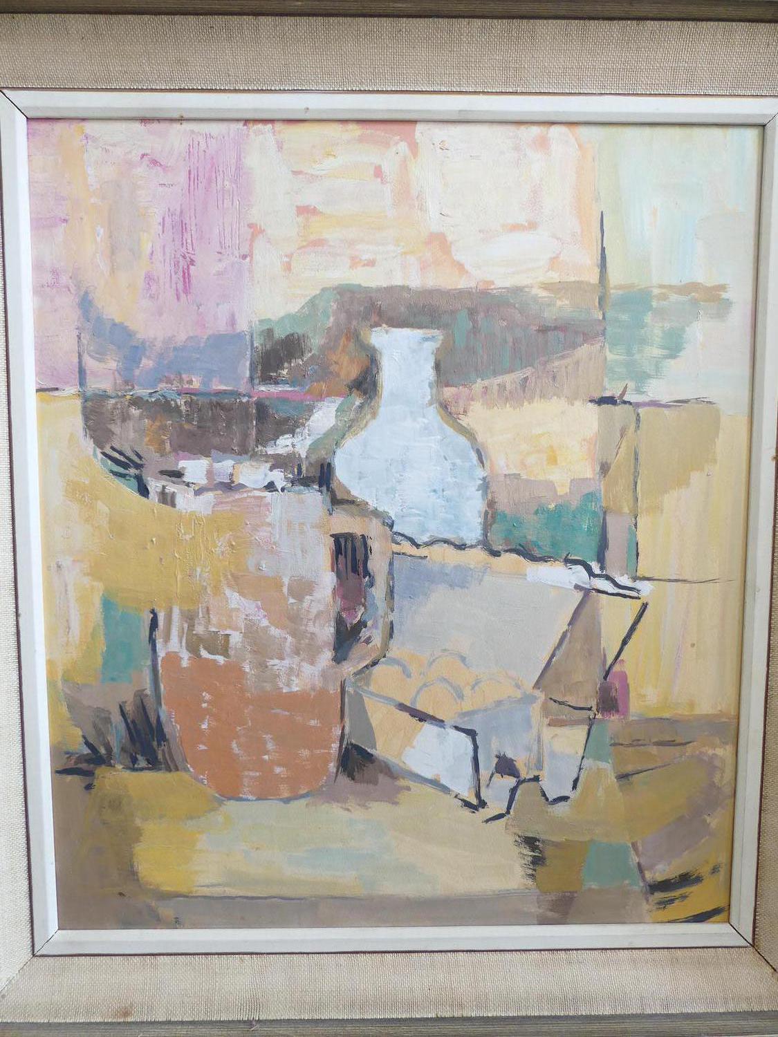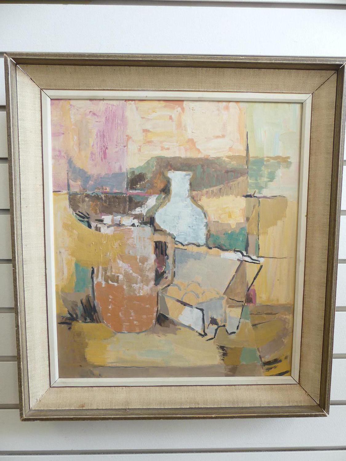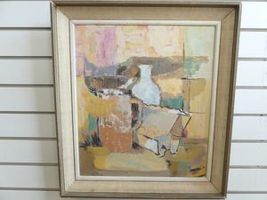 unsigned, oil on board, 17" x 14", "abstract stillife"