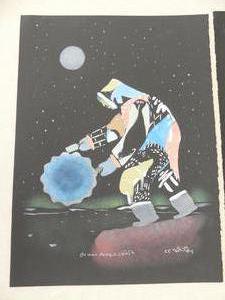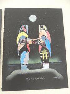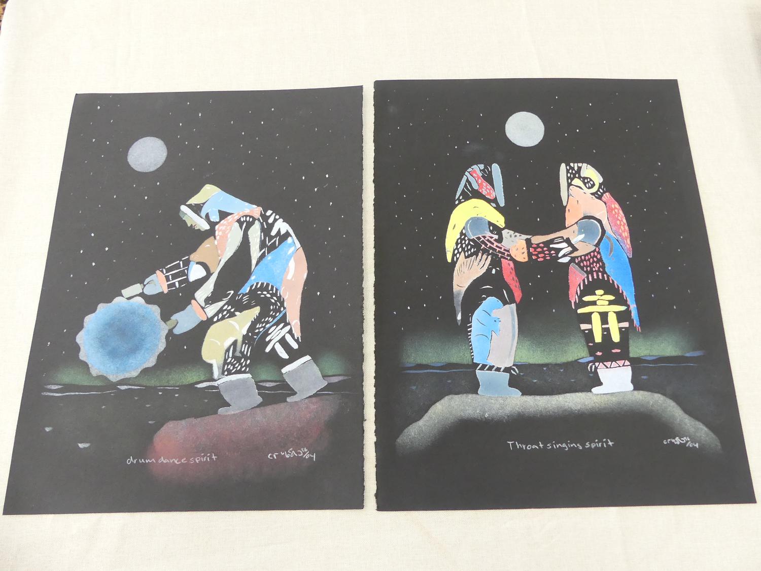 bearing initials c.r., two inuit screen print, d.2004, 14 3/4" x 11", "drum" & "throat singing spirit"