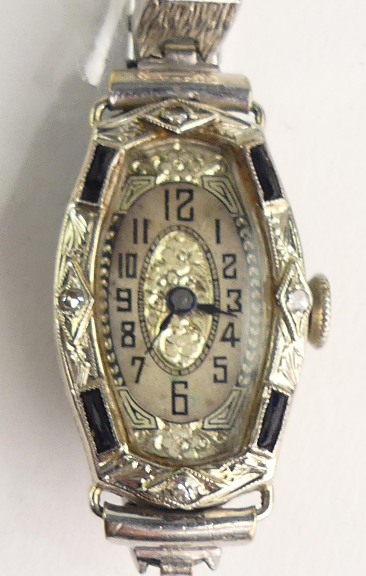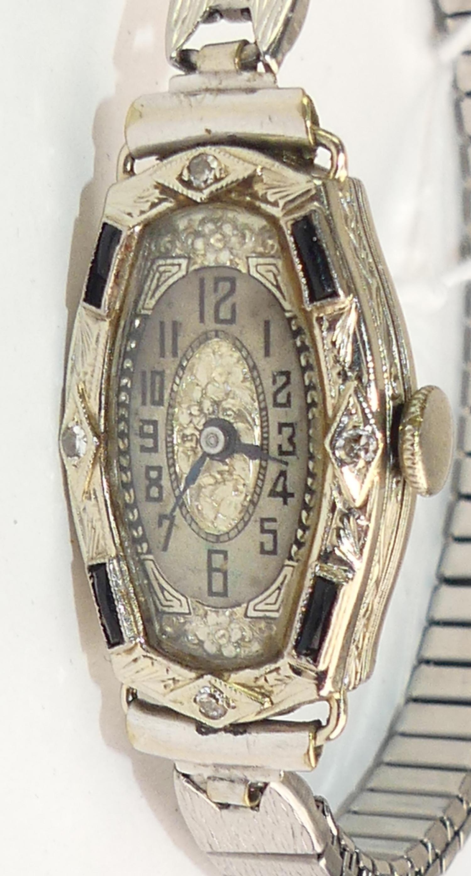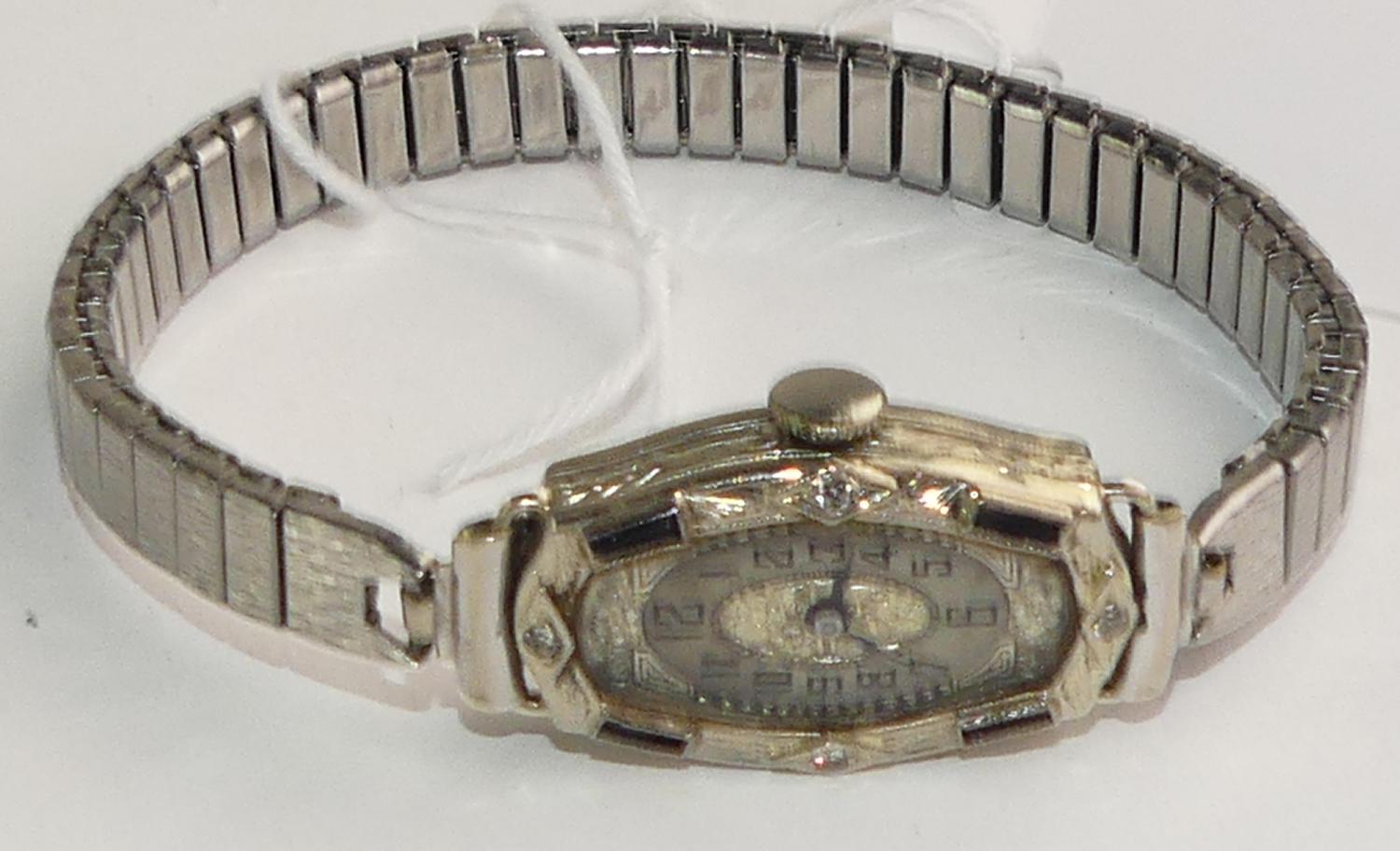 art deco 14k white gold diamond watch, 17 jewel movement, expansion stainless steel bracelet