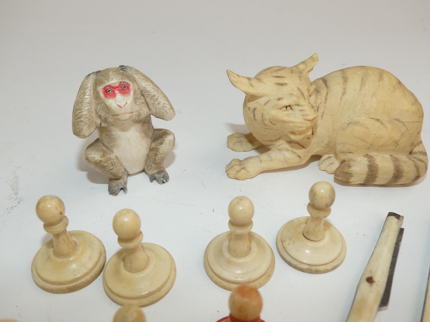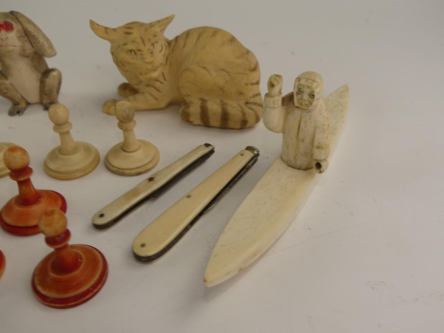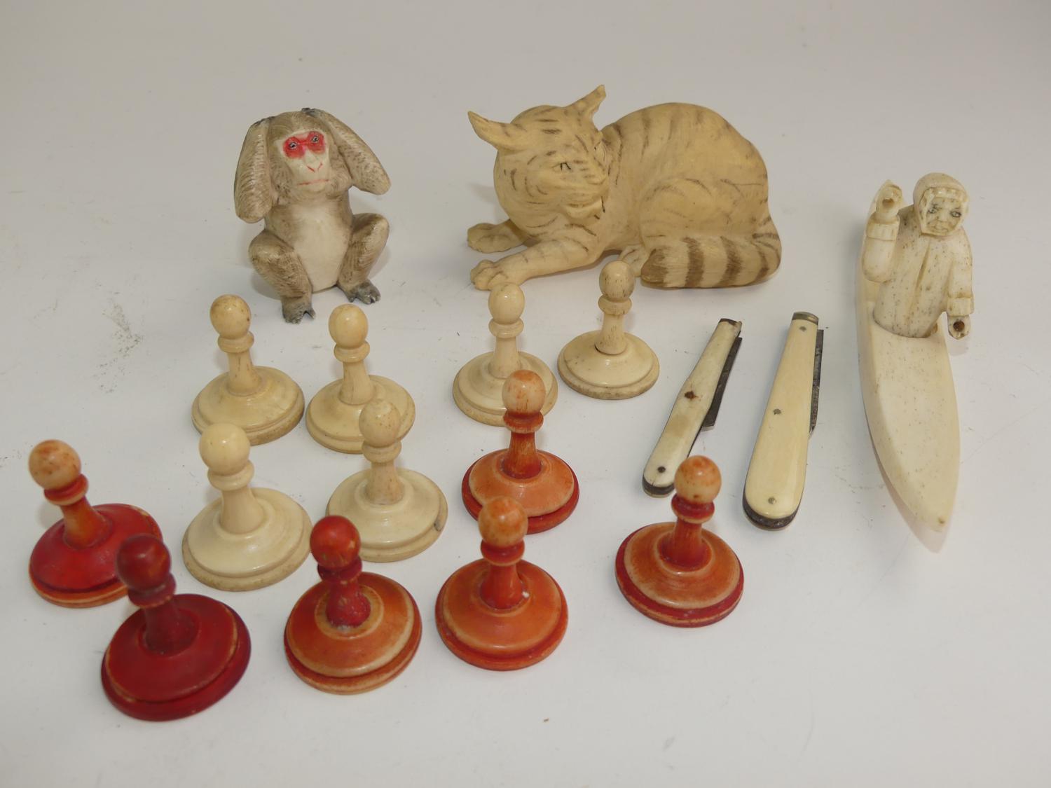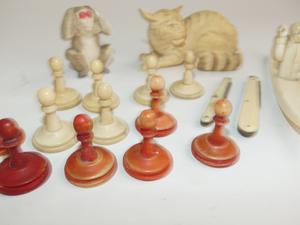 lot of ivory and bone pieces, chess, eskimo on kayak, monkey