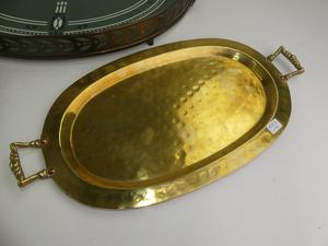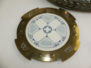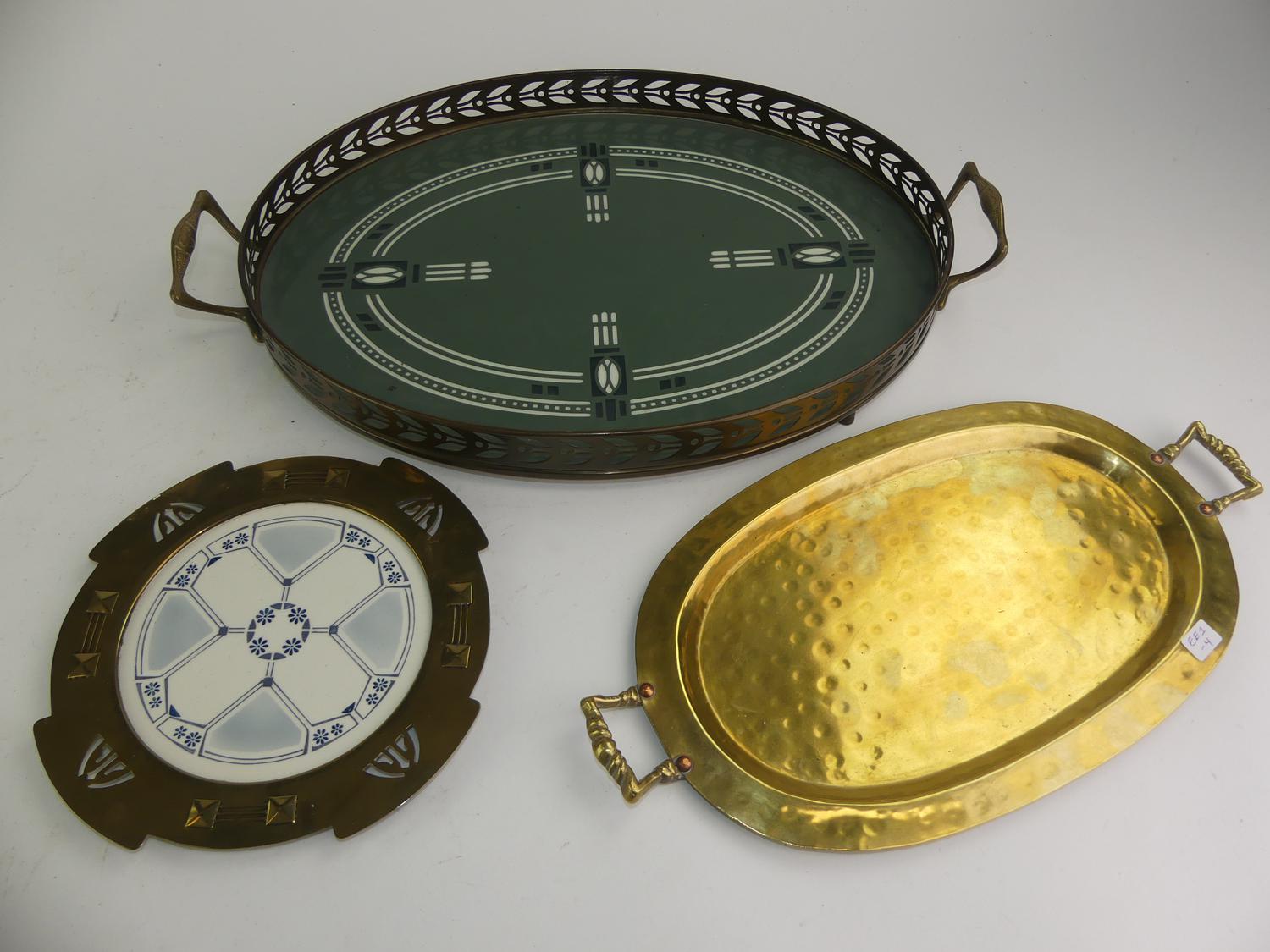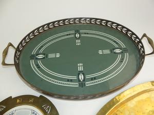 three art nouveau trays and hardwood carved stand, length 18 1/2" and smaller