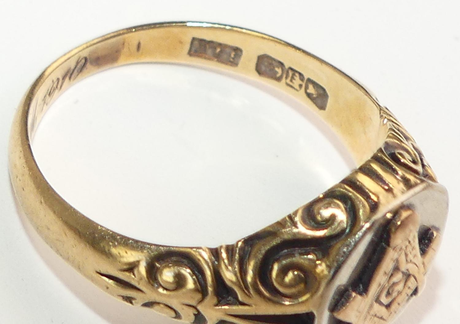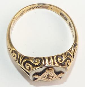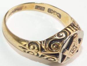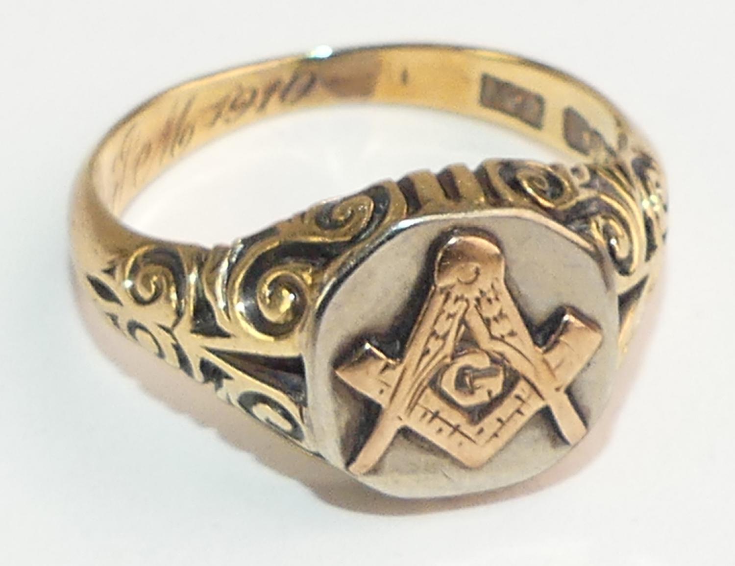 art deco masonic 14k yellow and white gold gents masonic ring, size 11, weighing approx 8.3 grams