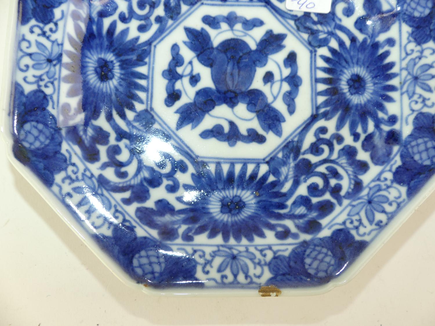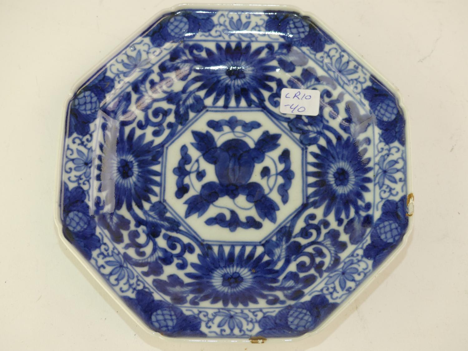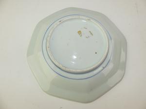 antique blue and white octagonal dish, chips to rim, dia. 6 1/2"