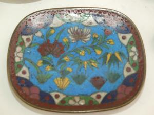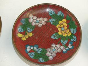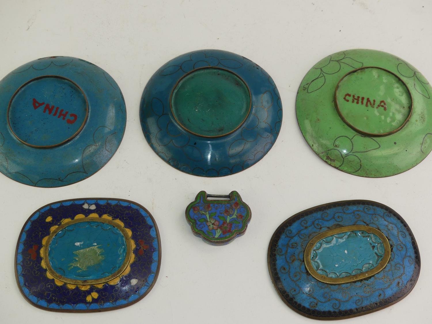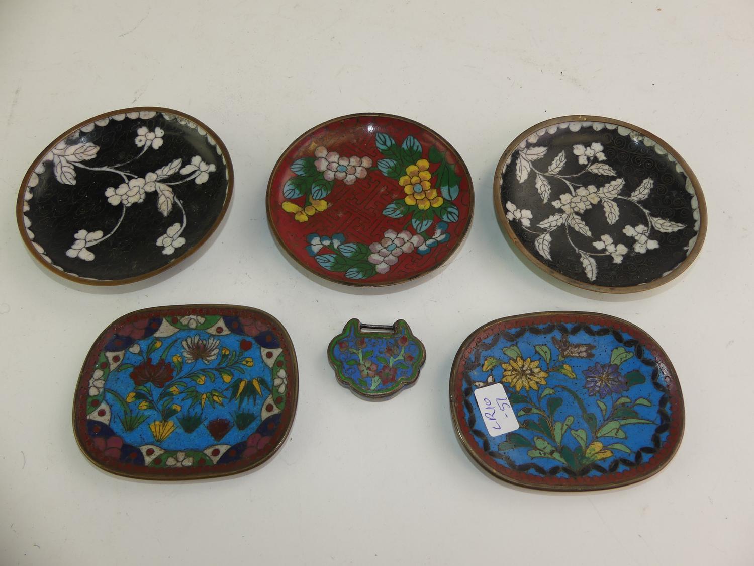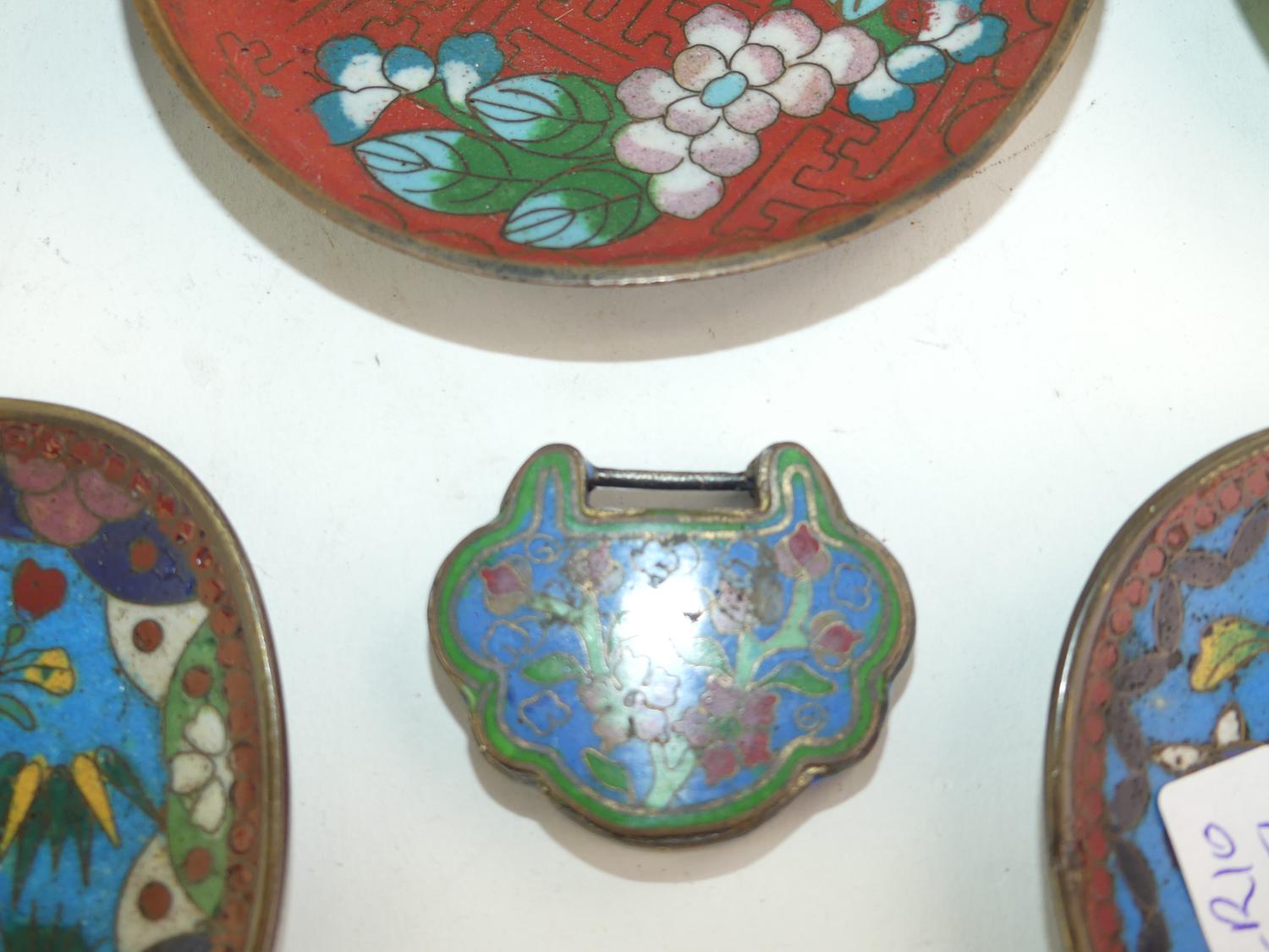 5 chinese cloisonne dishes and a pad lock, diamedter 4 and less