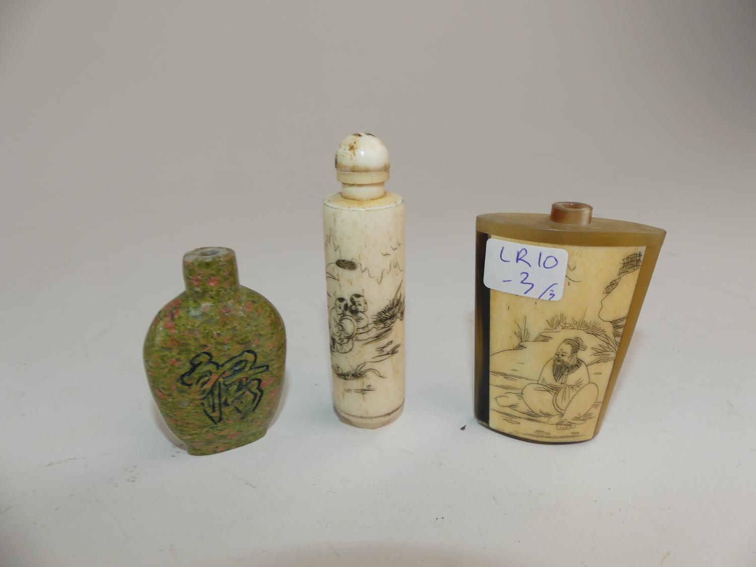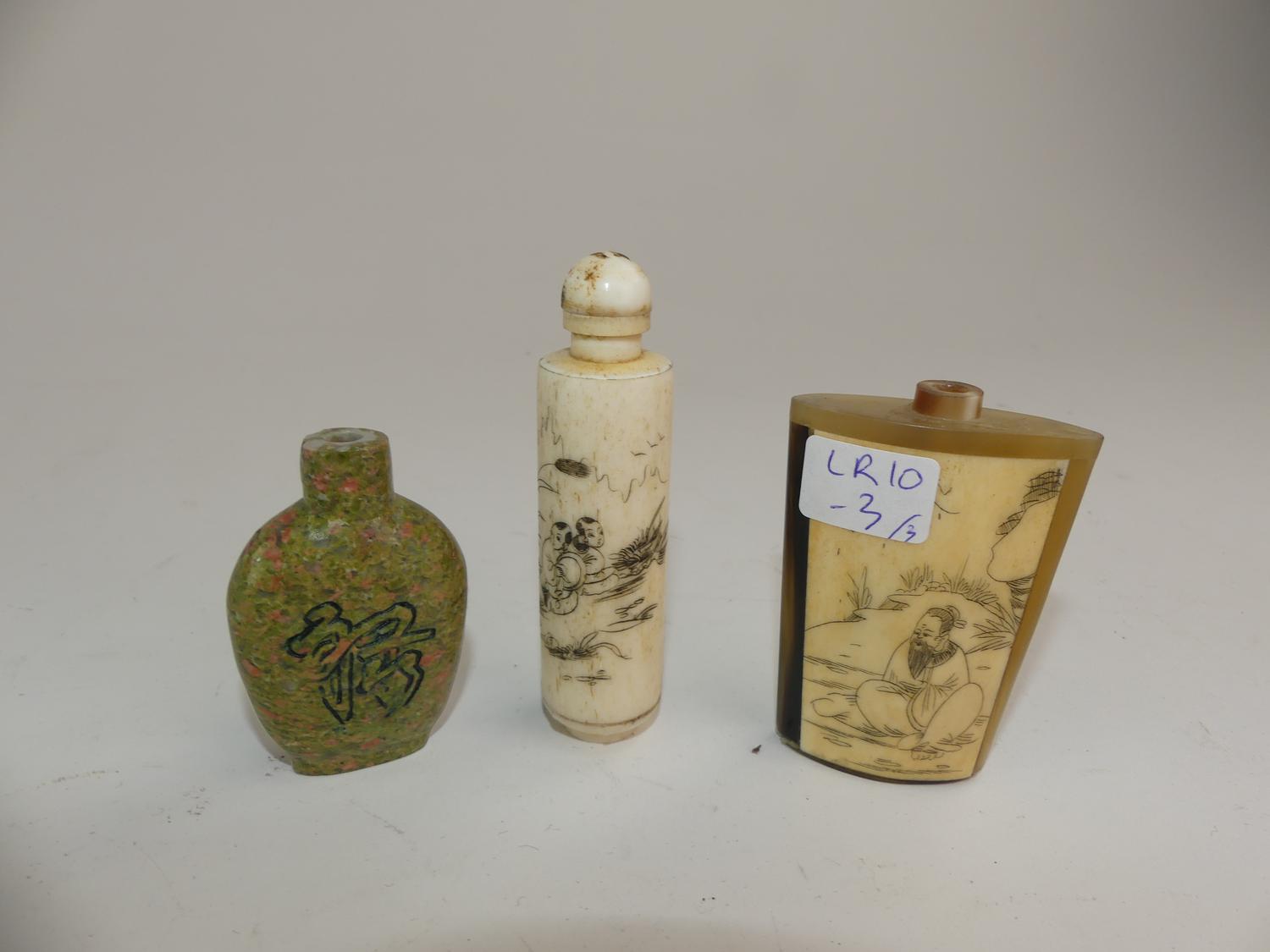 three chinese bone, horn and hand painted snuff bottles