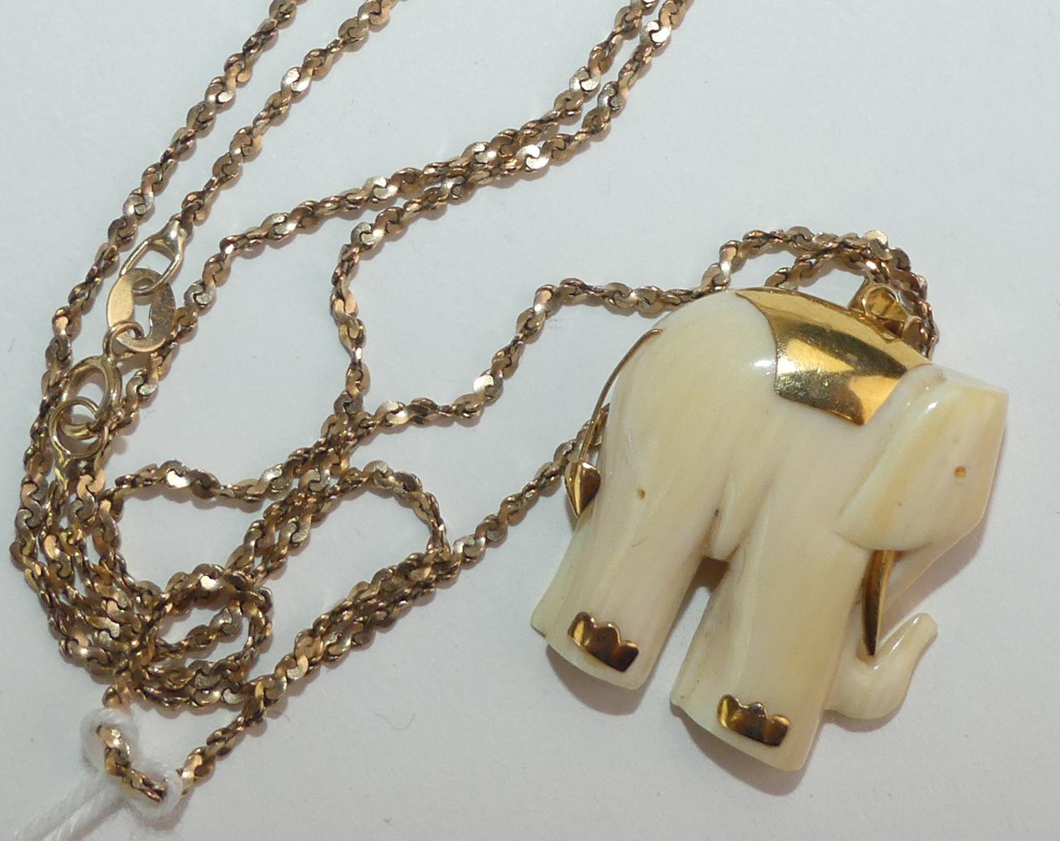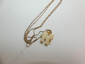 14k pink gold mounted carved ivory elephant pendant on a 26"10k pink gold rope chain, chain weighing approx 4.2 grams