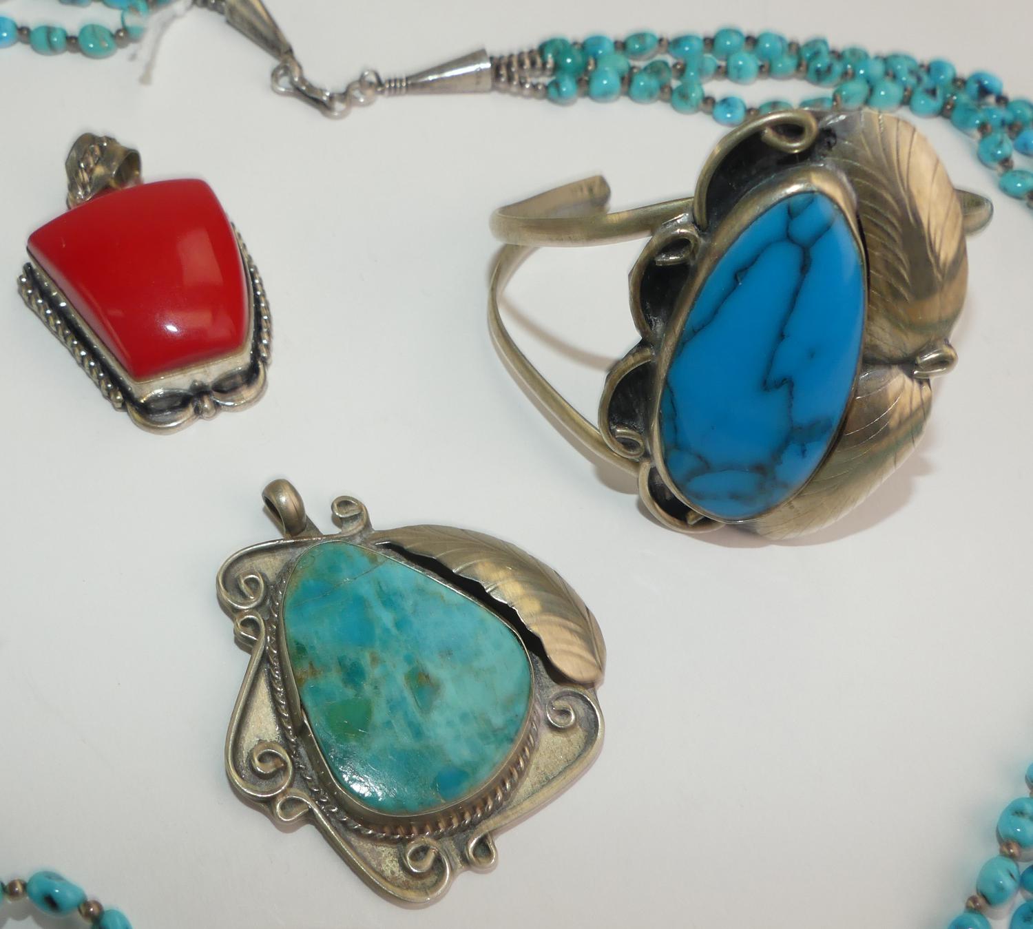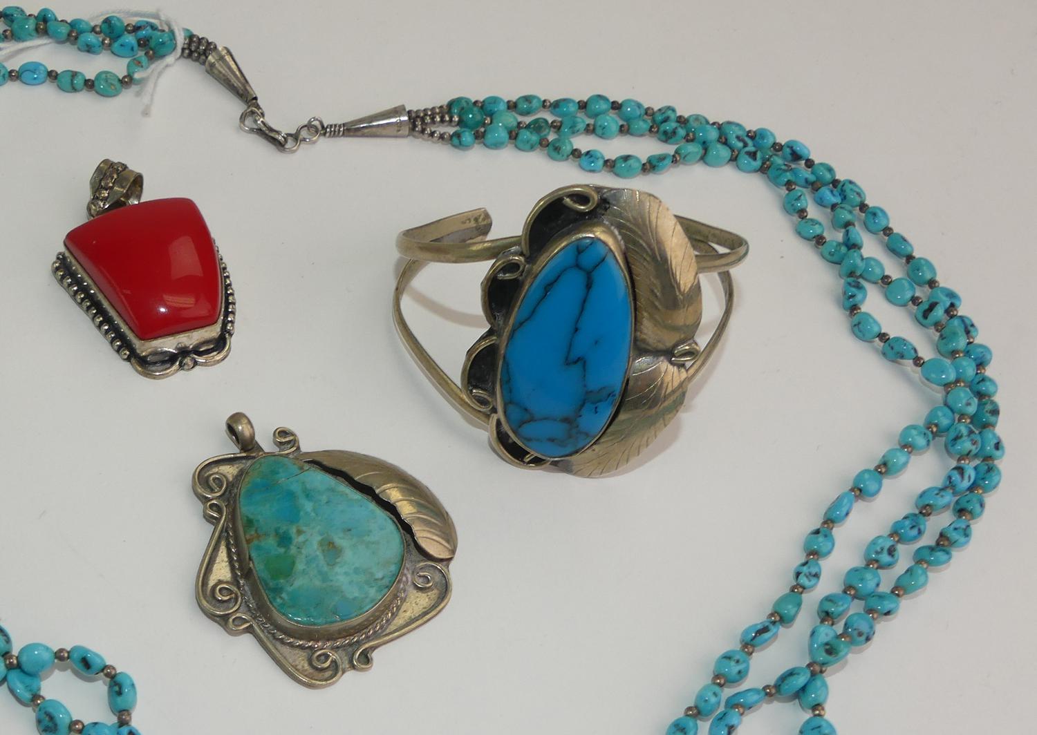 lot of vintage mexican jewelery and hopi sterling turquoise bead necklace, length 24"