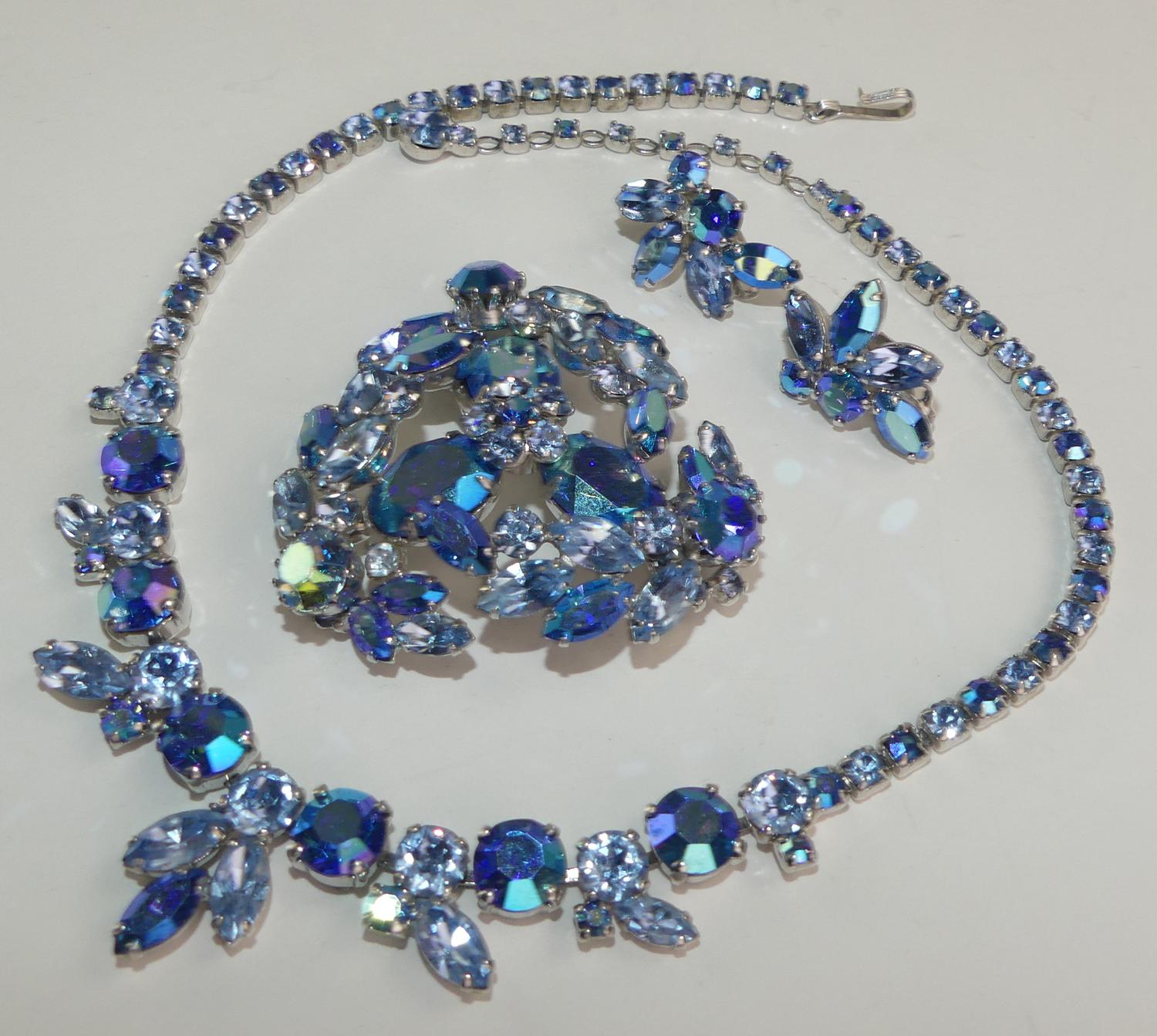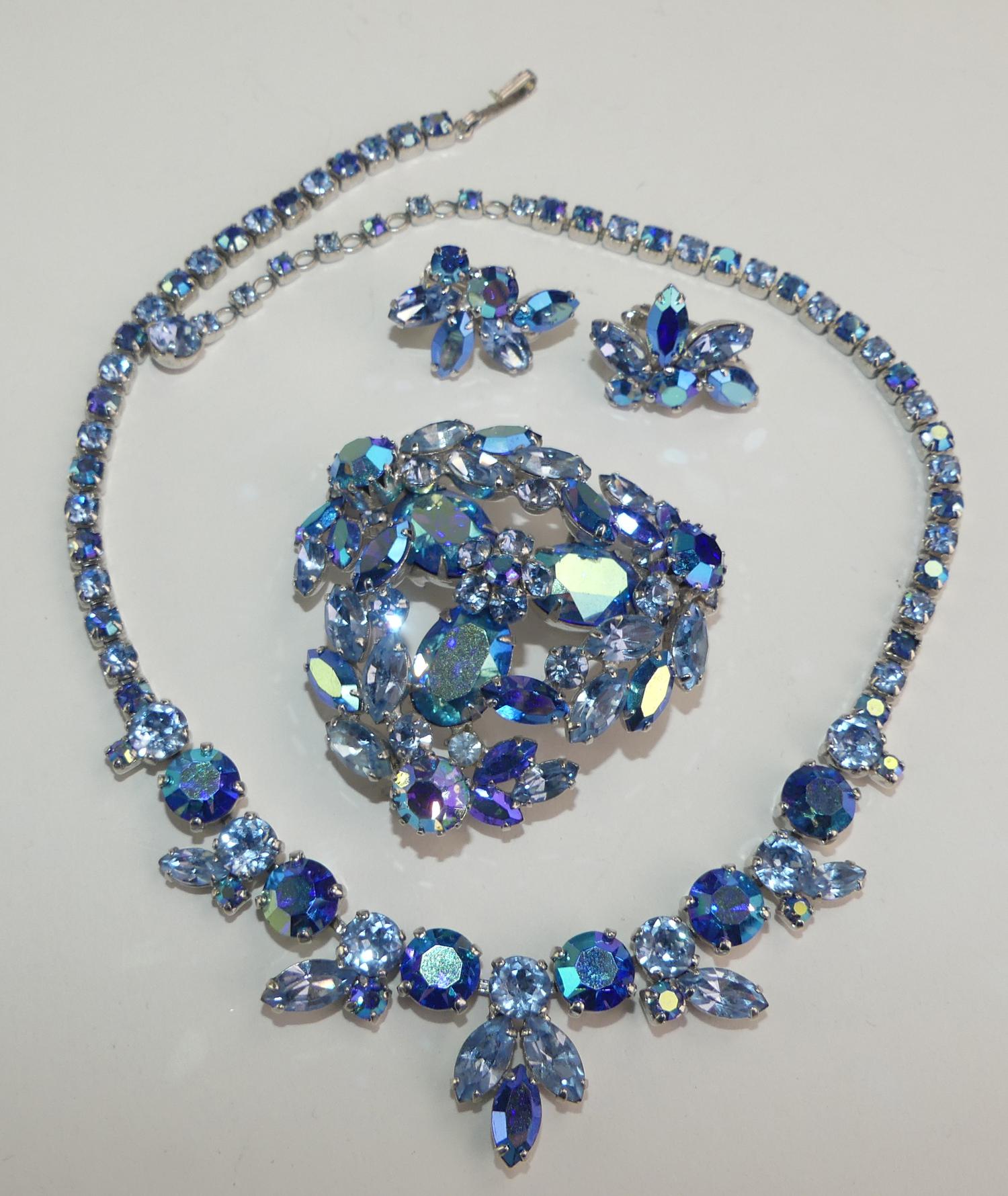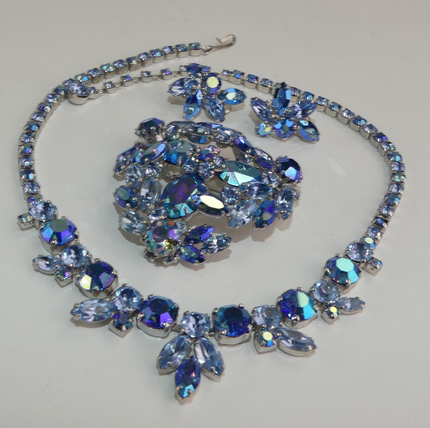 3pc sherman blue crystal parure, necklace, brooch earrings, signed