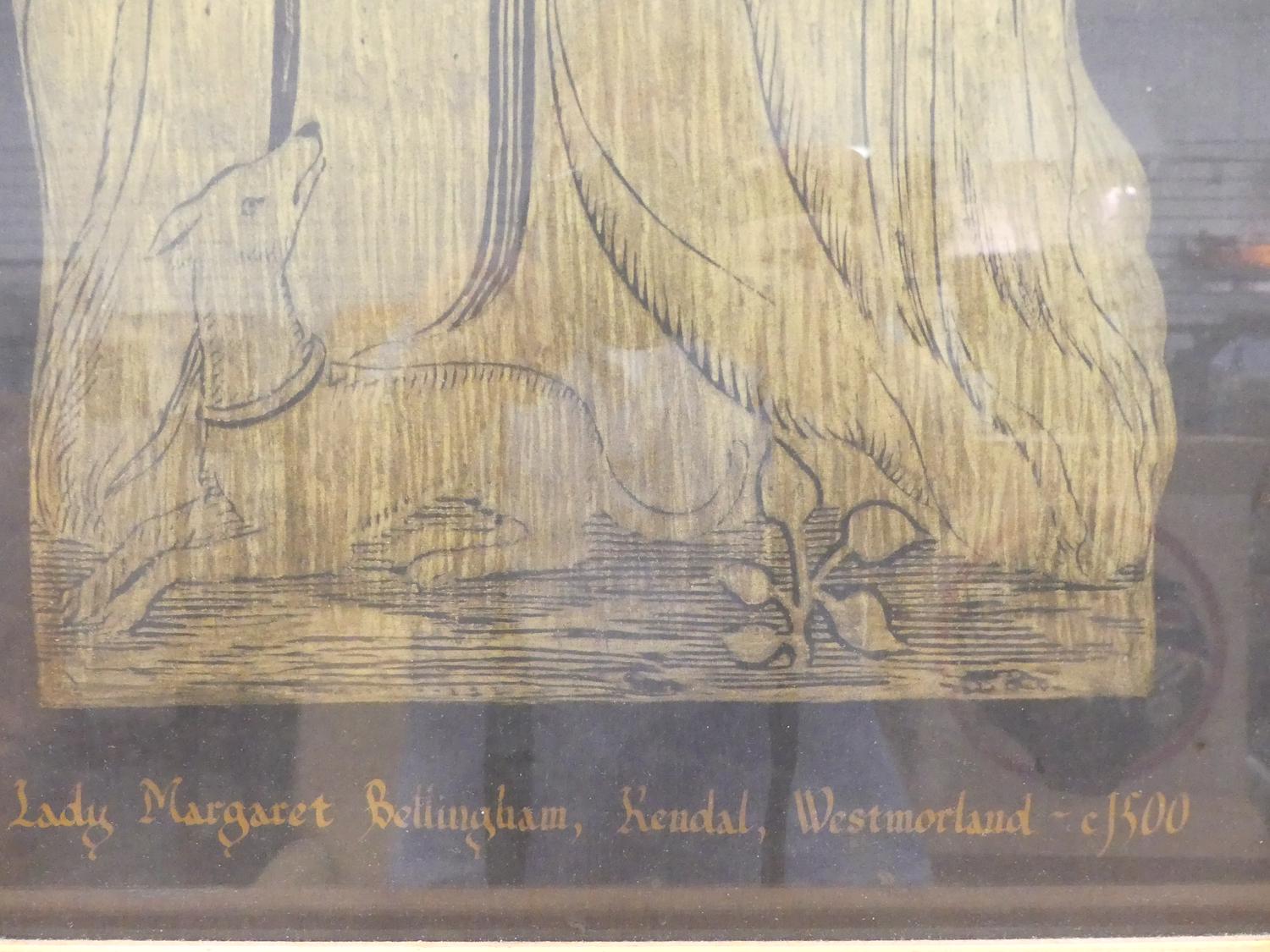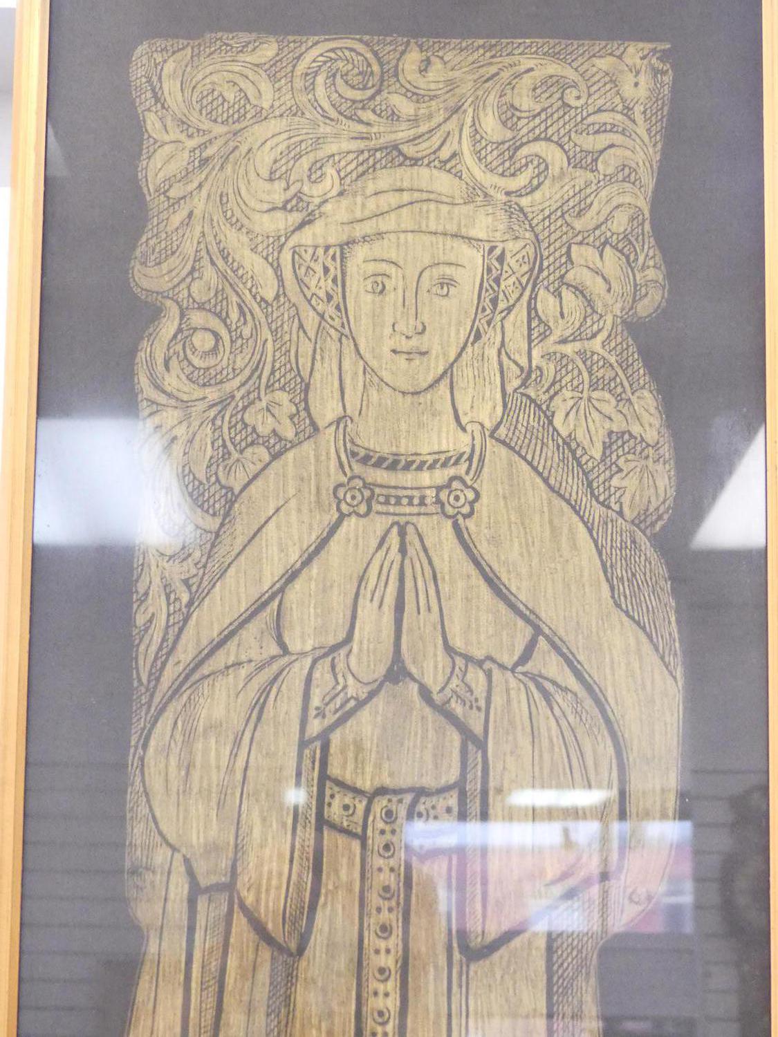 framed tomb rubbing of lady margaret bellingham, 41" x 14"