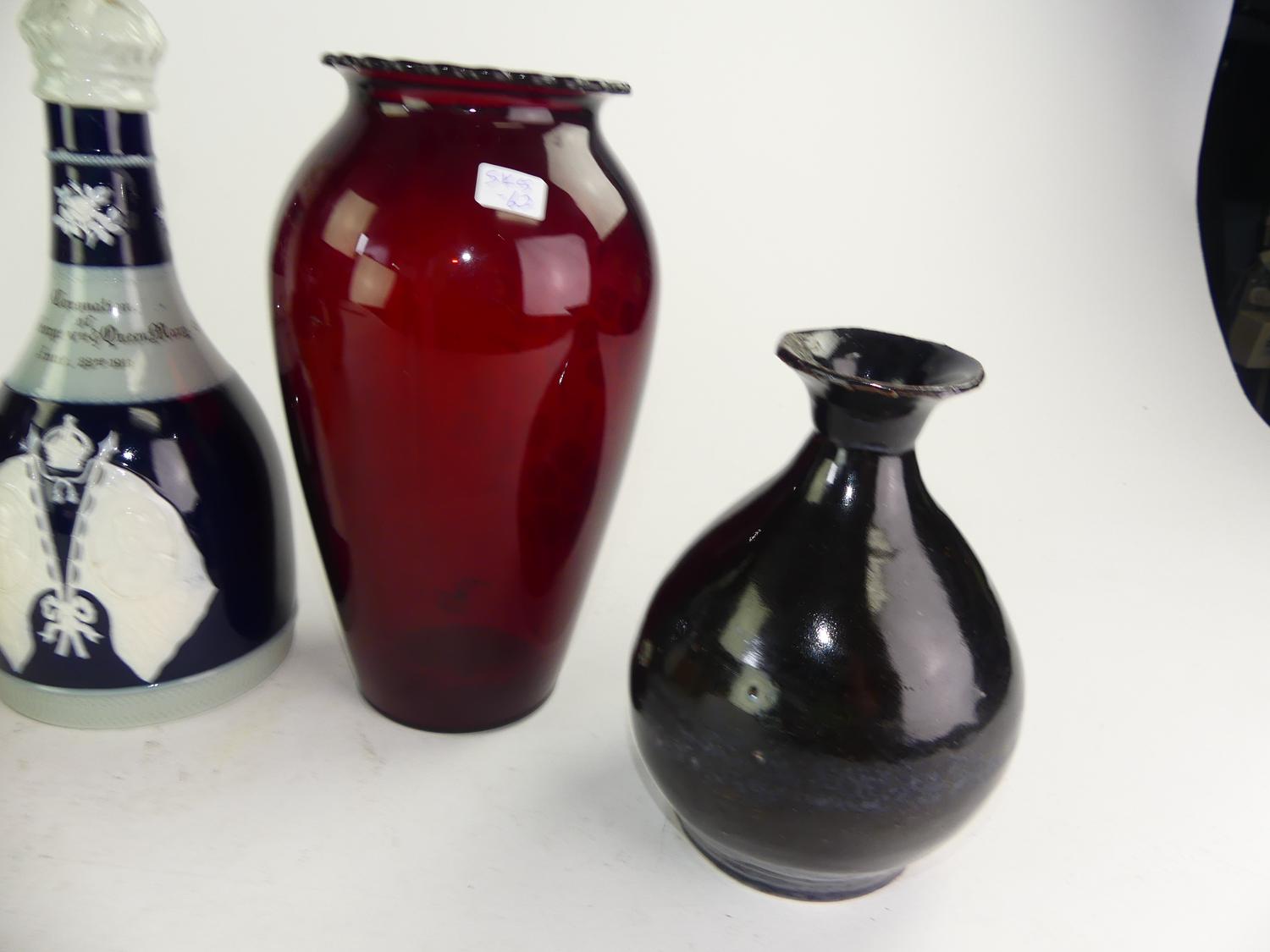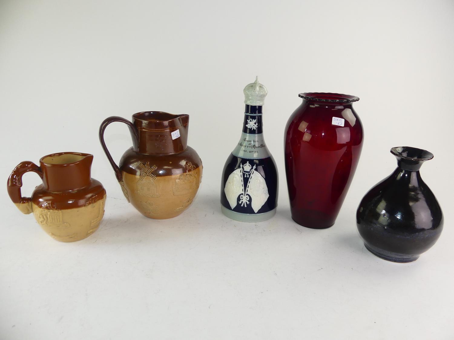 two royal doulton jugs, copeland spode geroge v coronation jug japanese jug and ruby glass vase