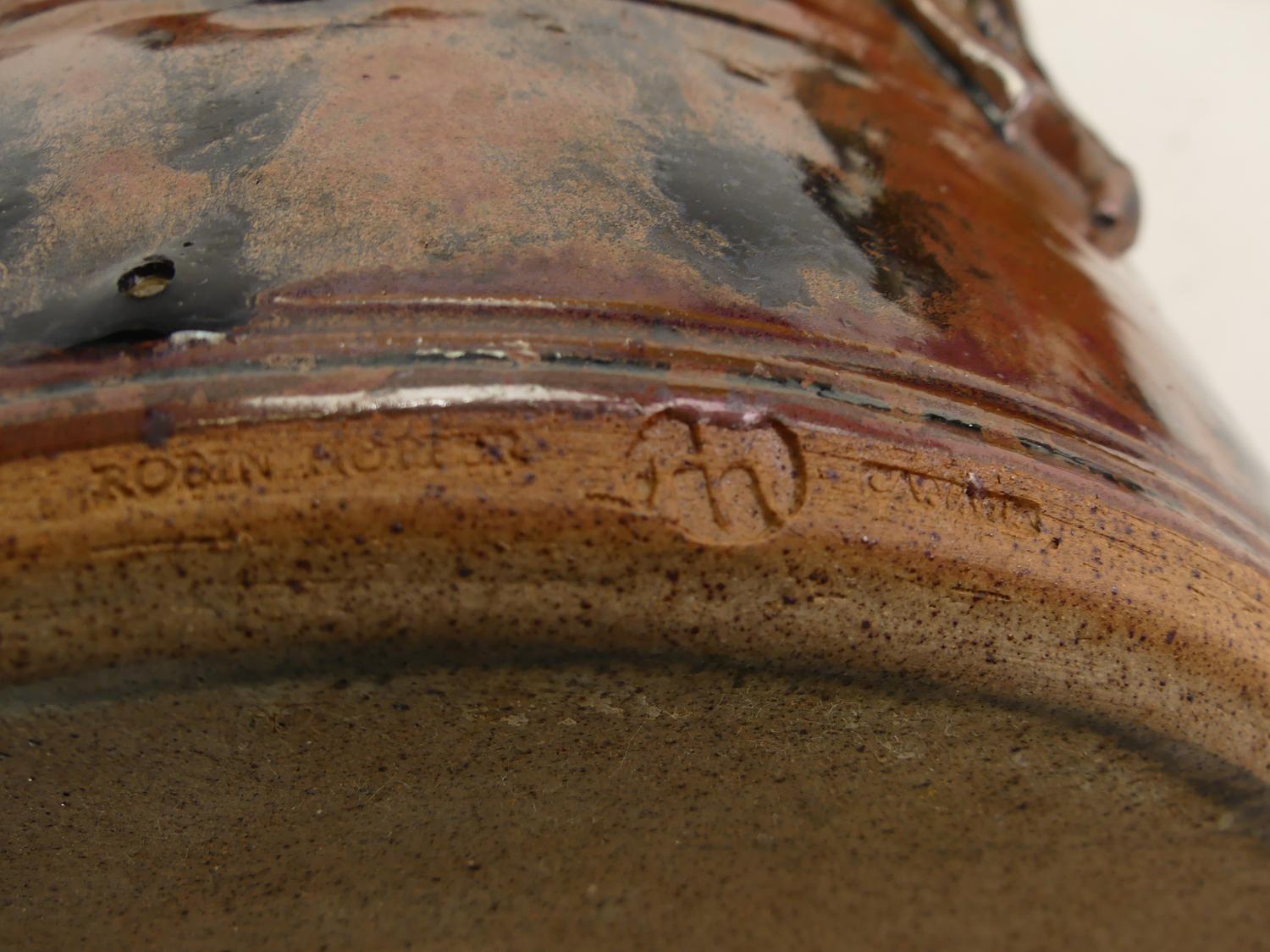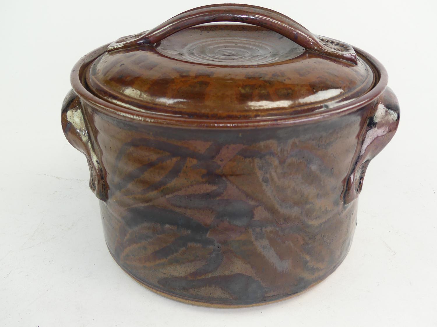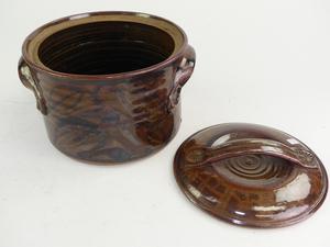 robin hopper art pottery covered two handled pot, 8 1/2" x 11"