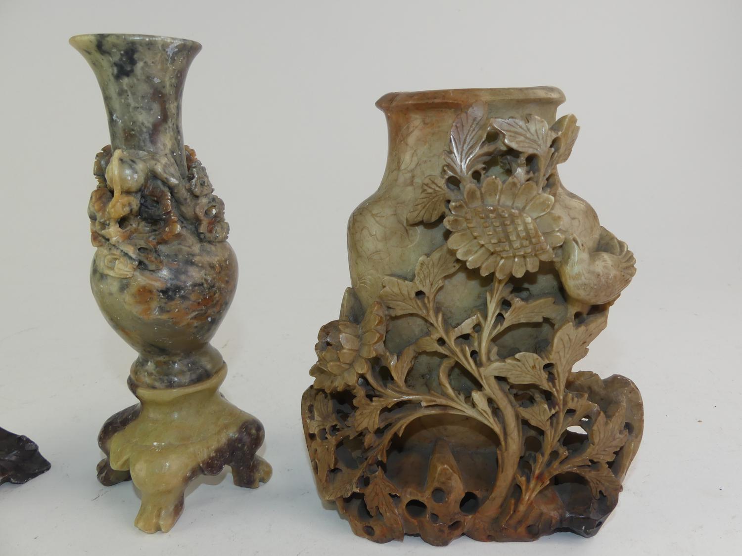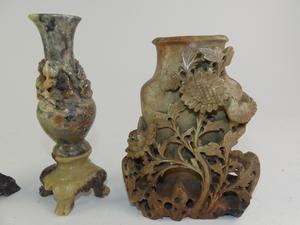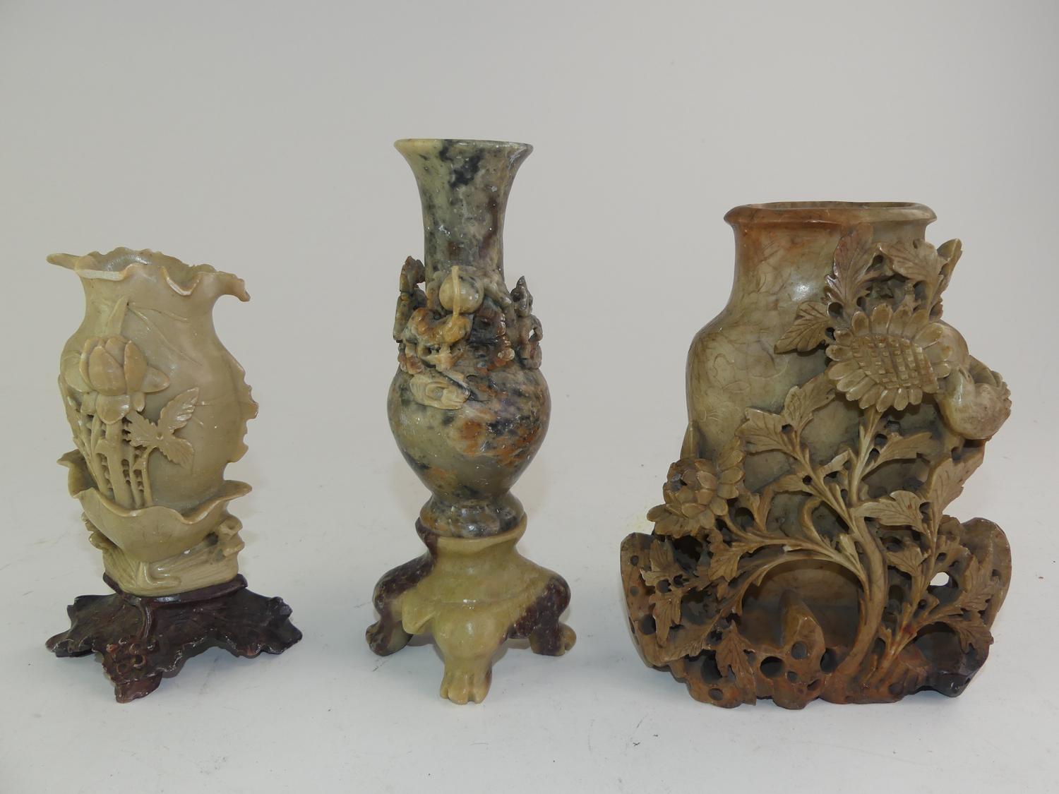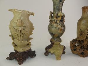 three chinese carved stone vases on stand, ht. 7 1/2"