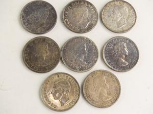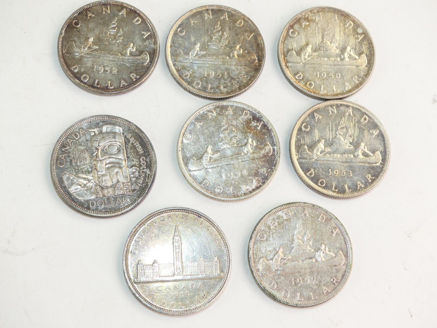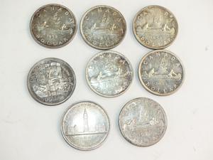 lot of 8 canadian silver dollars, 1939, 50, 51, 52, 53, 54, 57, 58