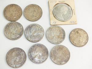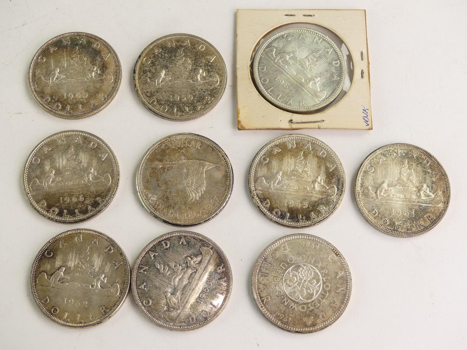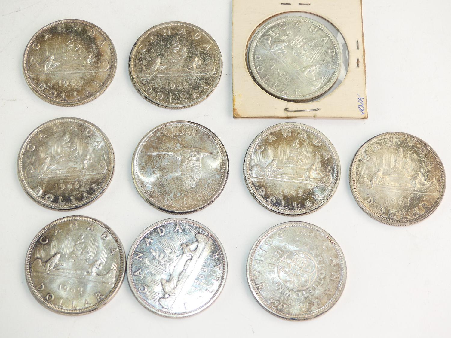 lot of 10 canadian silver dollars, 1955, 60, 61, 62, 63, 64, 65 x 2, 66, 67