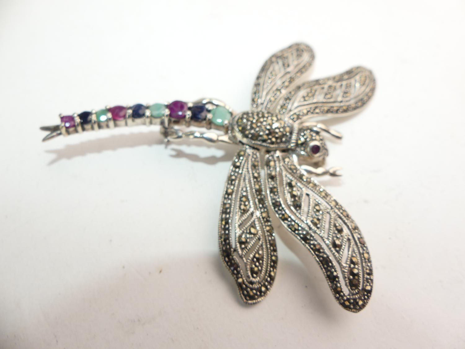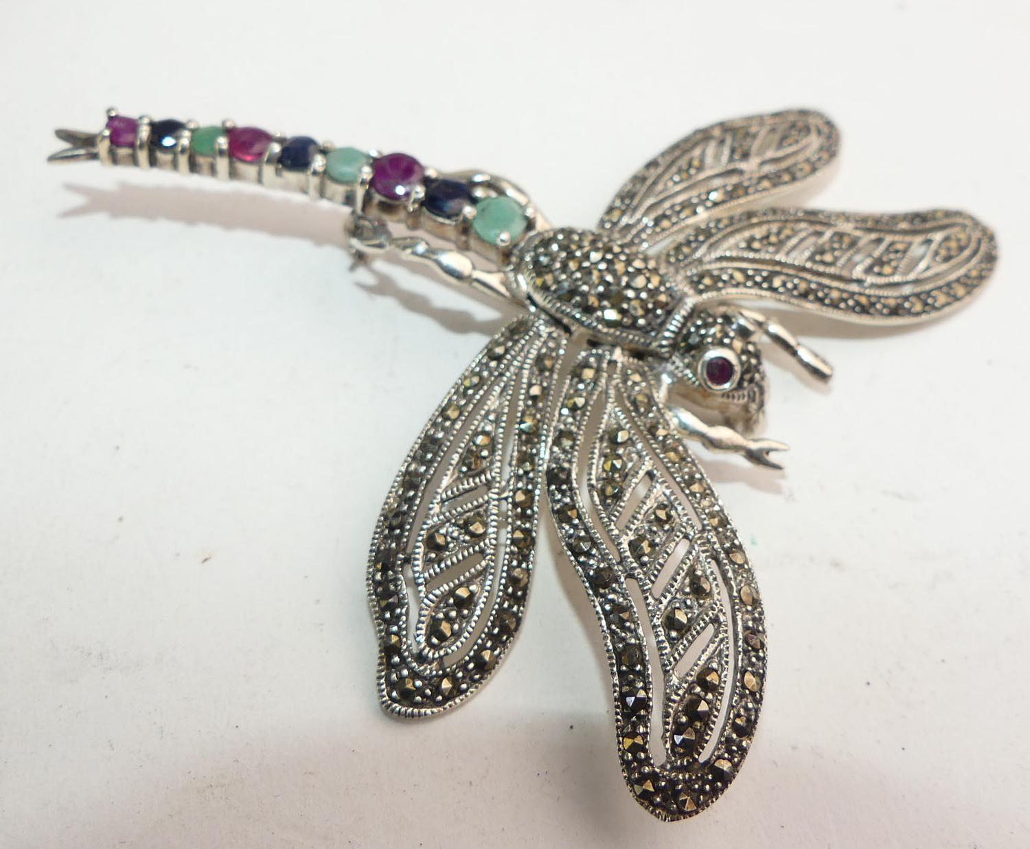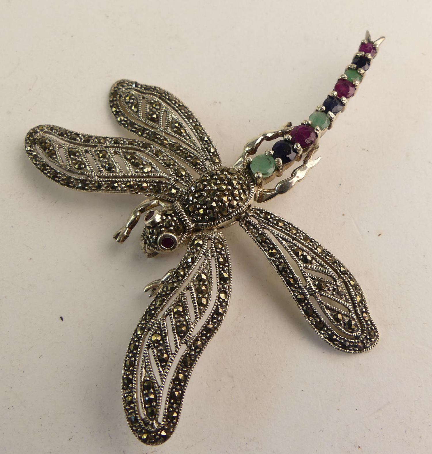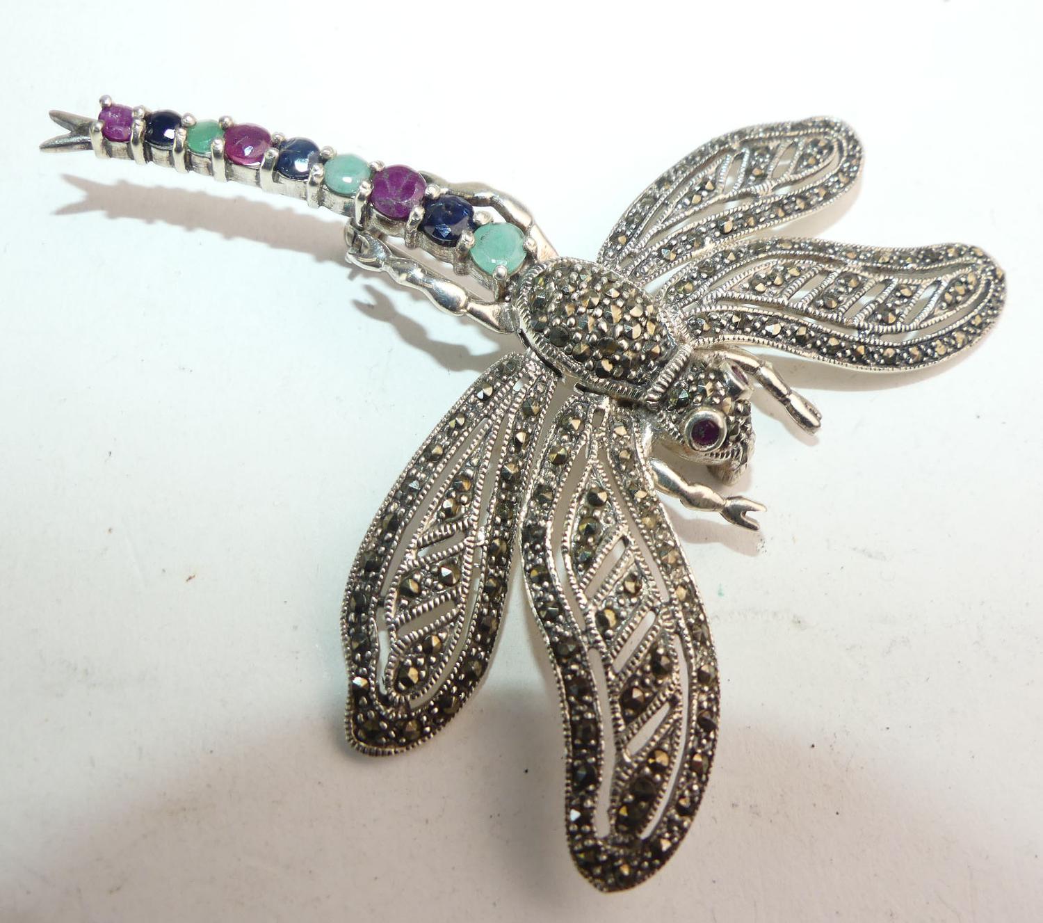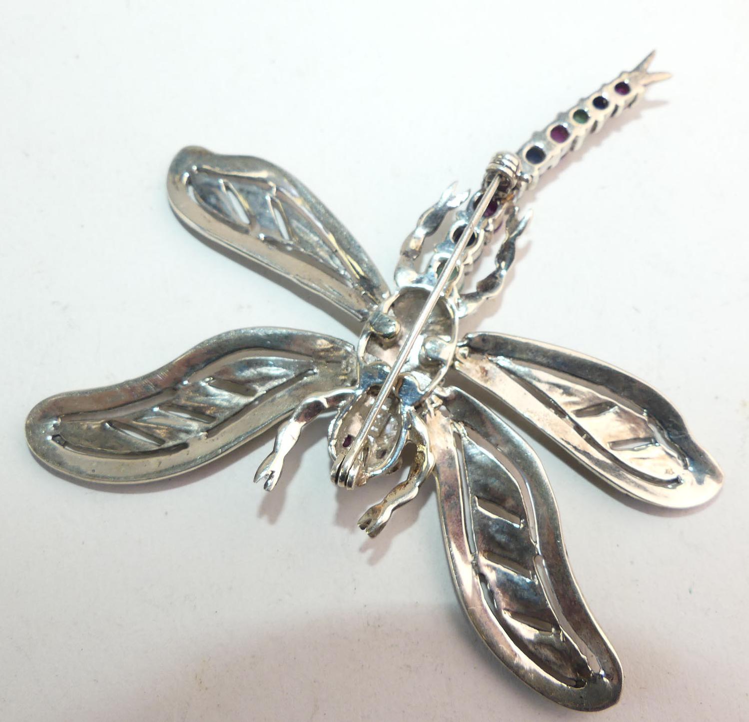 vintage sterling silver gemstone dragonfly brooch, width 3"