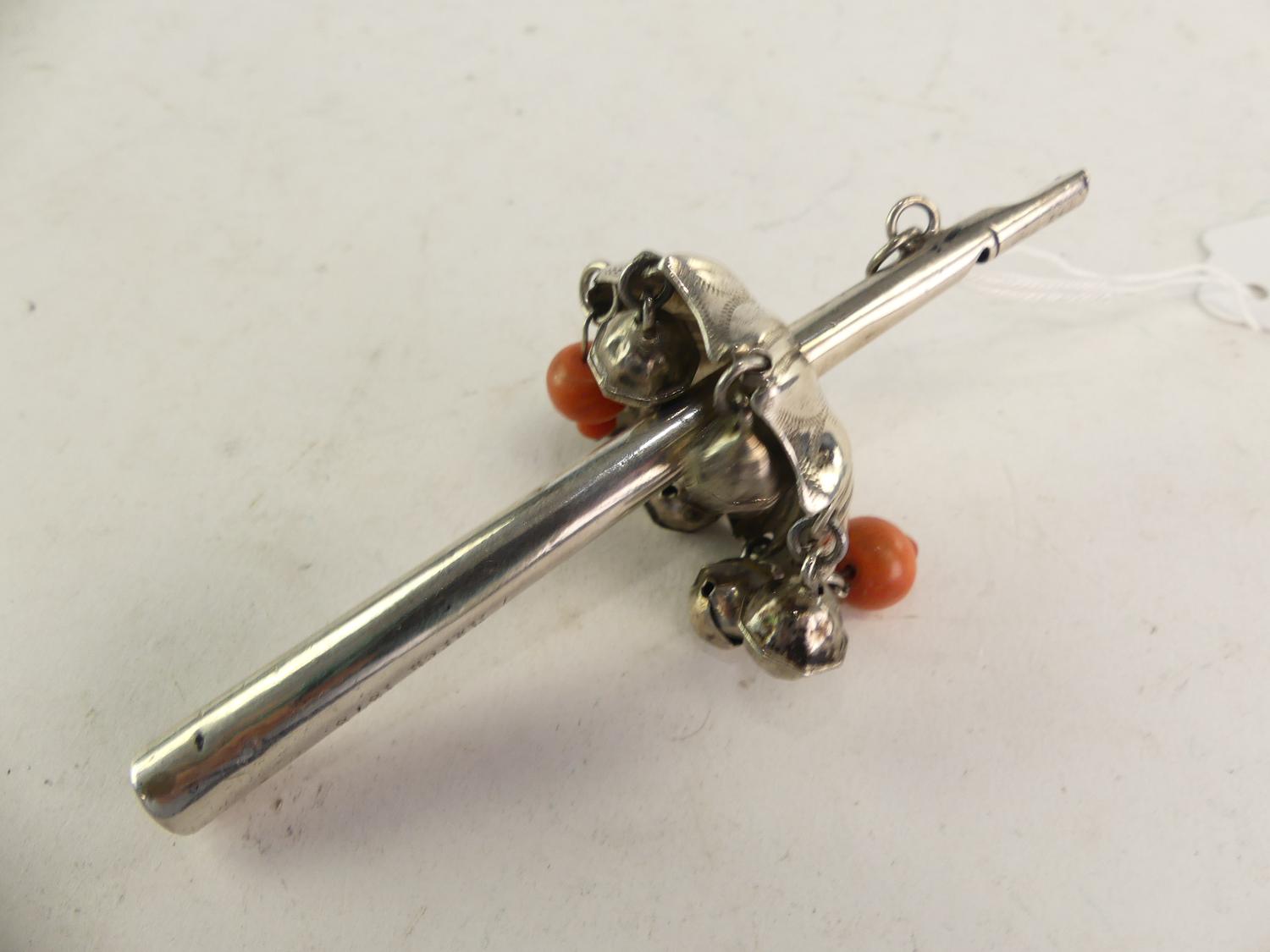 dutch silver baby rattle and whistle with coral bead drops, amsterdam dated 1878, length 4 3/4"