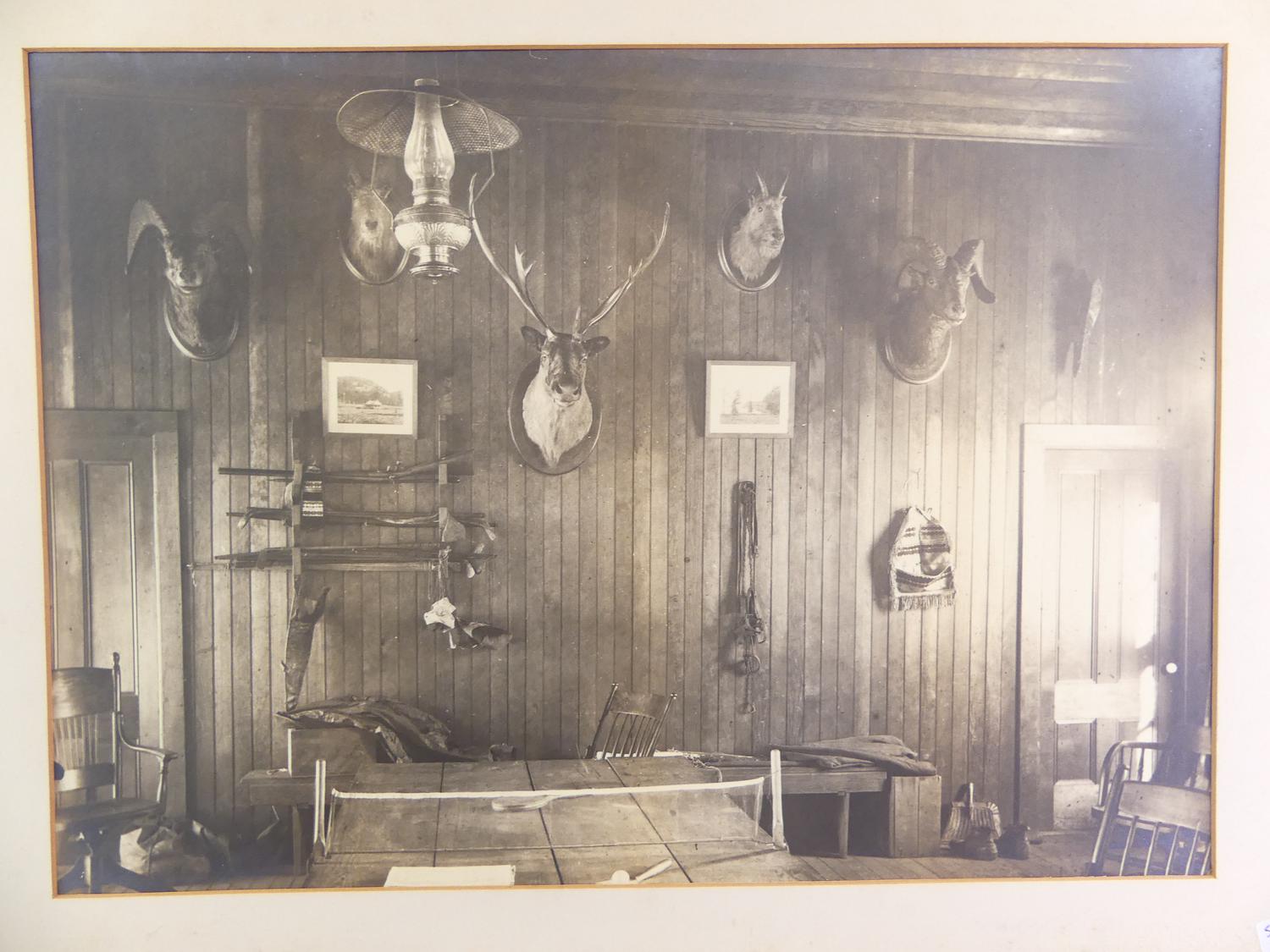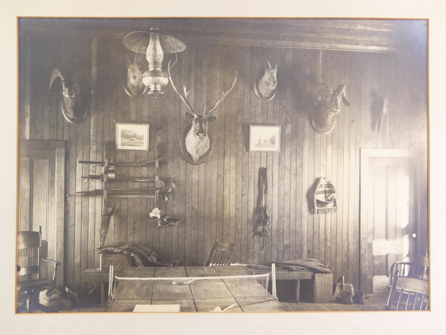enlarged antique photograph of interior scene of hunt camp trophy room, unframed, 12 1/2" x 17 1/2"