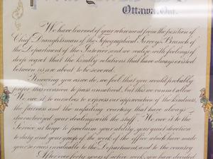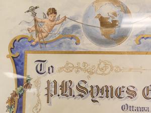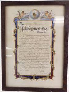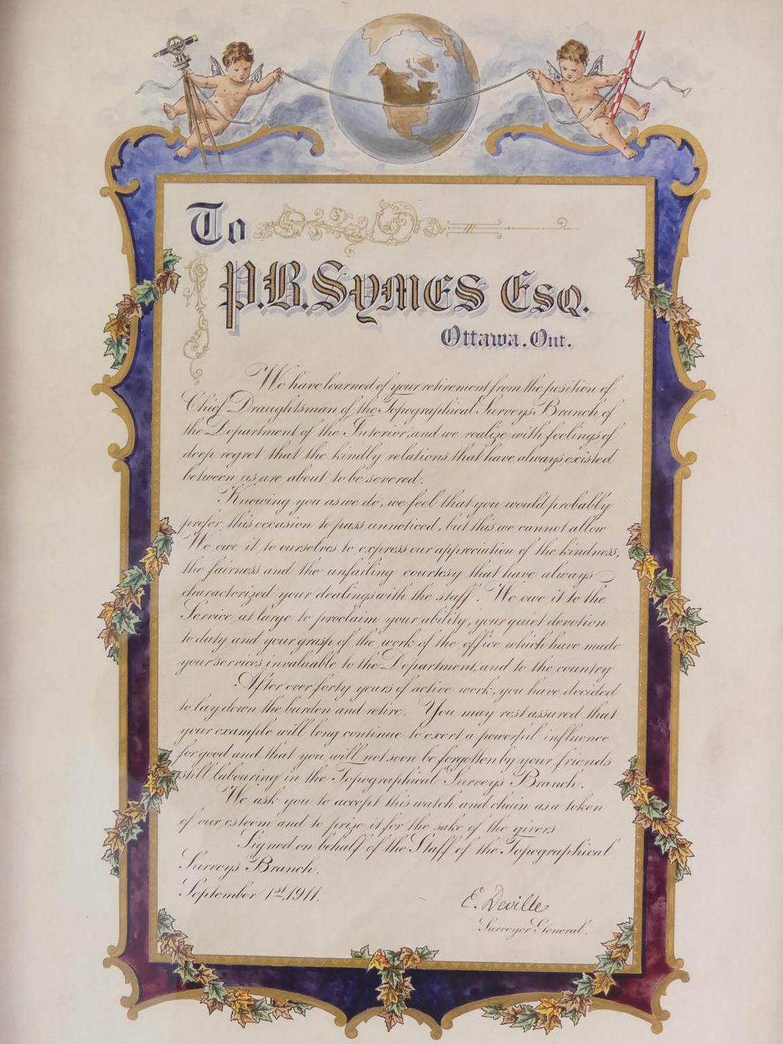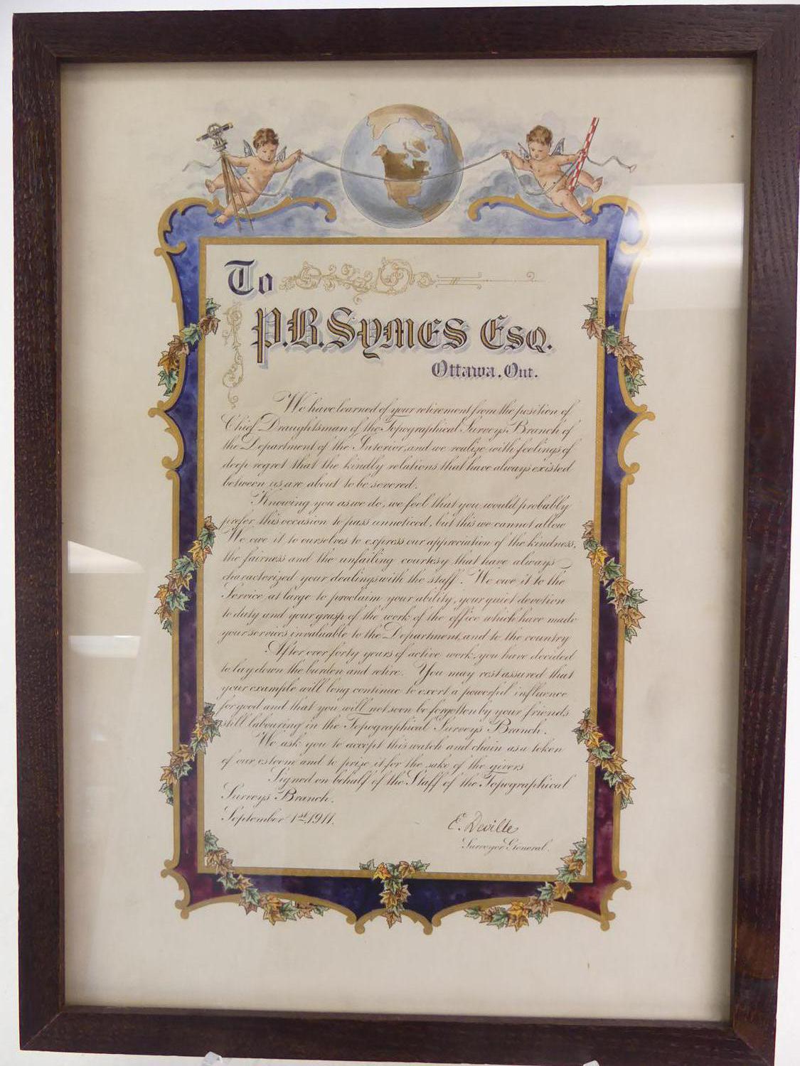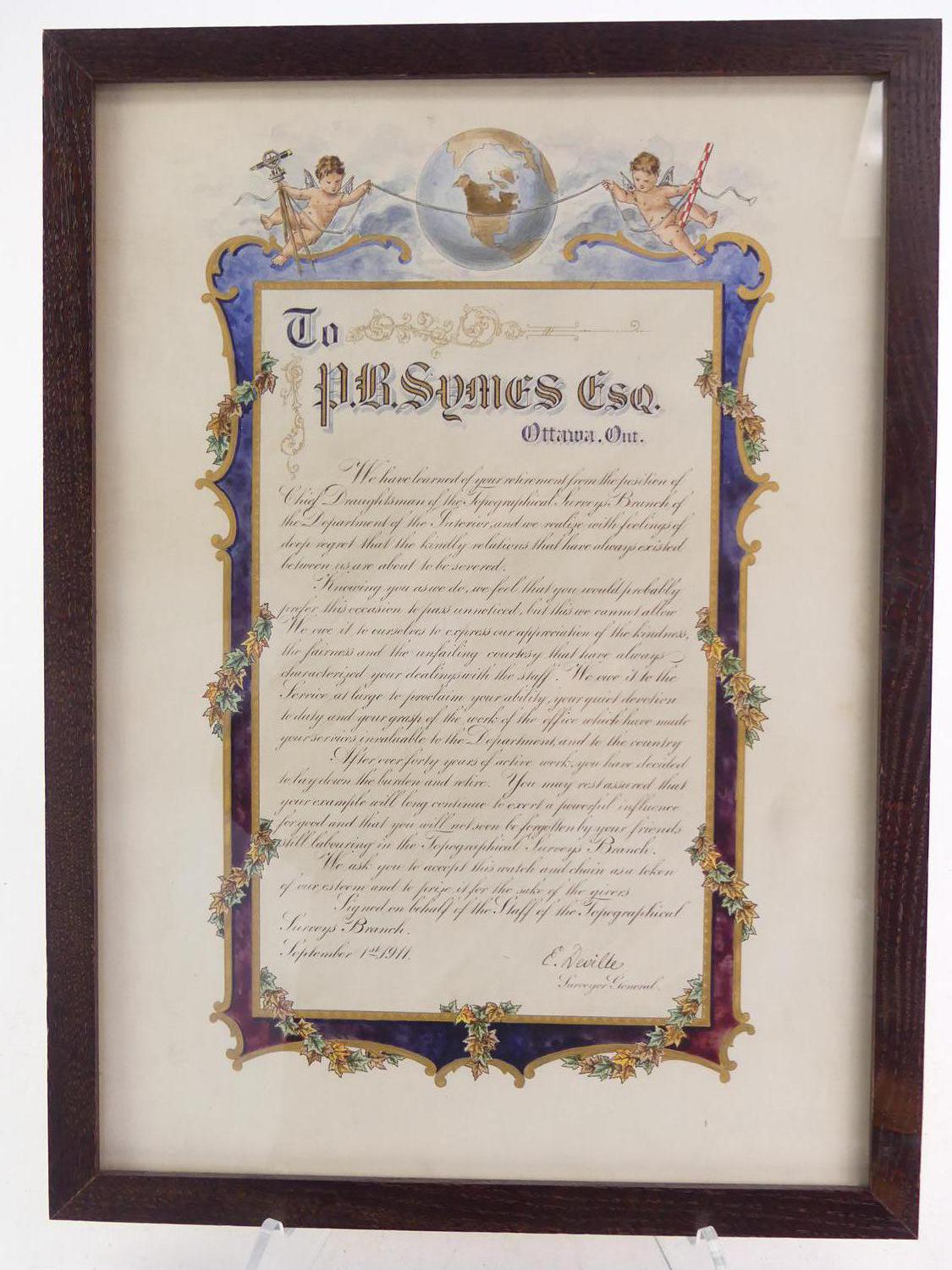 framed hand coloured and gilded drafted letter of recognition to chief draughtsman from the topographical surveys branch, ottawa 1911