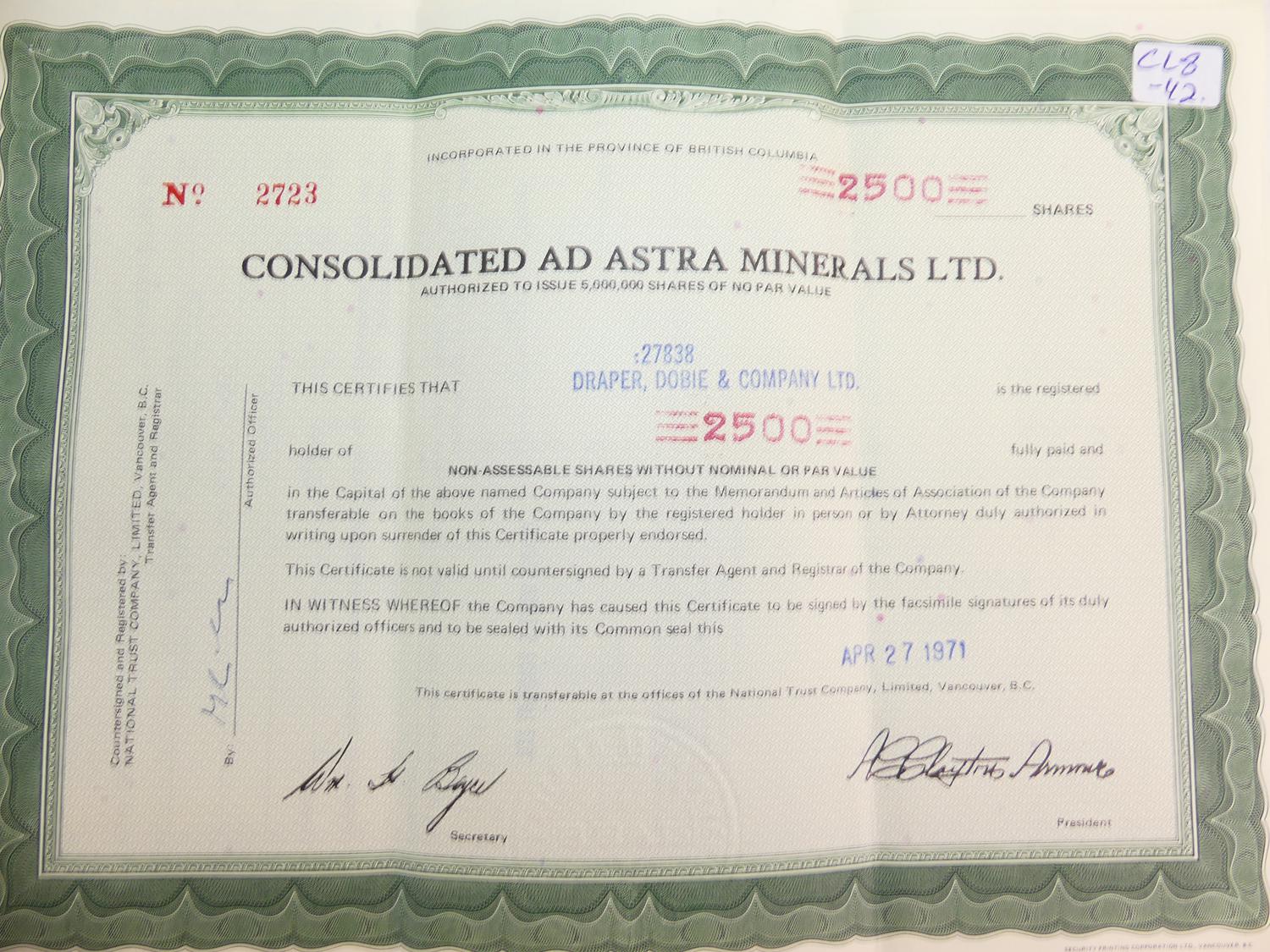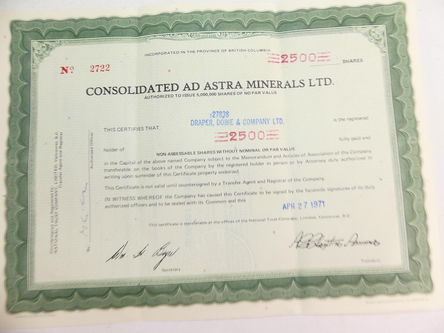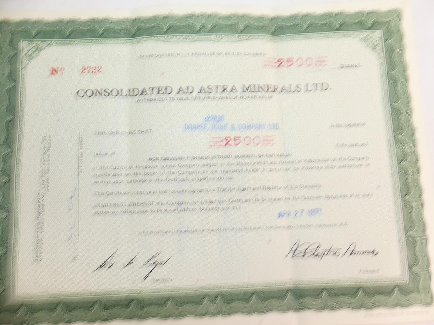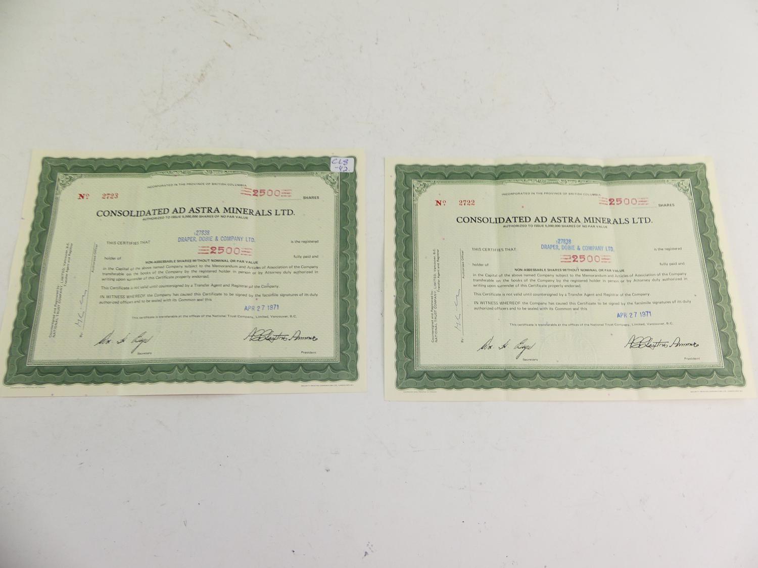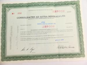 two consolidated ad astra minerals ltd 2500 shares certificates, current stock price as of aug 2025 0.40cents per share