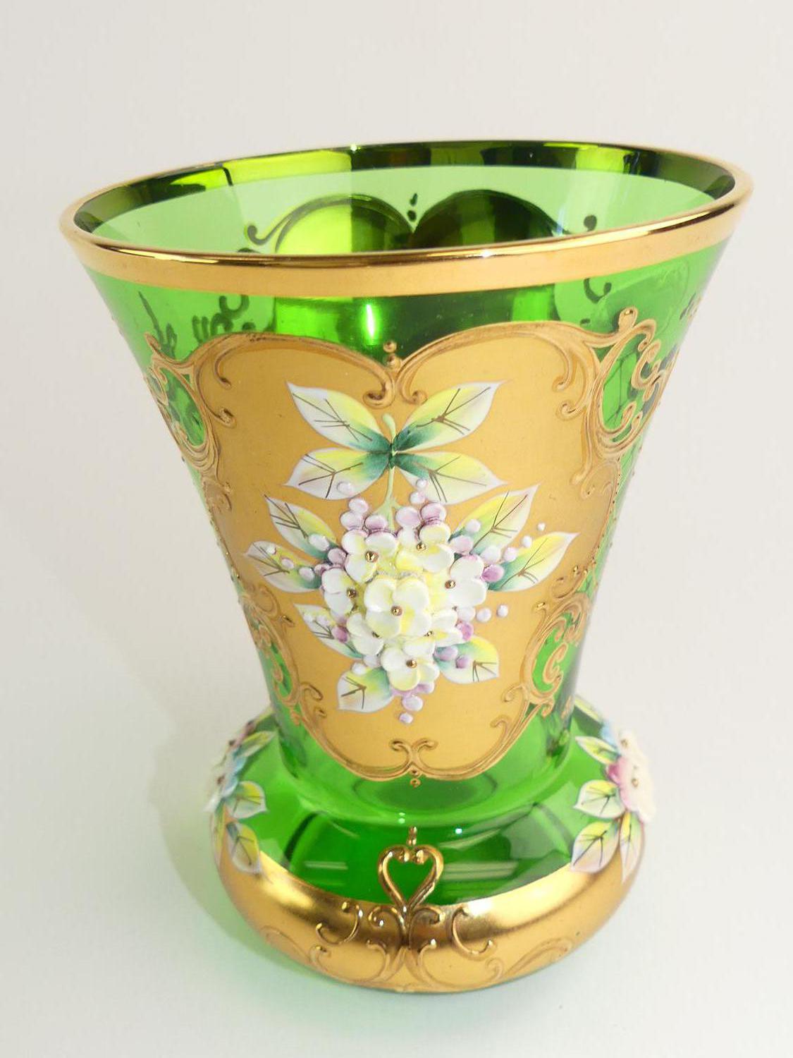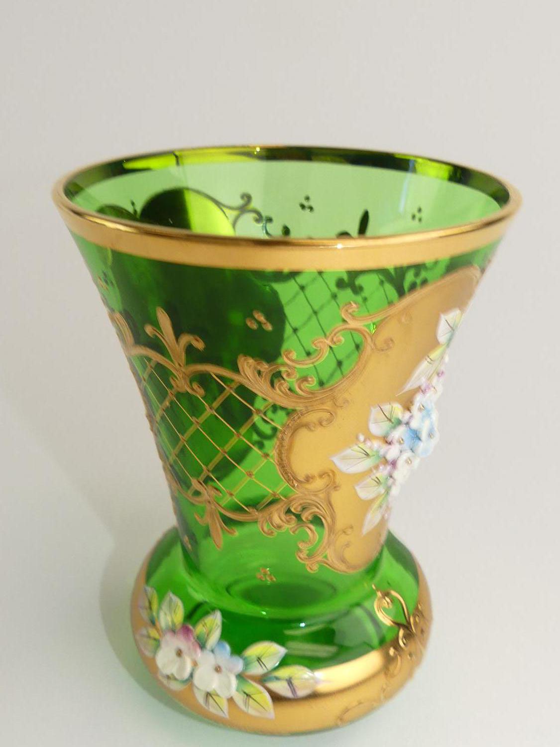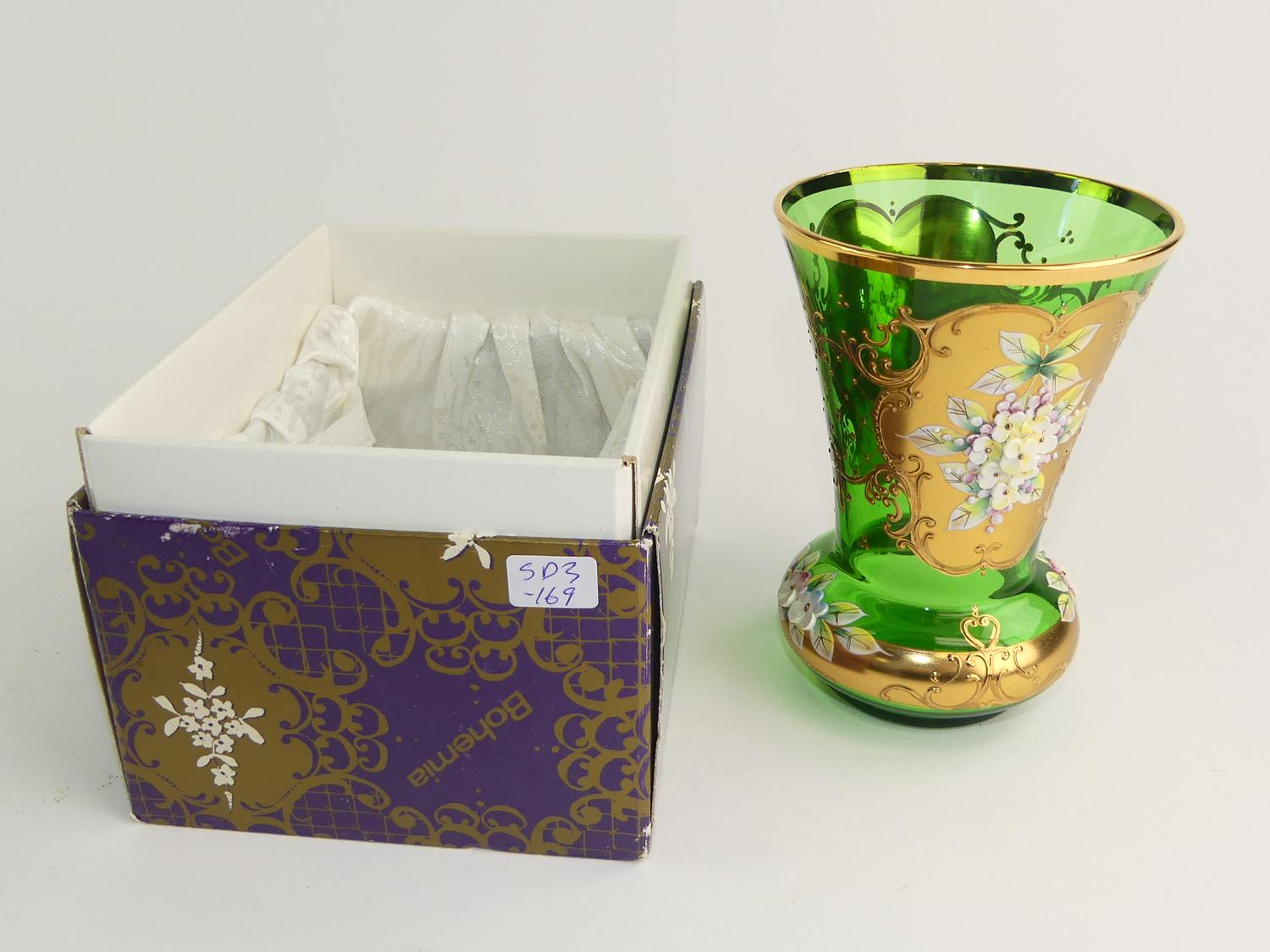 bohemian enamelled green glass vase in original box, ht. 5 1/2"