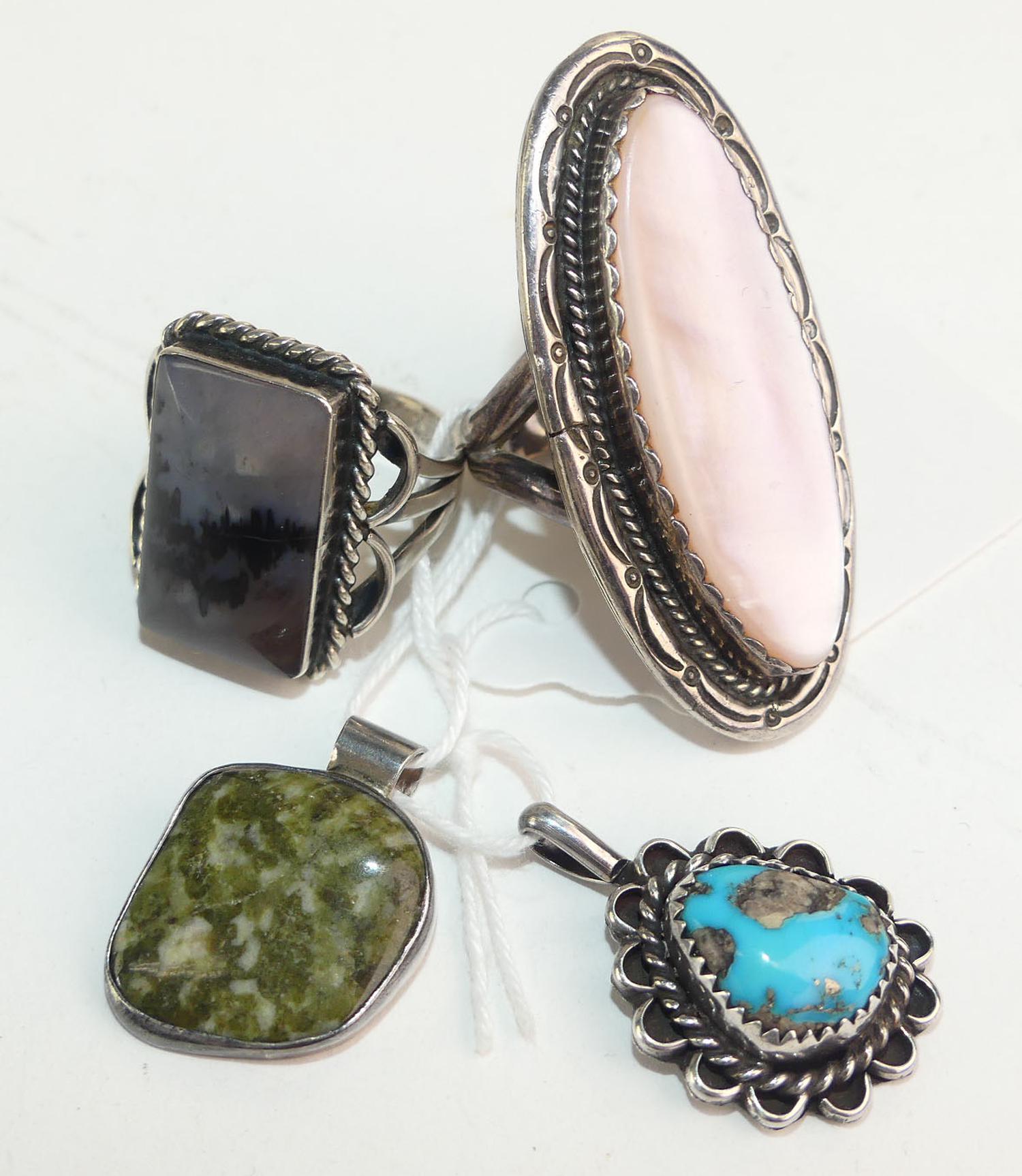 signed navajo mother-of-pearl ring, wd, moss agate ring and two pendants, 34 grams