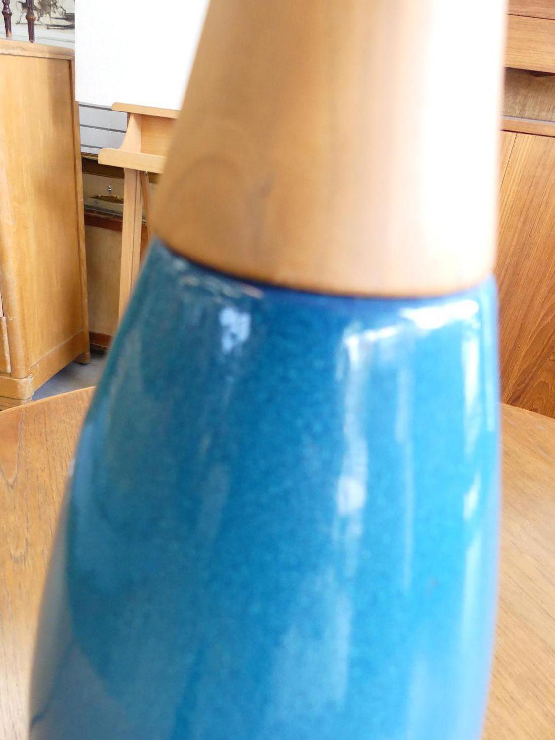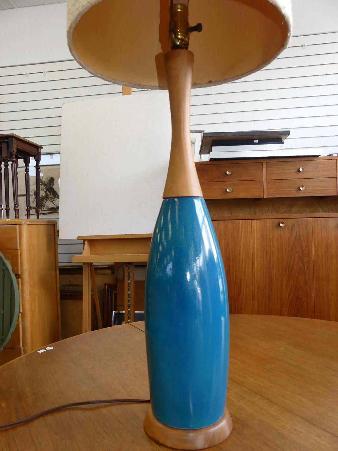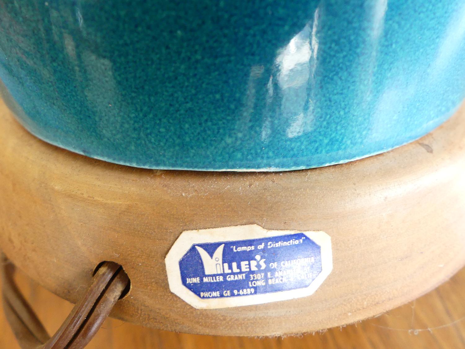 mid century teak and ceramic table lamp, by millers of california, ht.