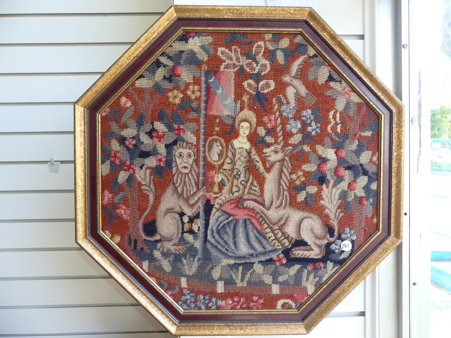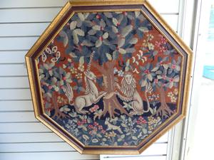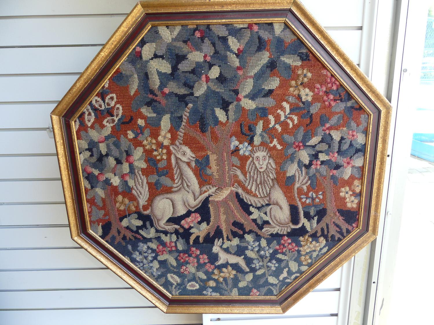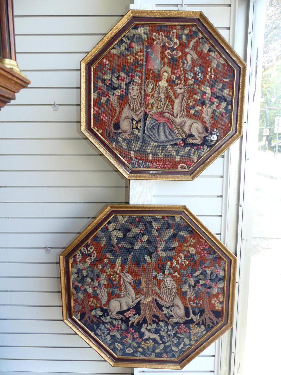 two unicorn tapestry pattern hooked panles, 27" x 27"