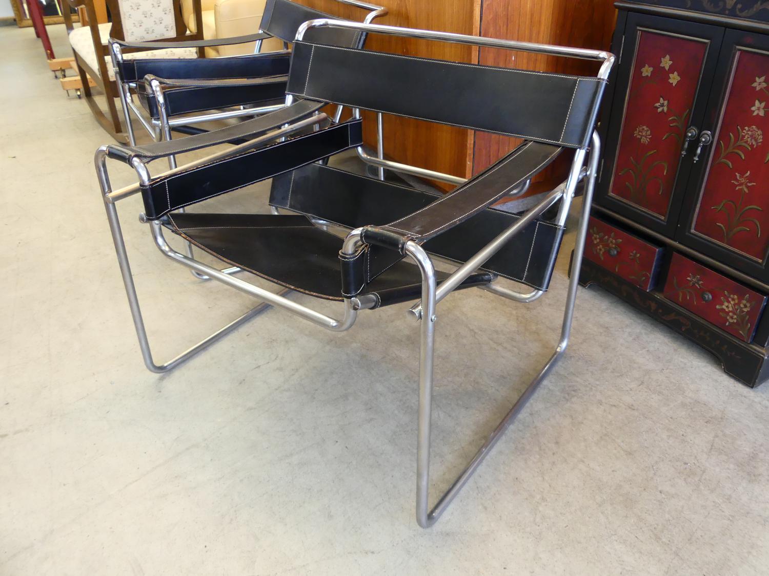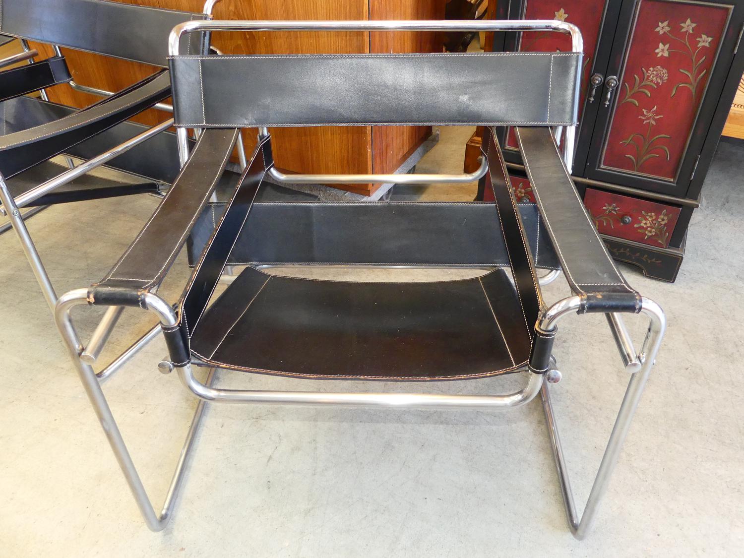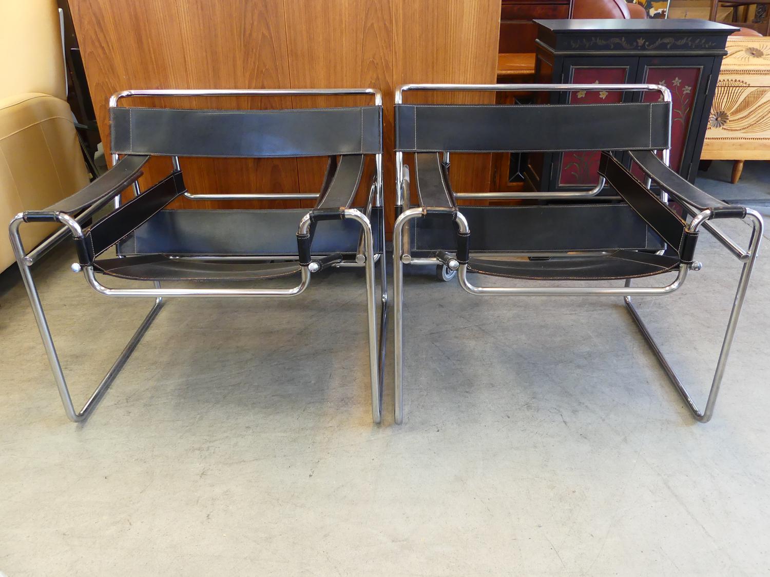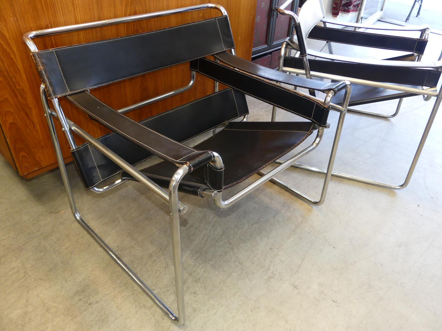 pair of wassily armchairs, designed by marcel breuer in 1925, black leather tubular steel, late 20th century.