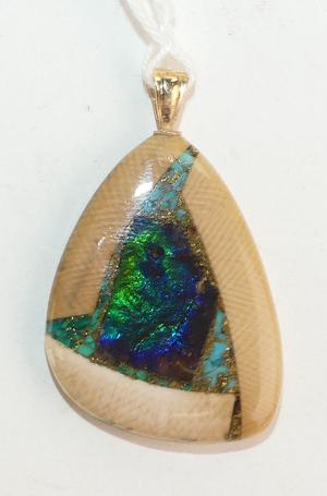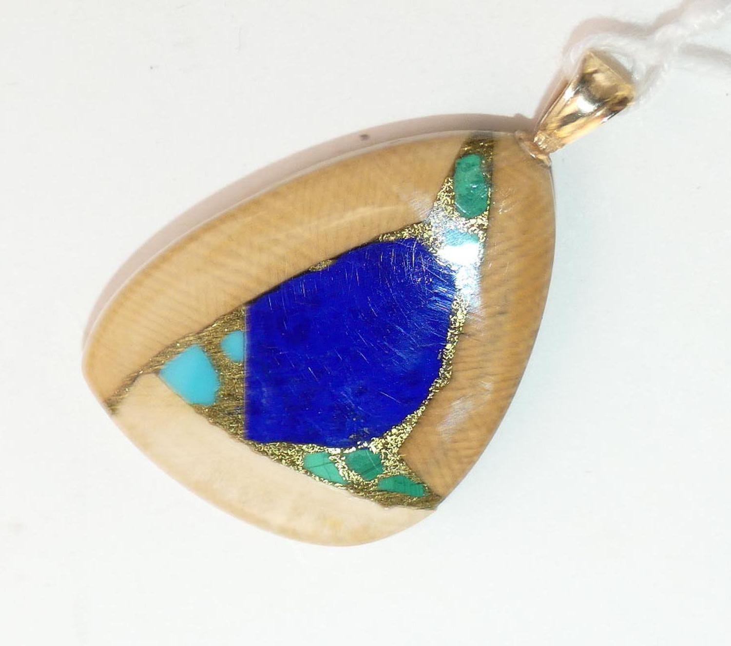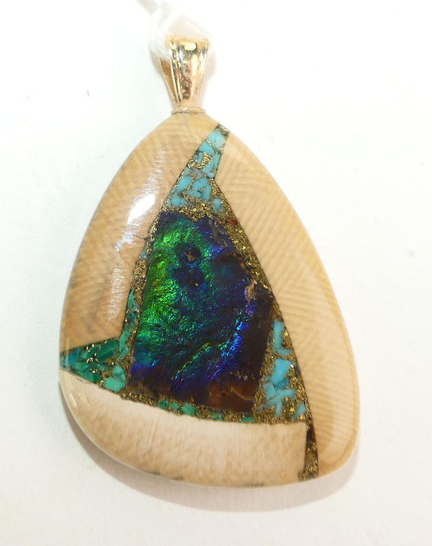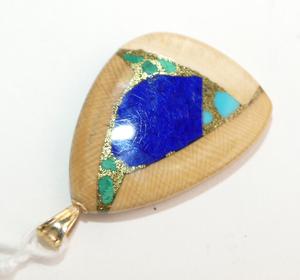 14k yellow gold pendant, ammolite, lapis, malachite, and bone, height 1 1/2"