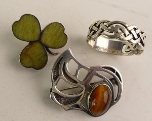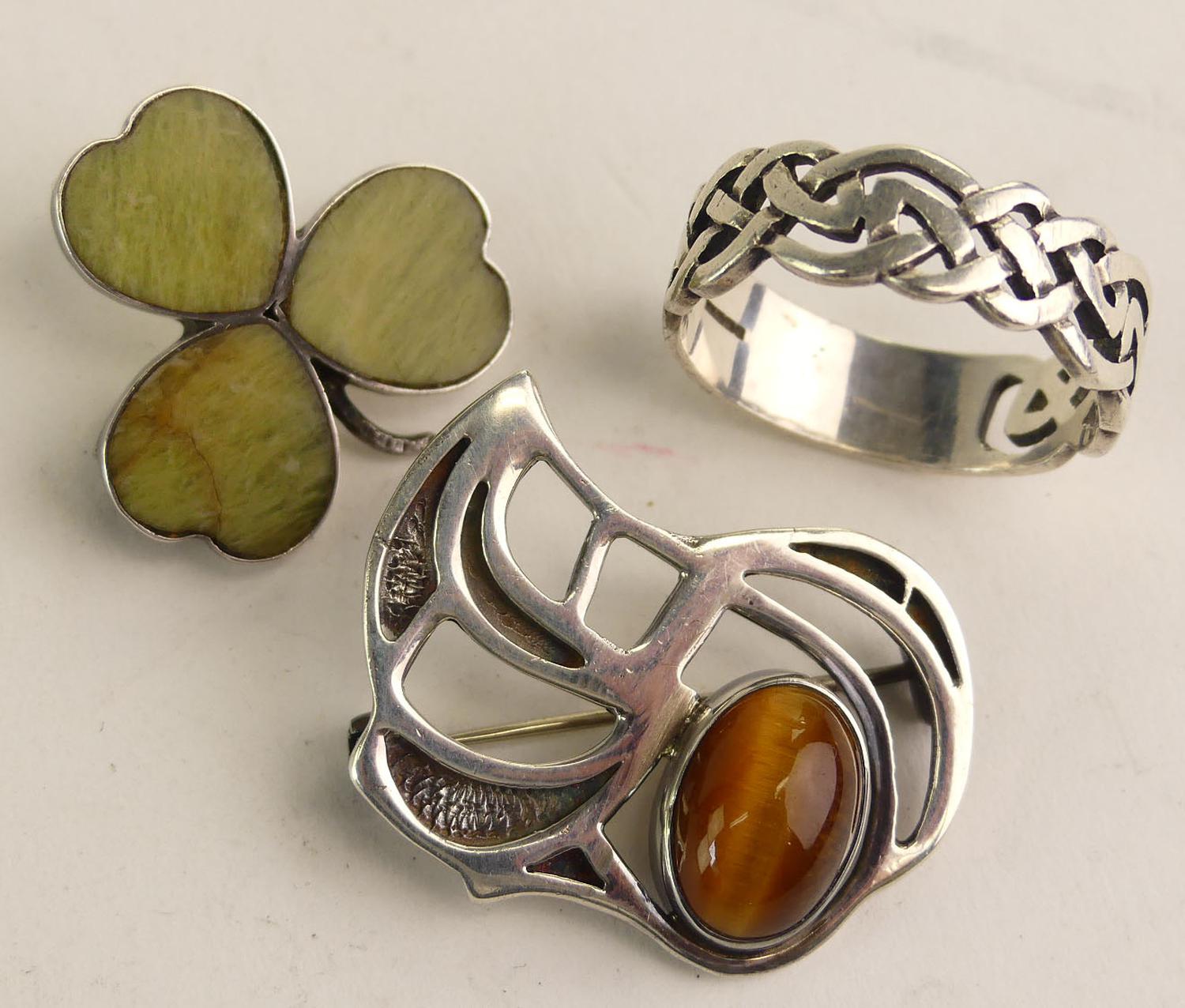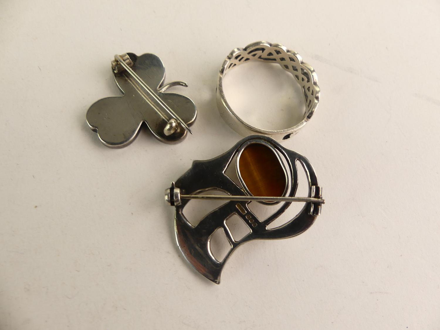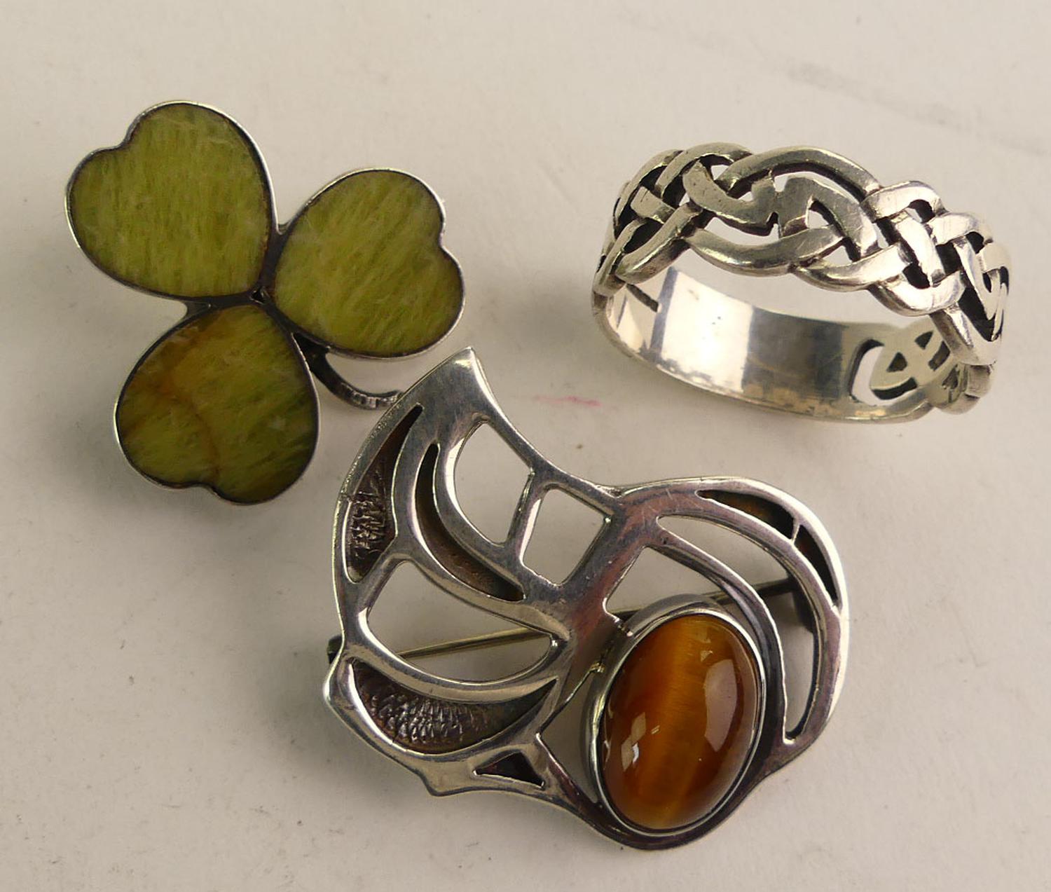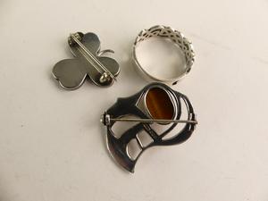 sterling silver irish clover brooch, ring and tigers eye brooch
