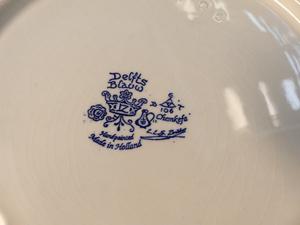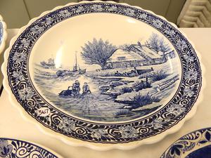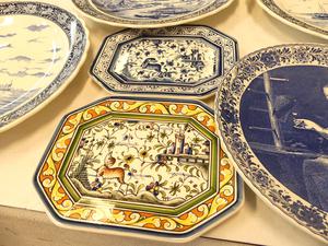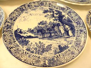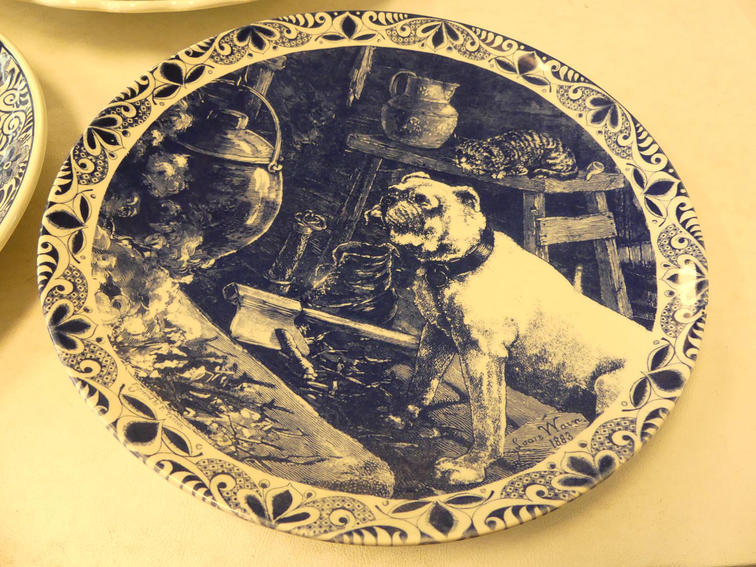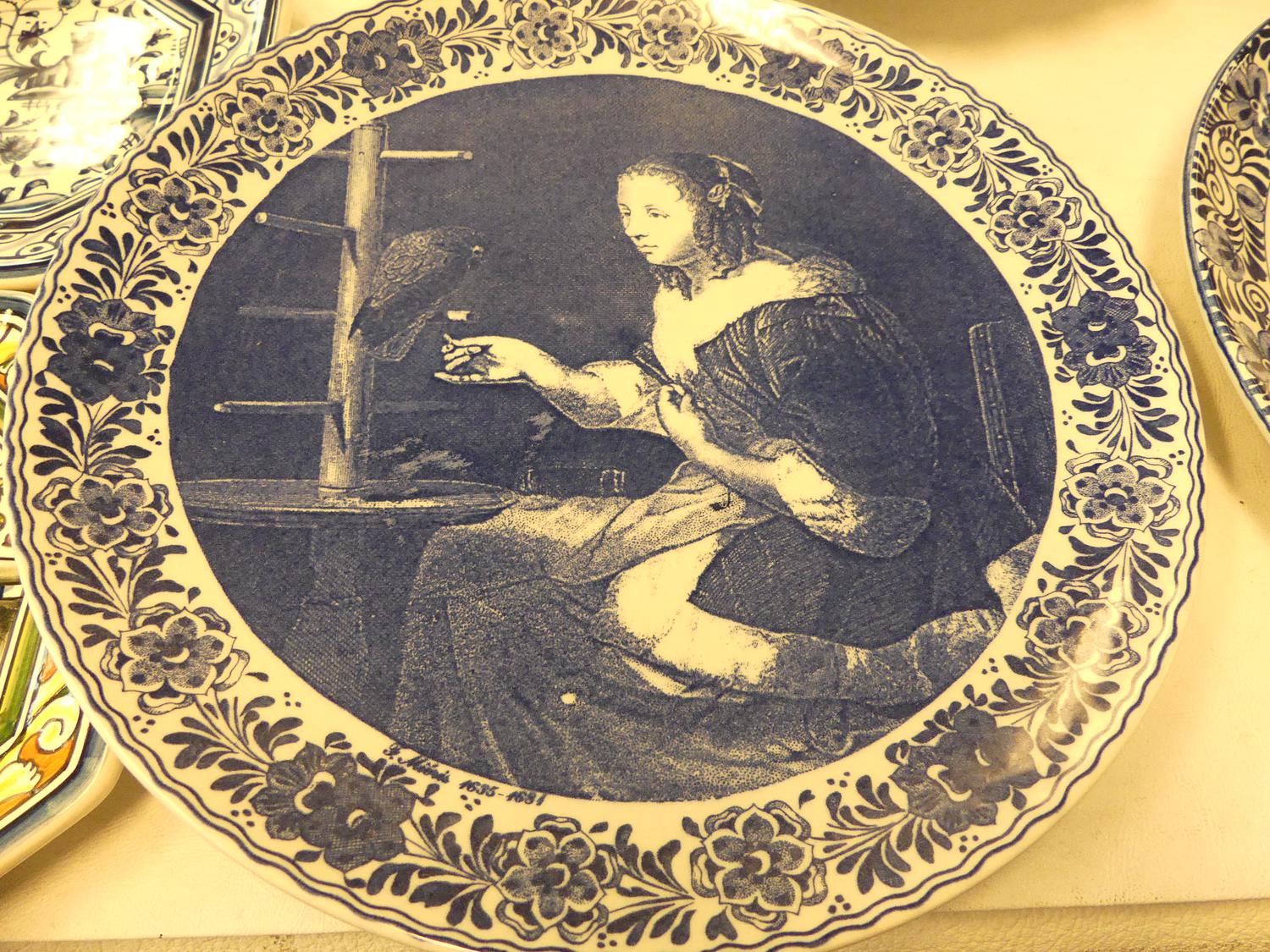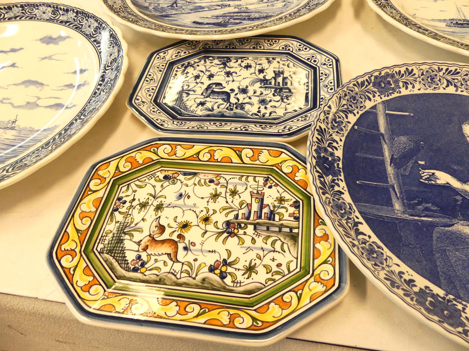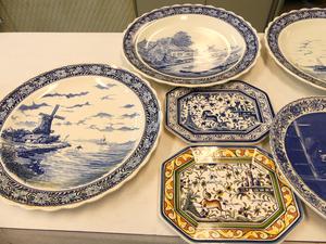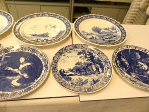 lot of delft blue and white wall chargers and platters