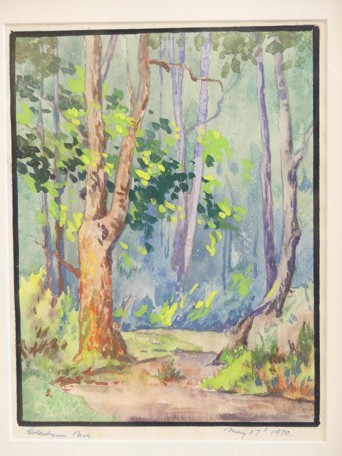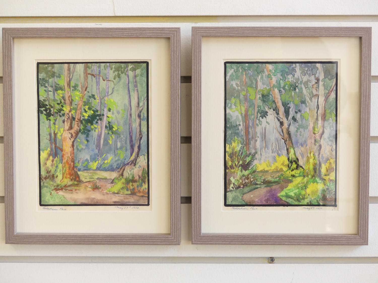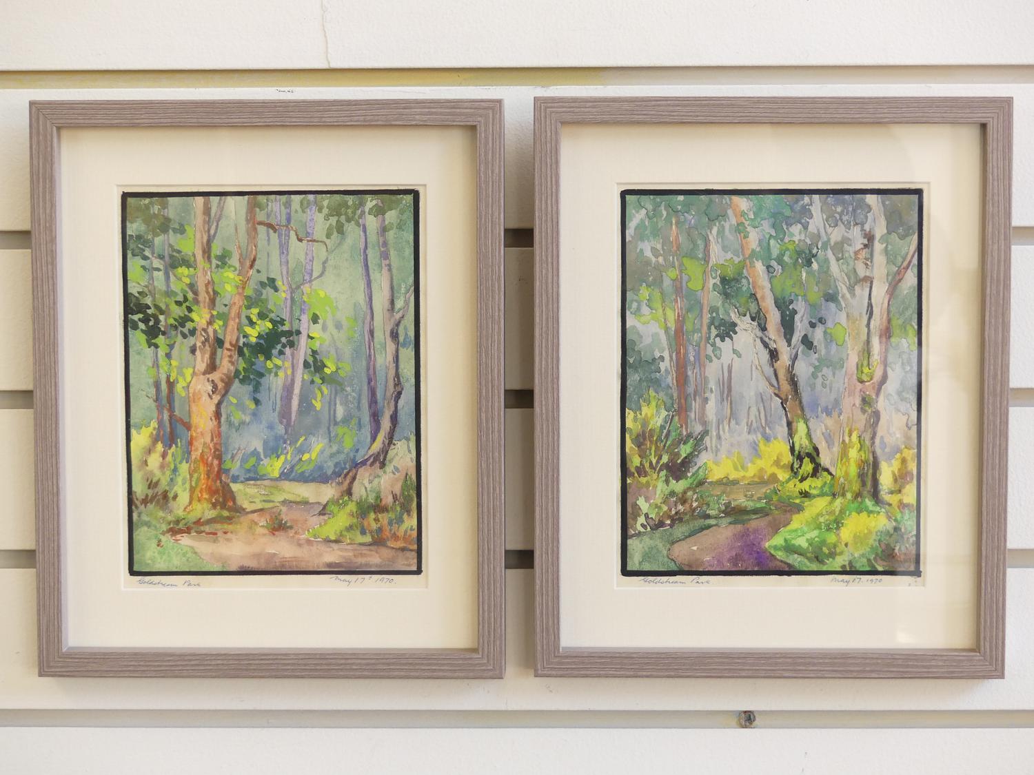 pair of reginald l. harvey (1888-1973), watercolours, 7 1/2" x 5 1/2", "goldstream park - may 17th 1970"