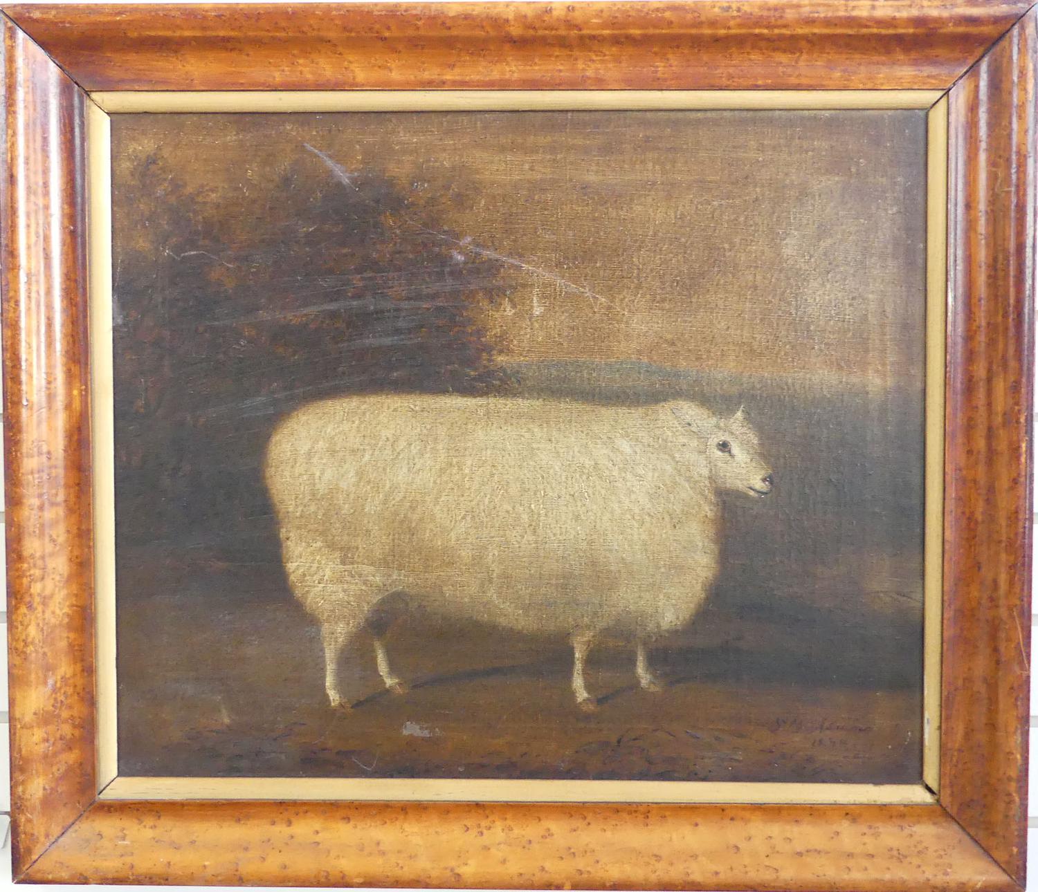 g.b.munro, oil on canvas dated 1858, 20" x 24", "champion sheep", in an birds-eye-maple frame