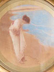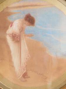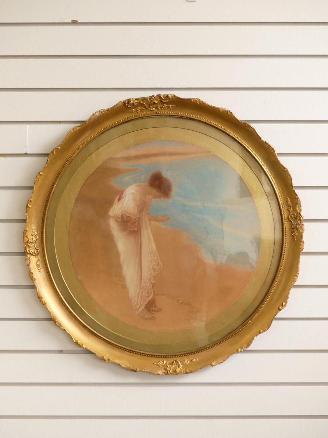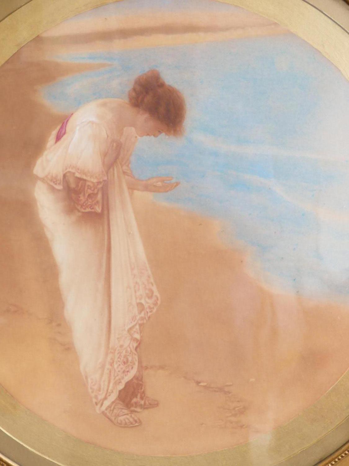 art nouveau gilt framed lithograph, overall 25", "young lady collecting shells"
