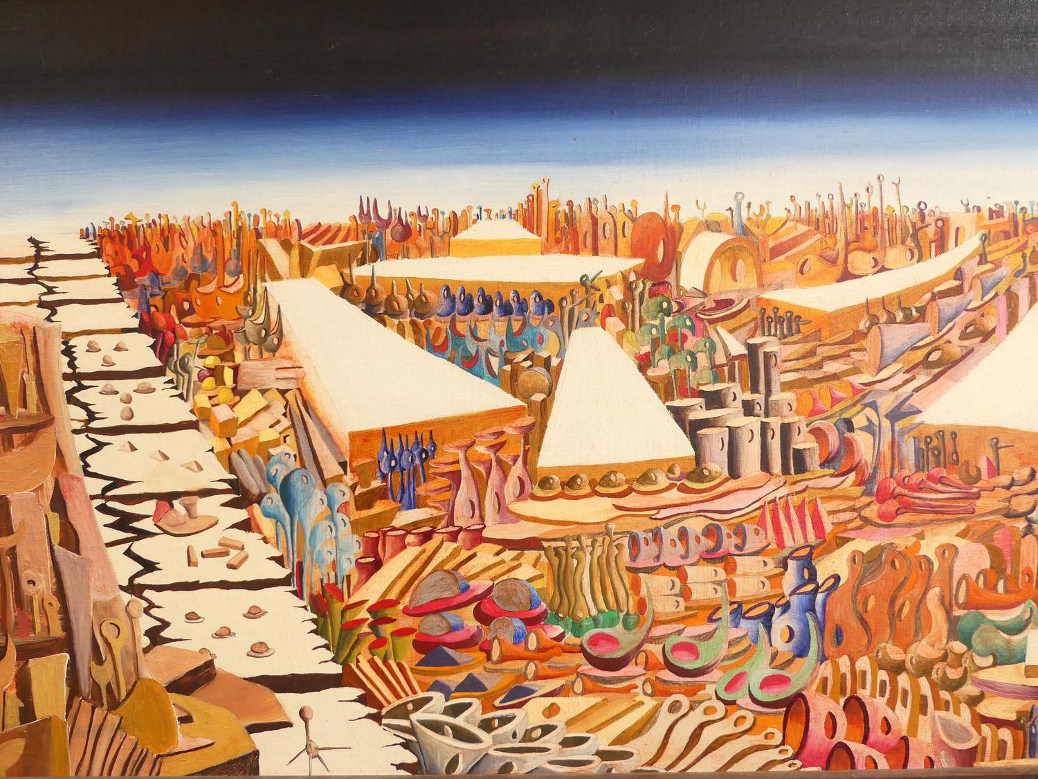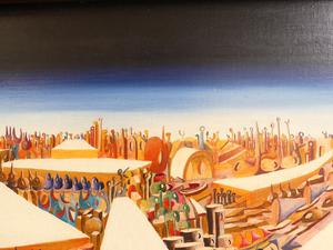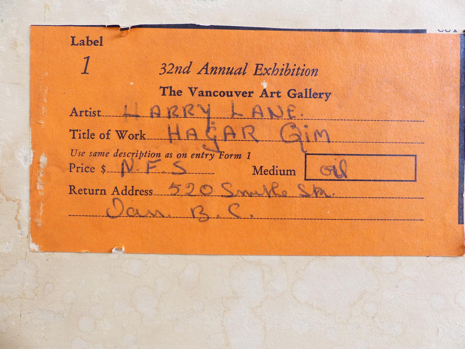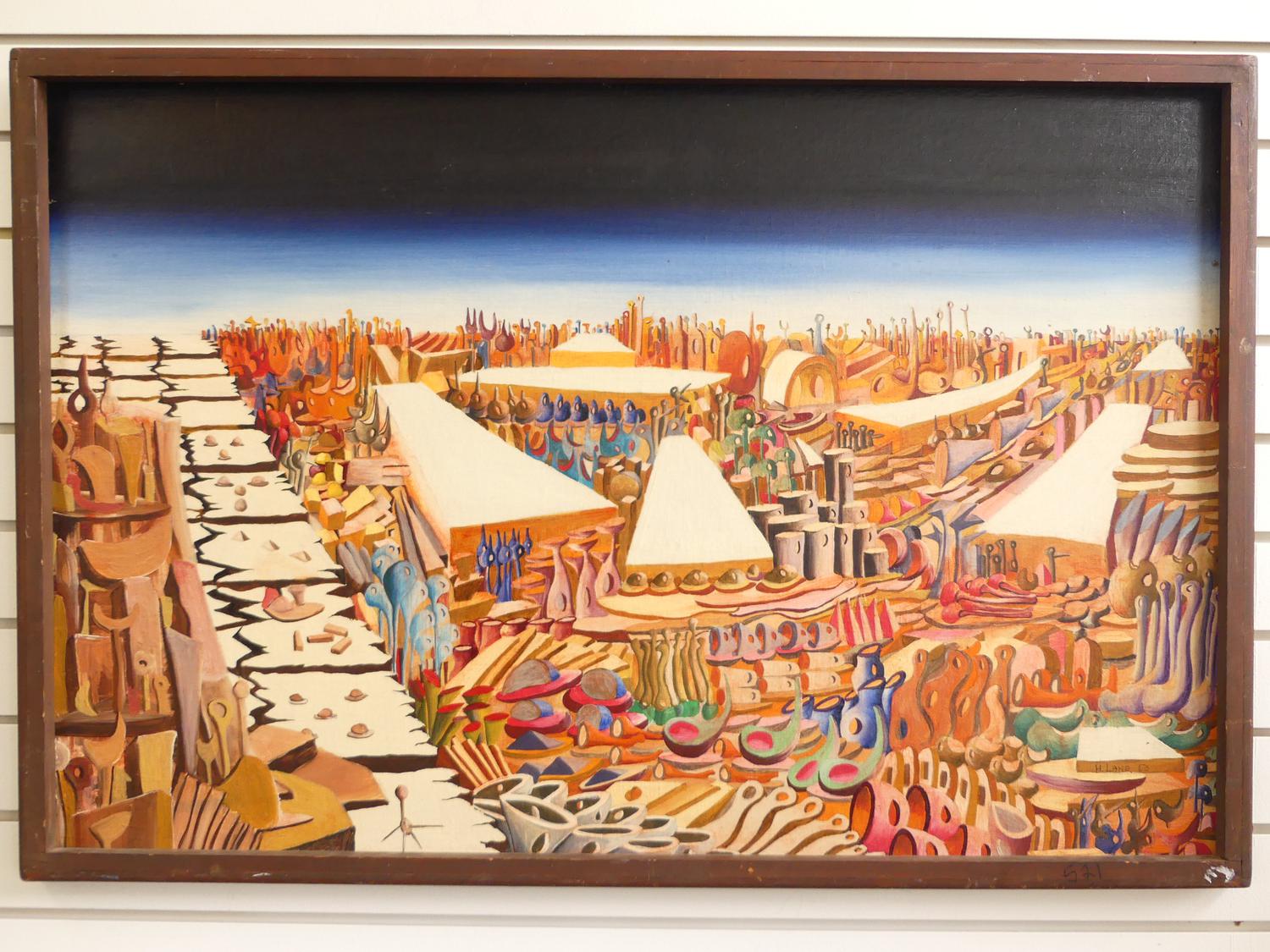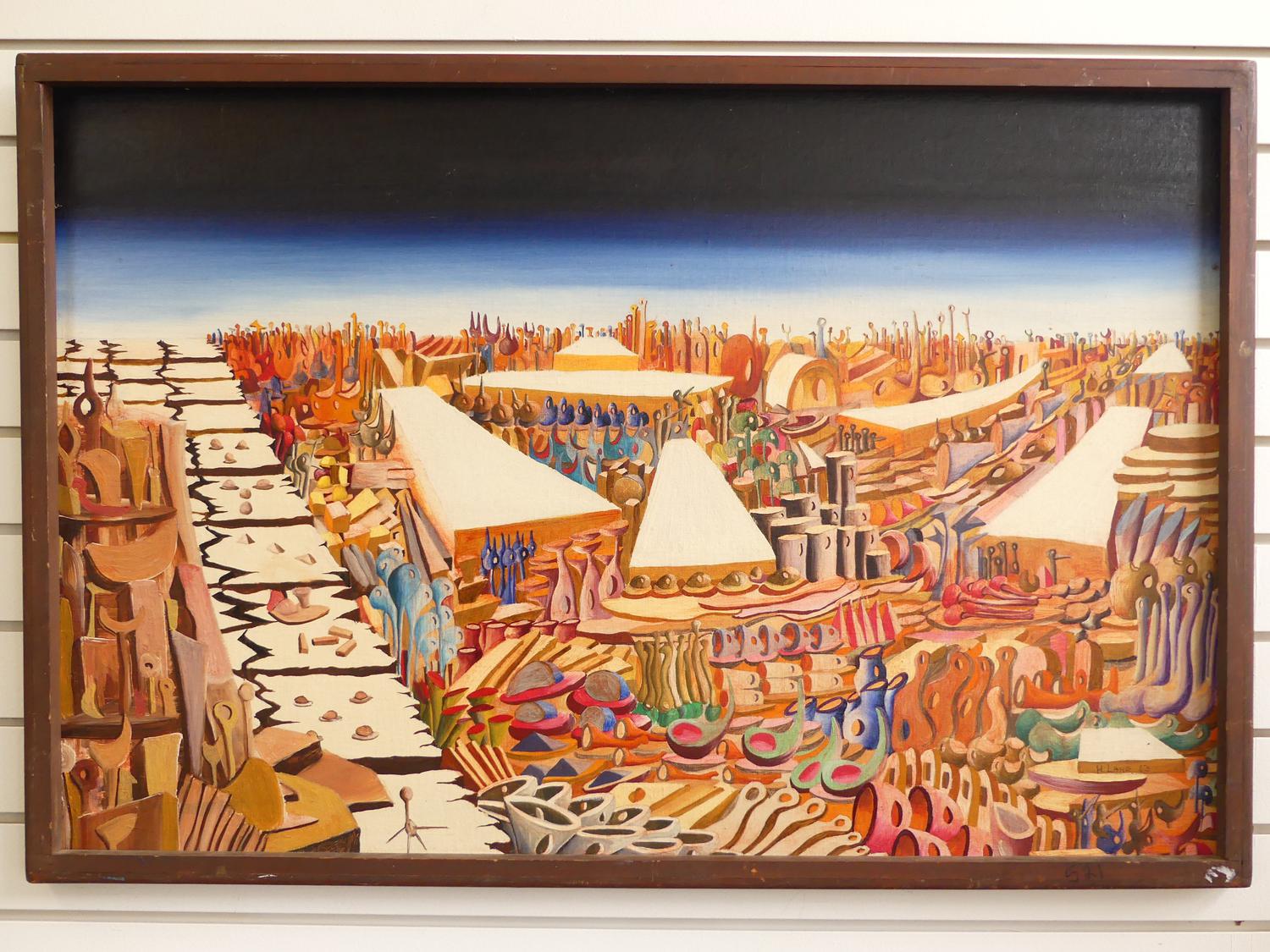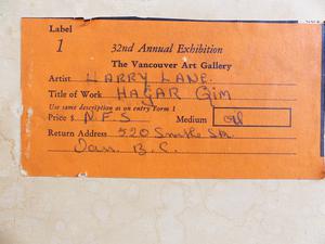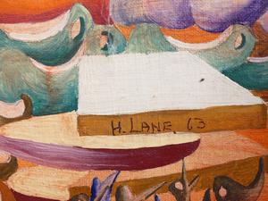 harry lane, dated 1963, oil on board, 24" x 36", "hagar qim", with the vancouver art gallery 32nd annual exhibition label