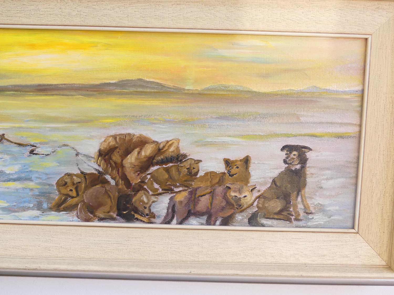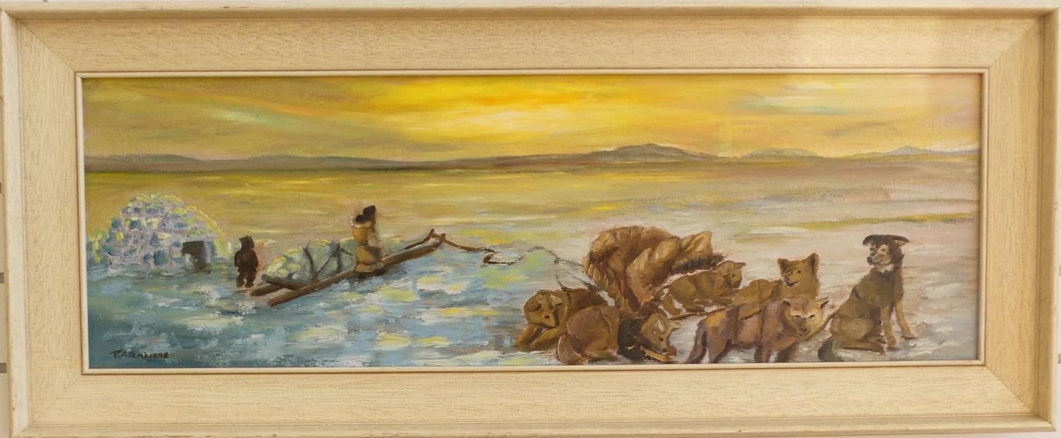rose allenbrand, dated 1974, oil on board, 10" x 30", "moving on"