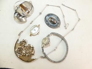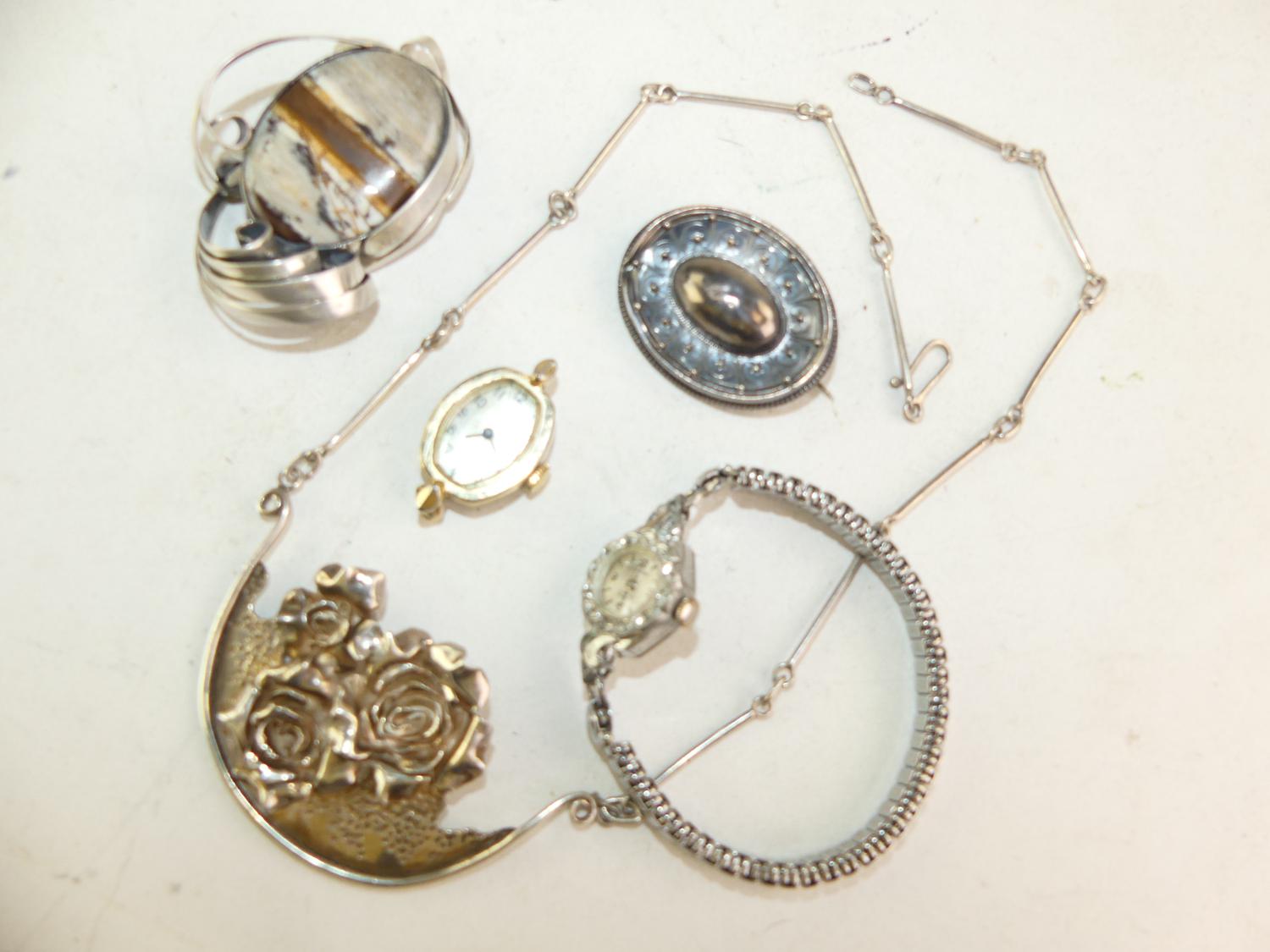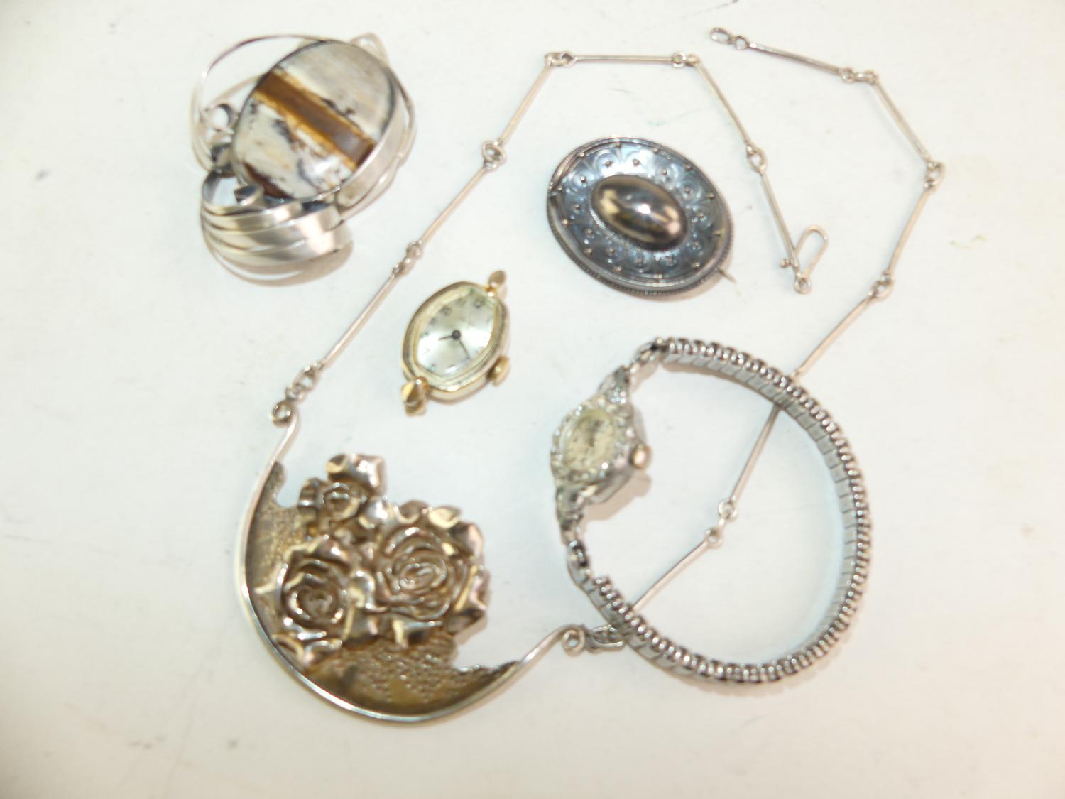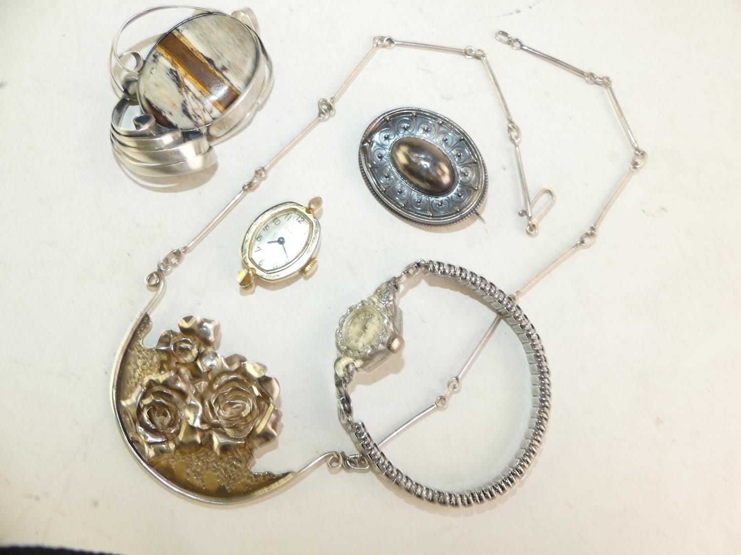 silver necklace, pendant brooch with two vintage ladies watches